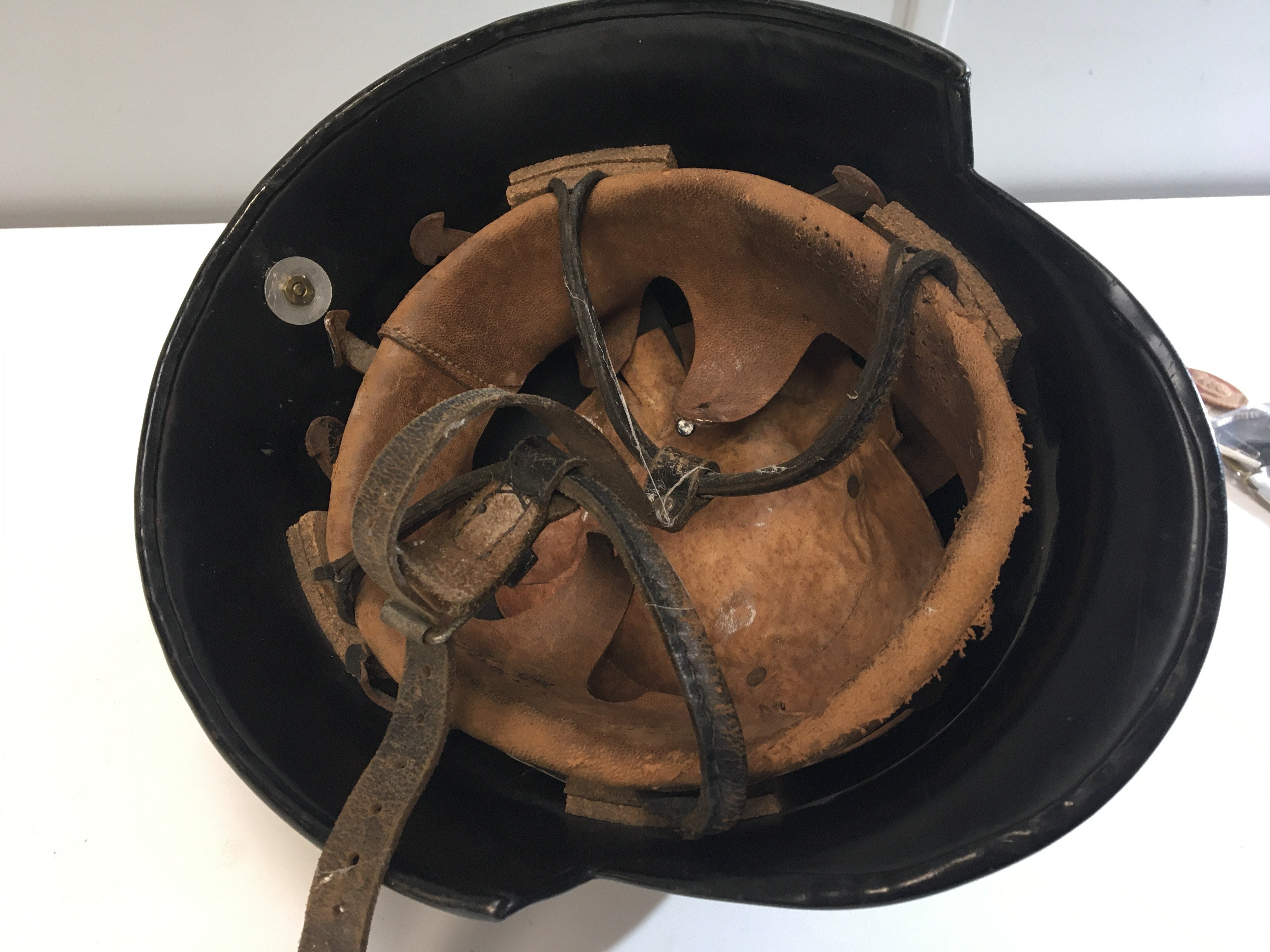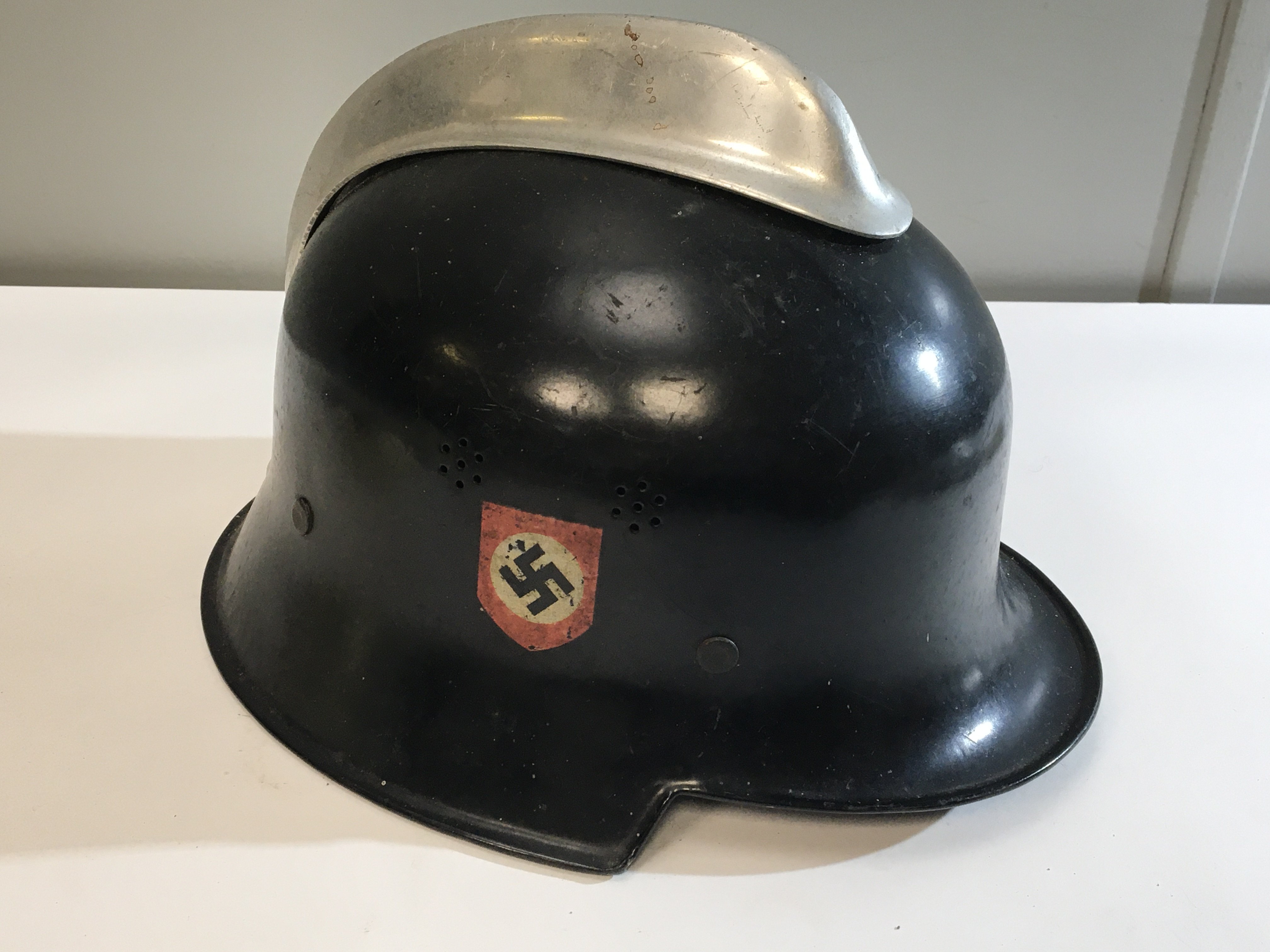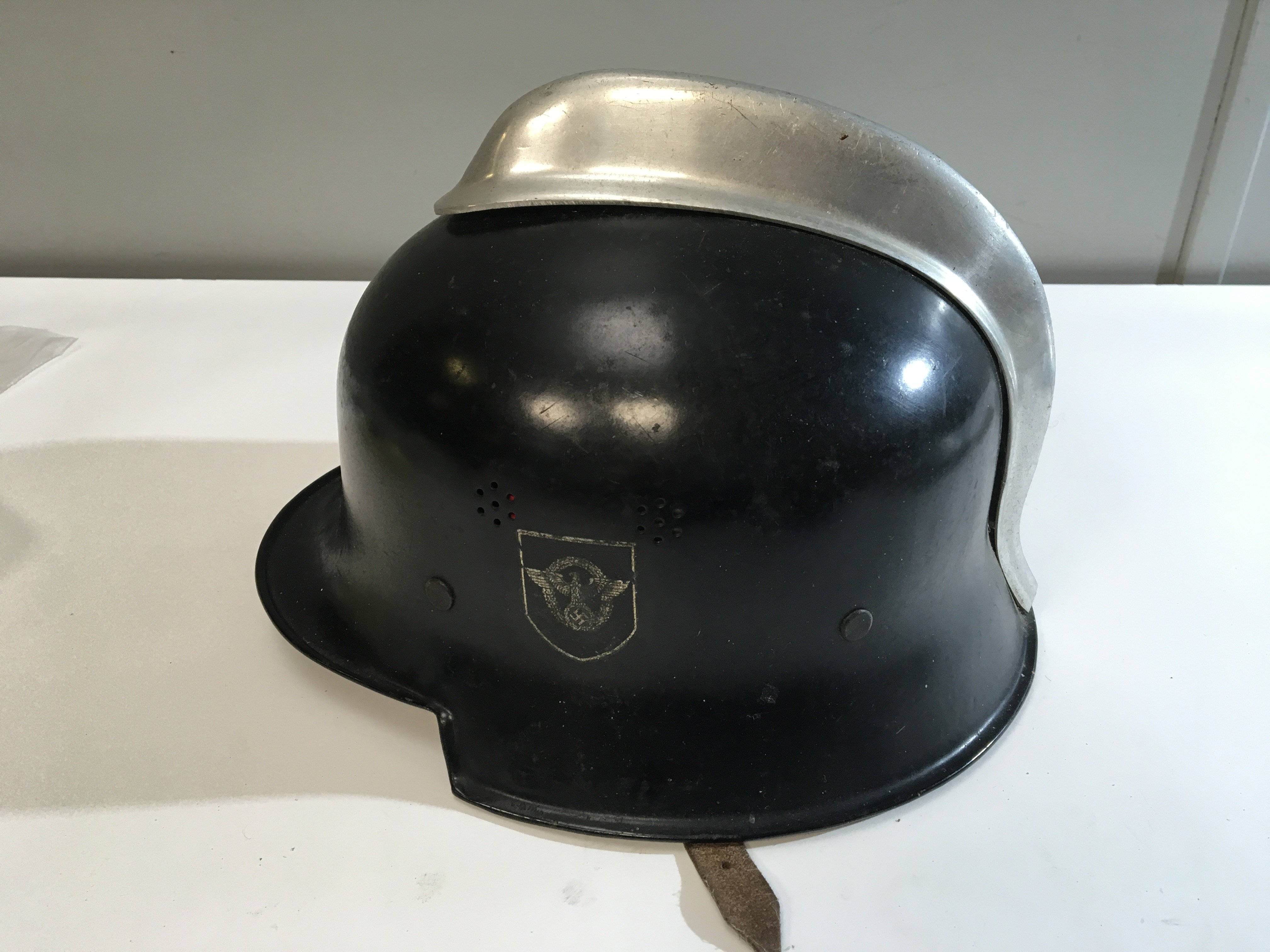 A German Third Reich firemans Steel helmet double decal side with applied aluminium comb leather lined.