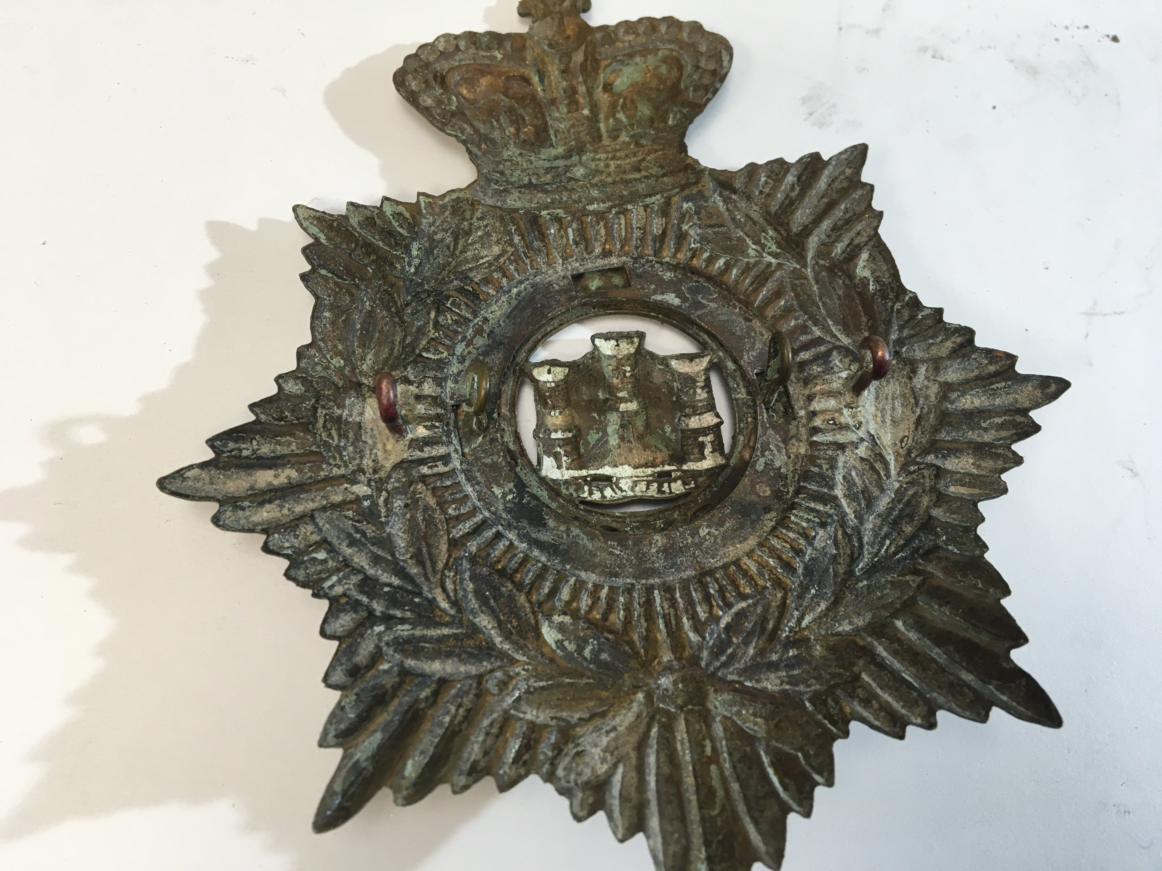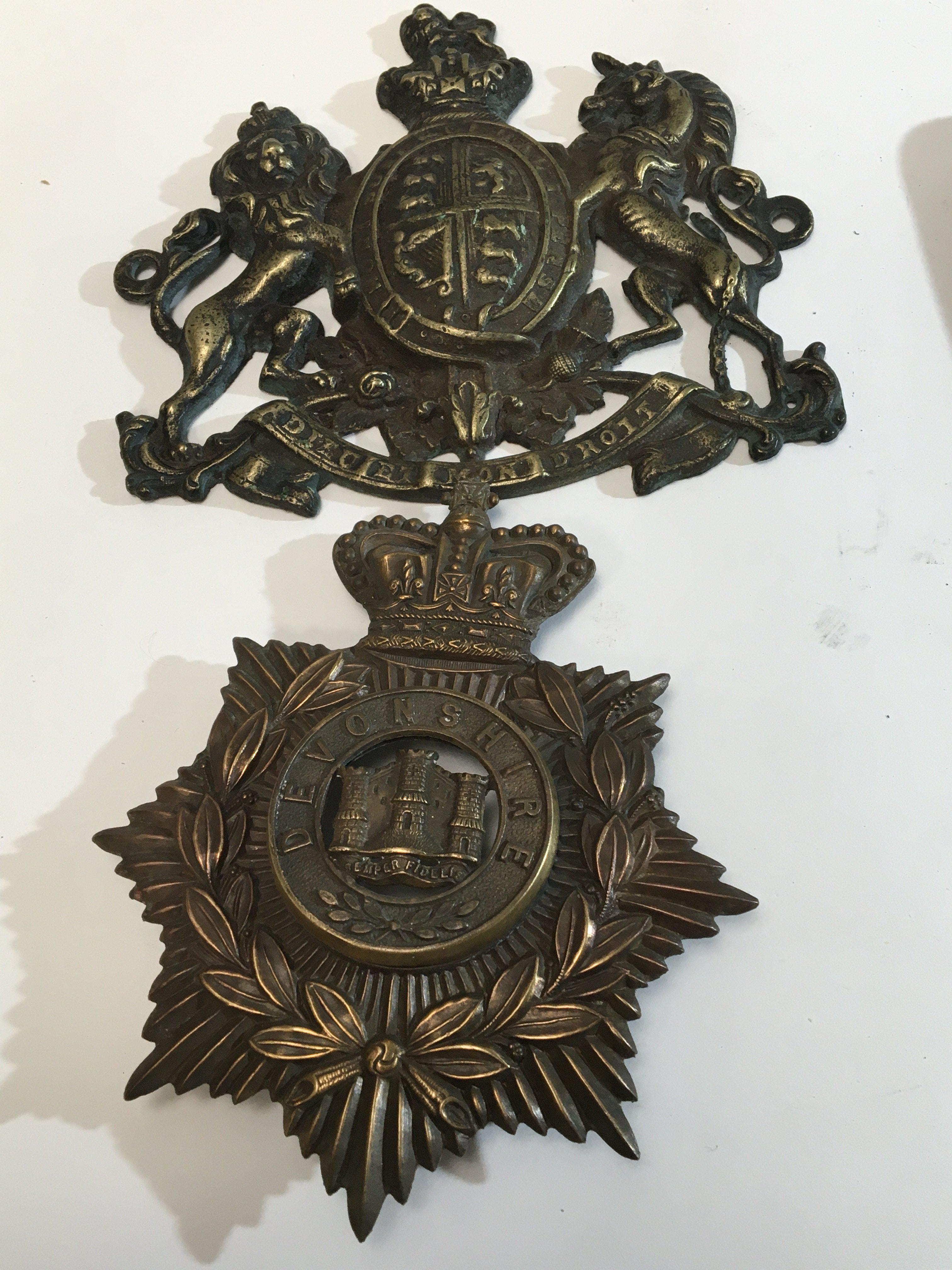 A Devonshire Regiment Shako plate and a brass Royal Coat of Arms. (2)