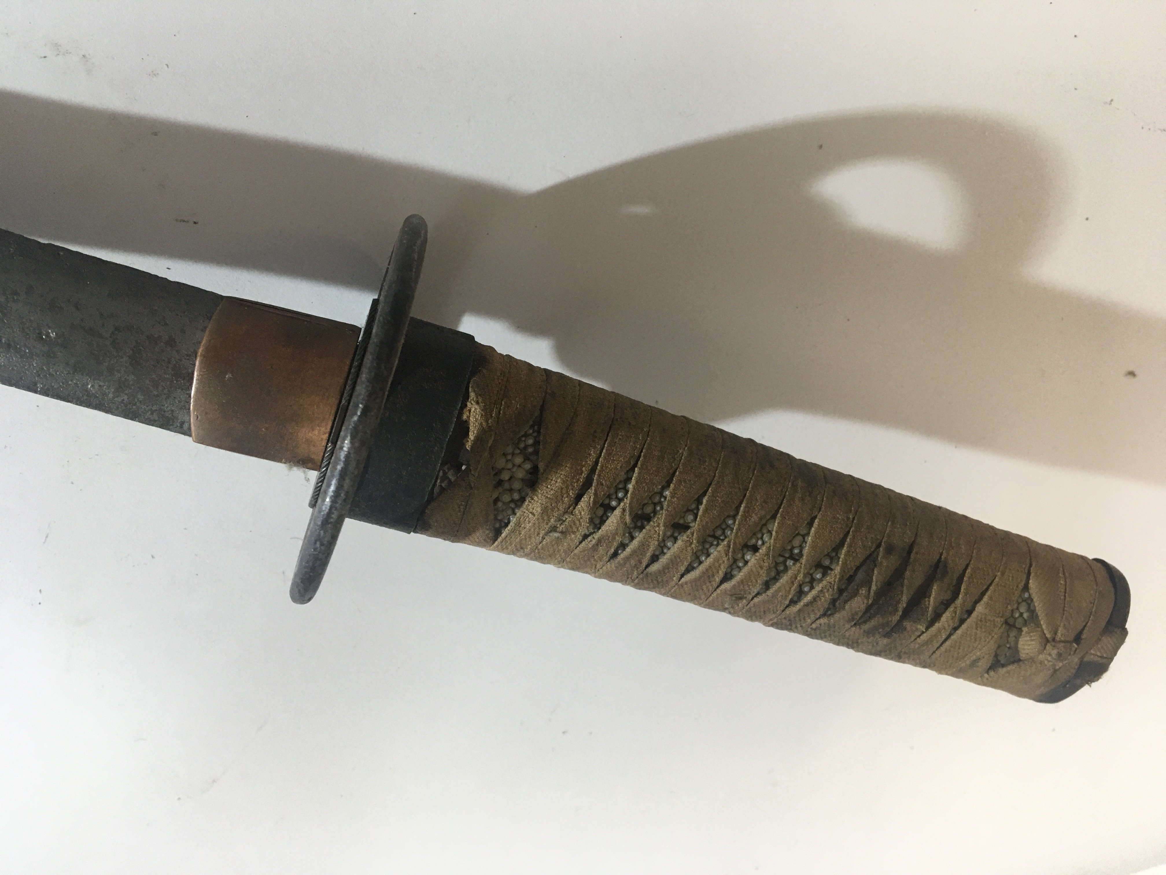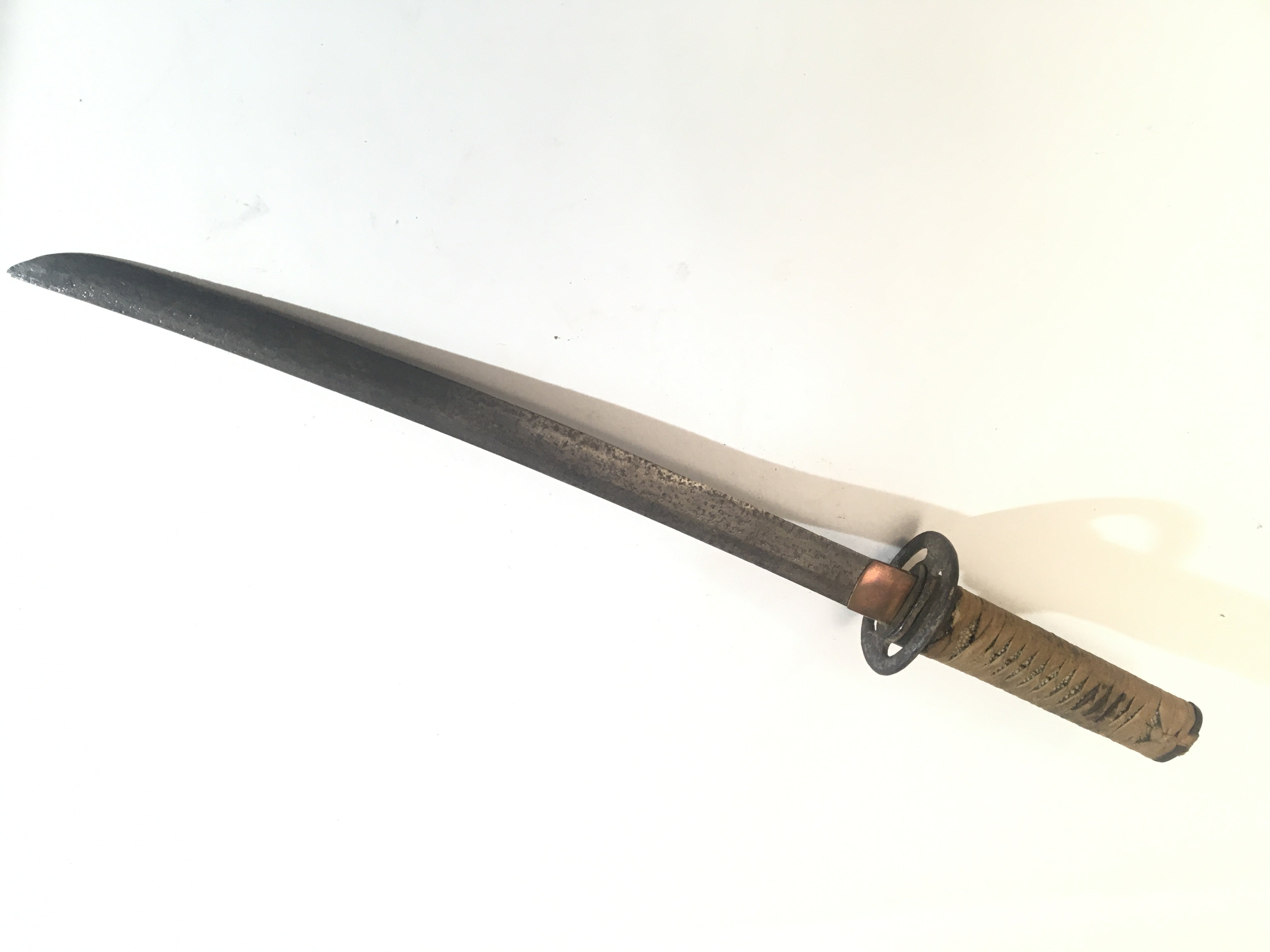 A 19th Century Japanese Tanto sword steel blade bound shagreen grip. No scabbard the blade pitted.