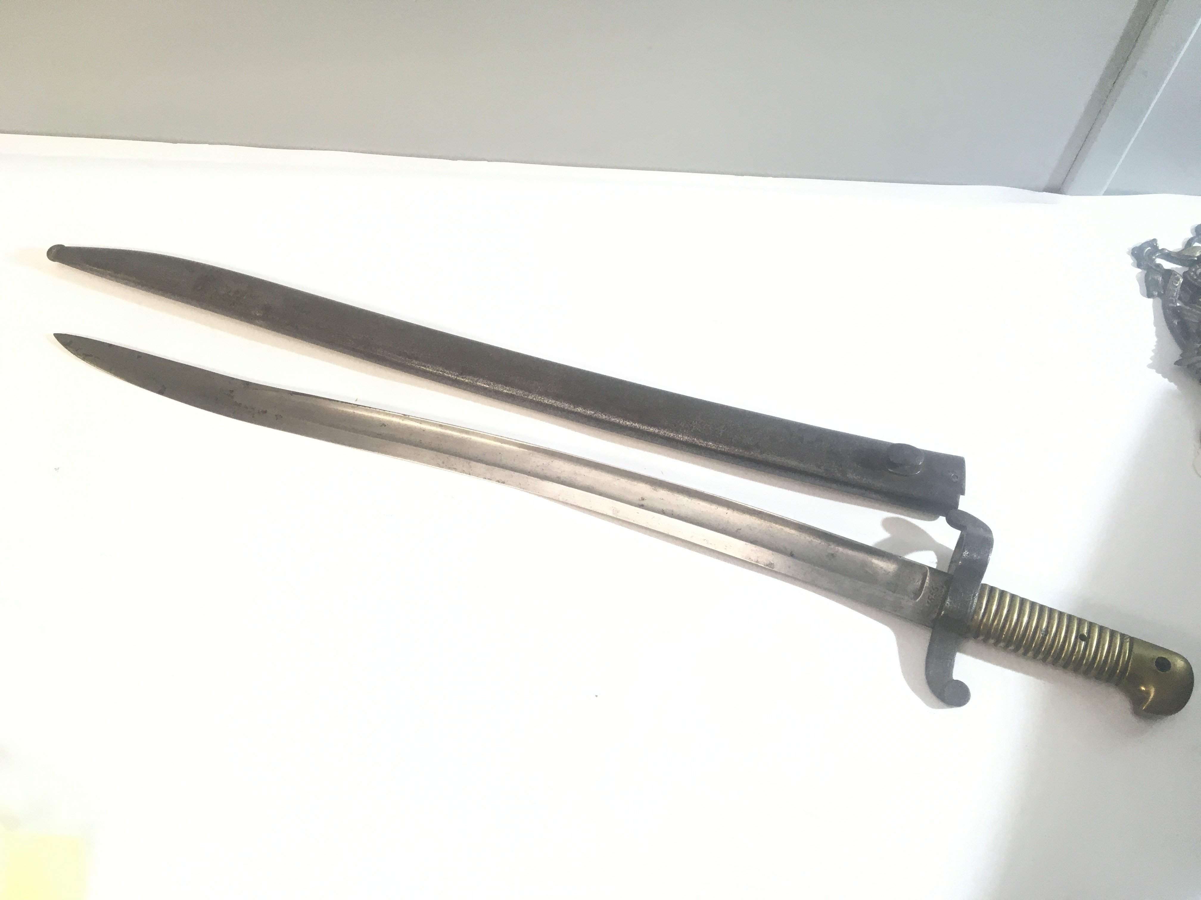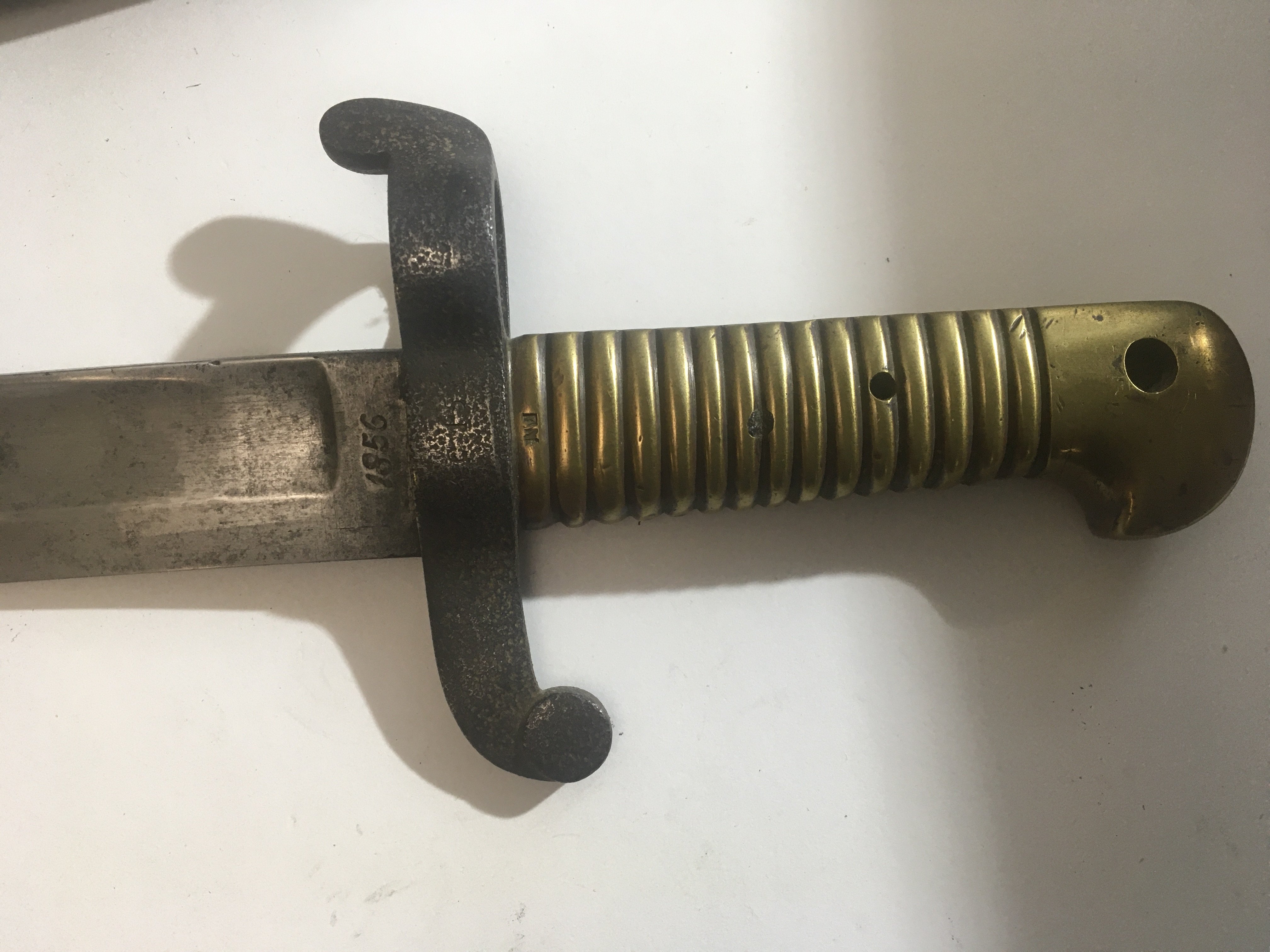 A French 1856 pattern bayonet stamped 1856 to the steel Yataghan blade brass grip and steel scabbard.