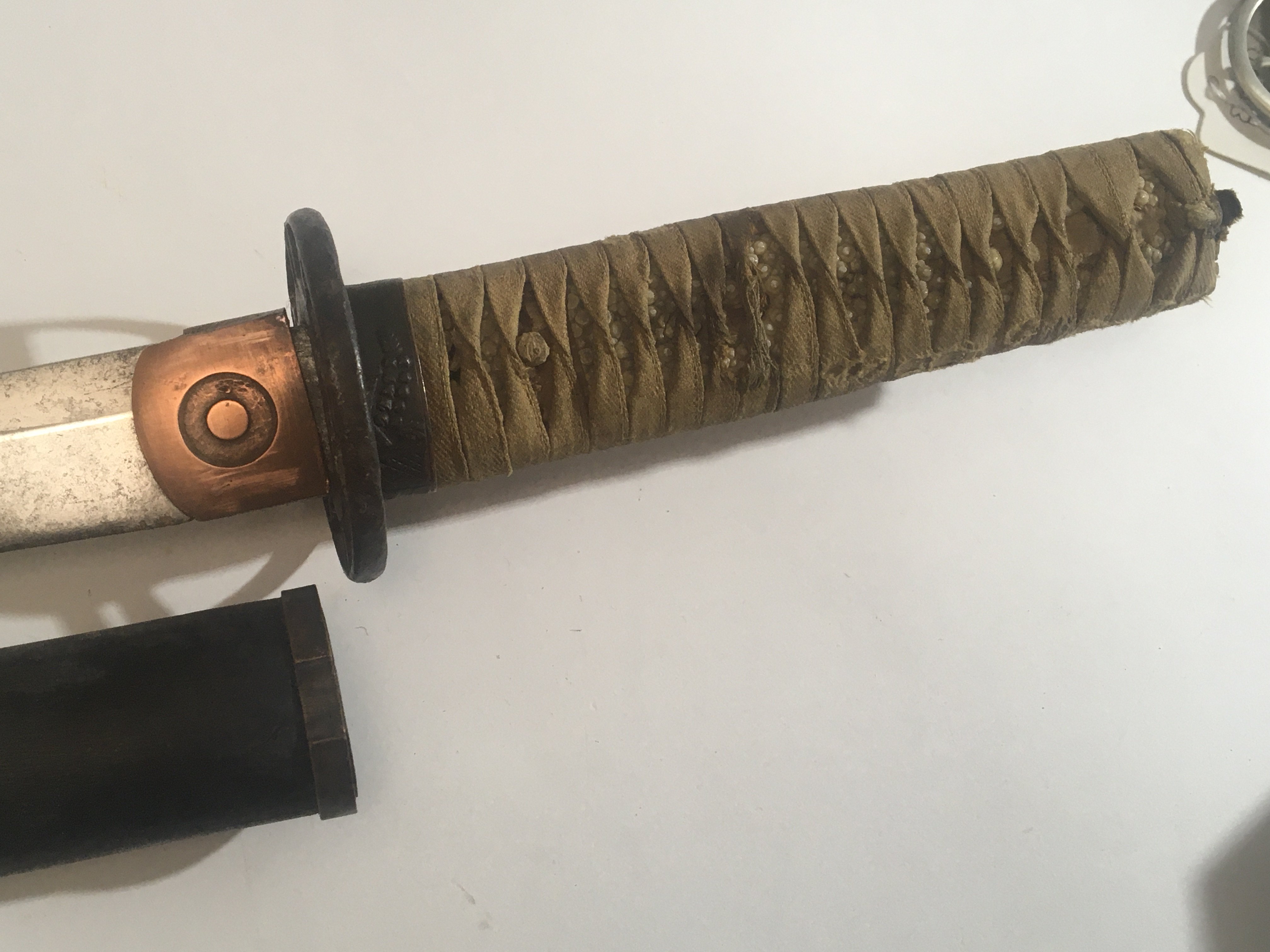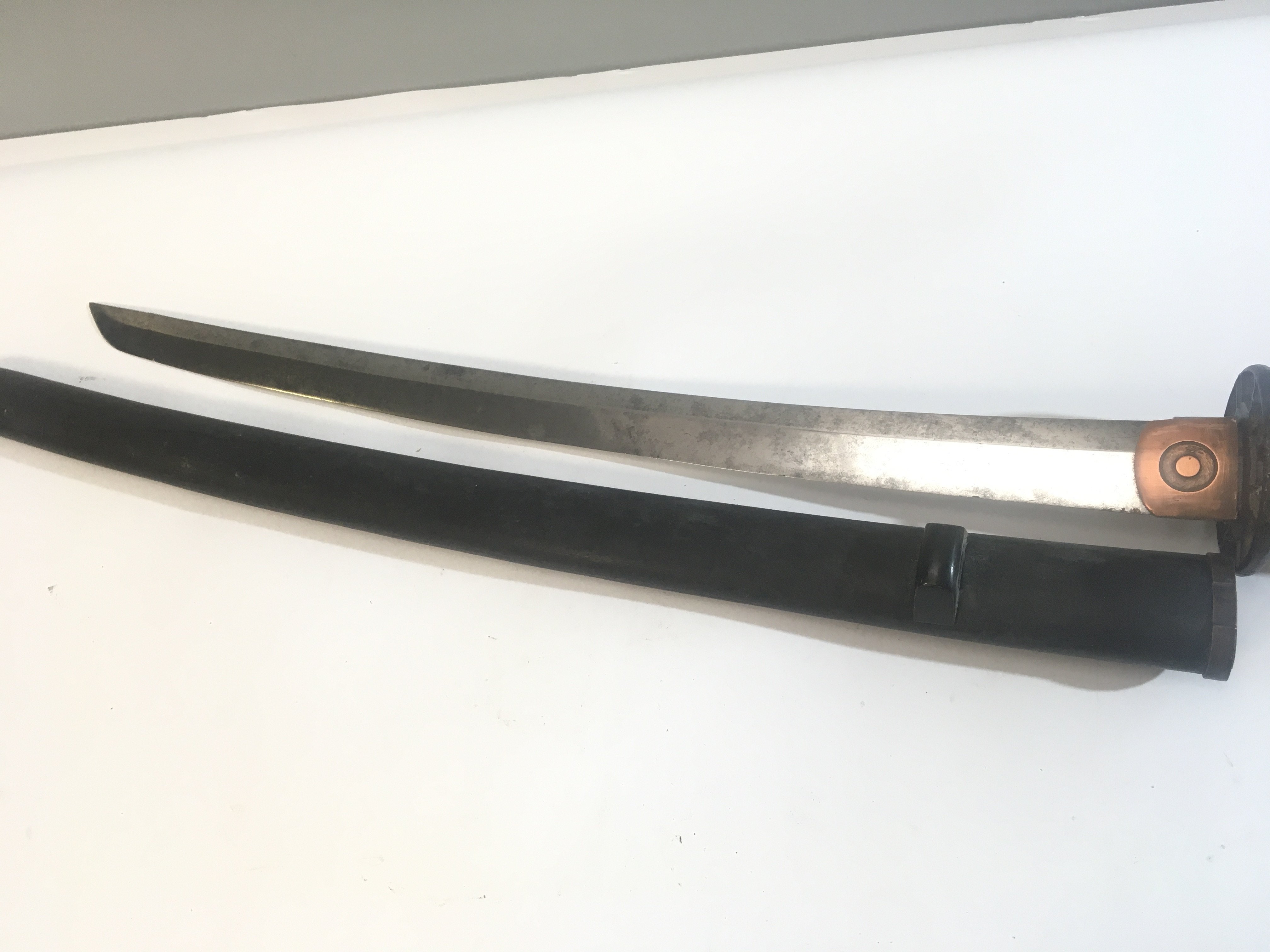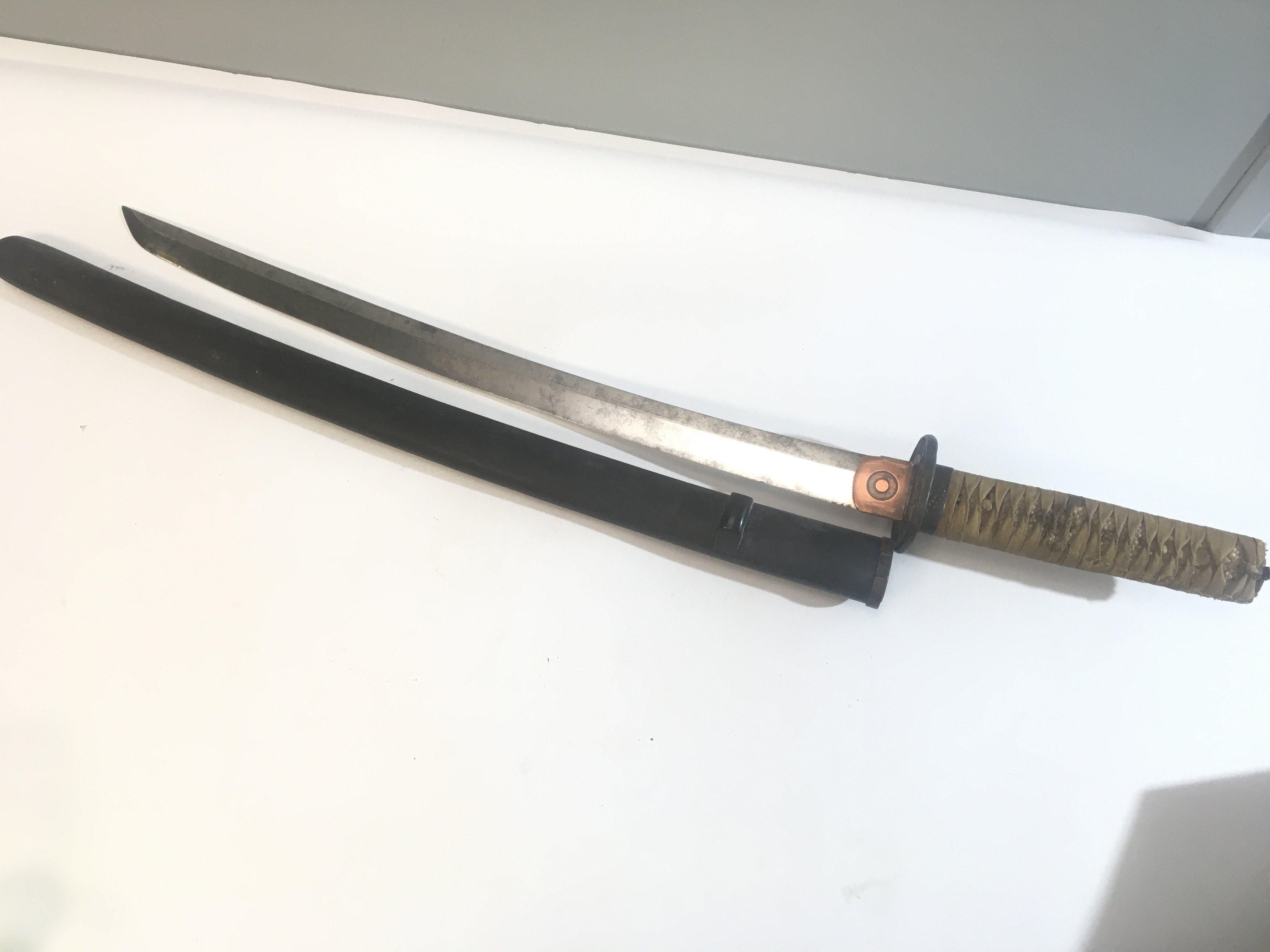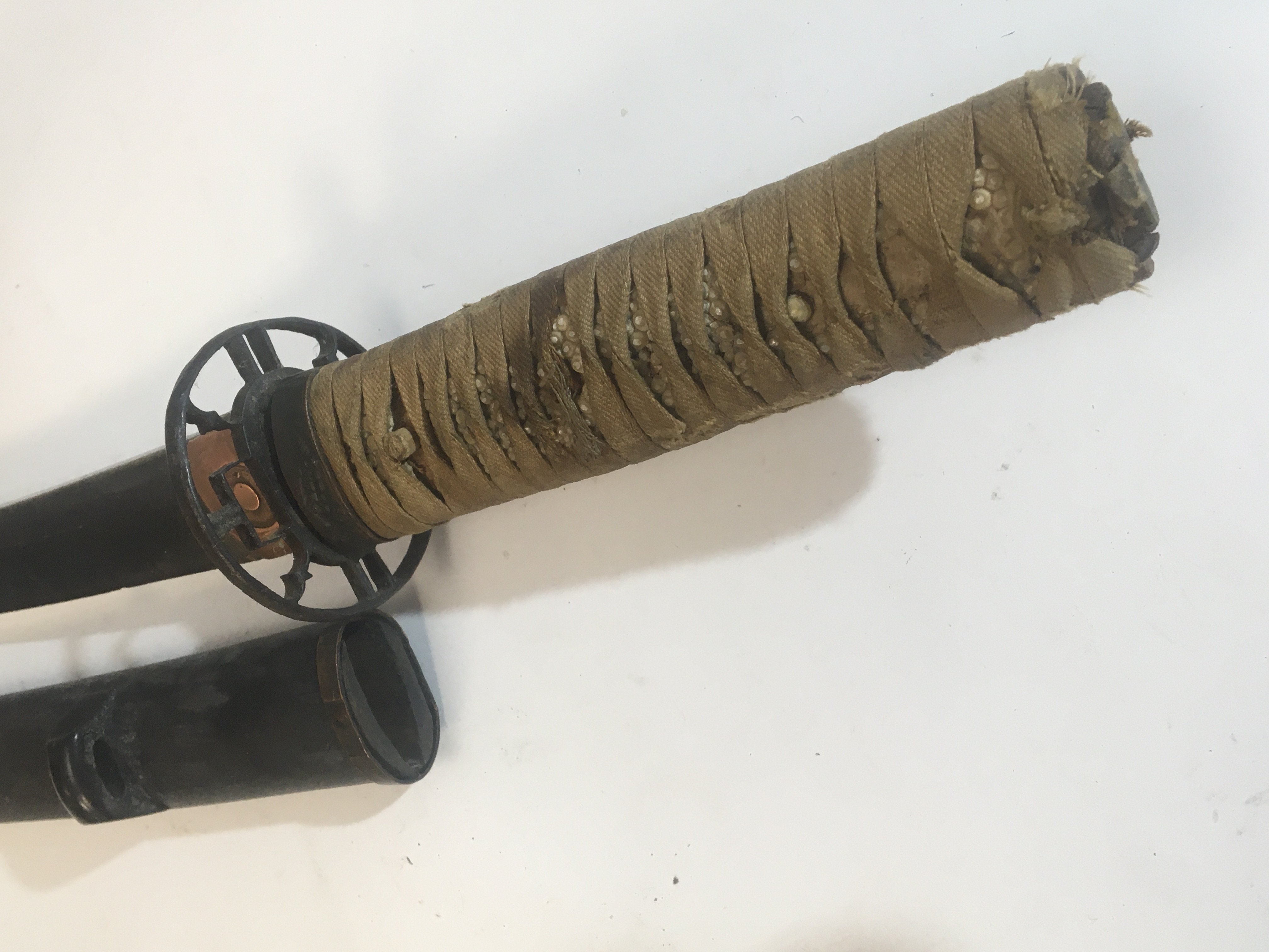 A Japanese Tanto sword with a shagreen grip woven with cloth steel blade and wood scabbard and open steel Tusuba of late Edo period design.