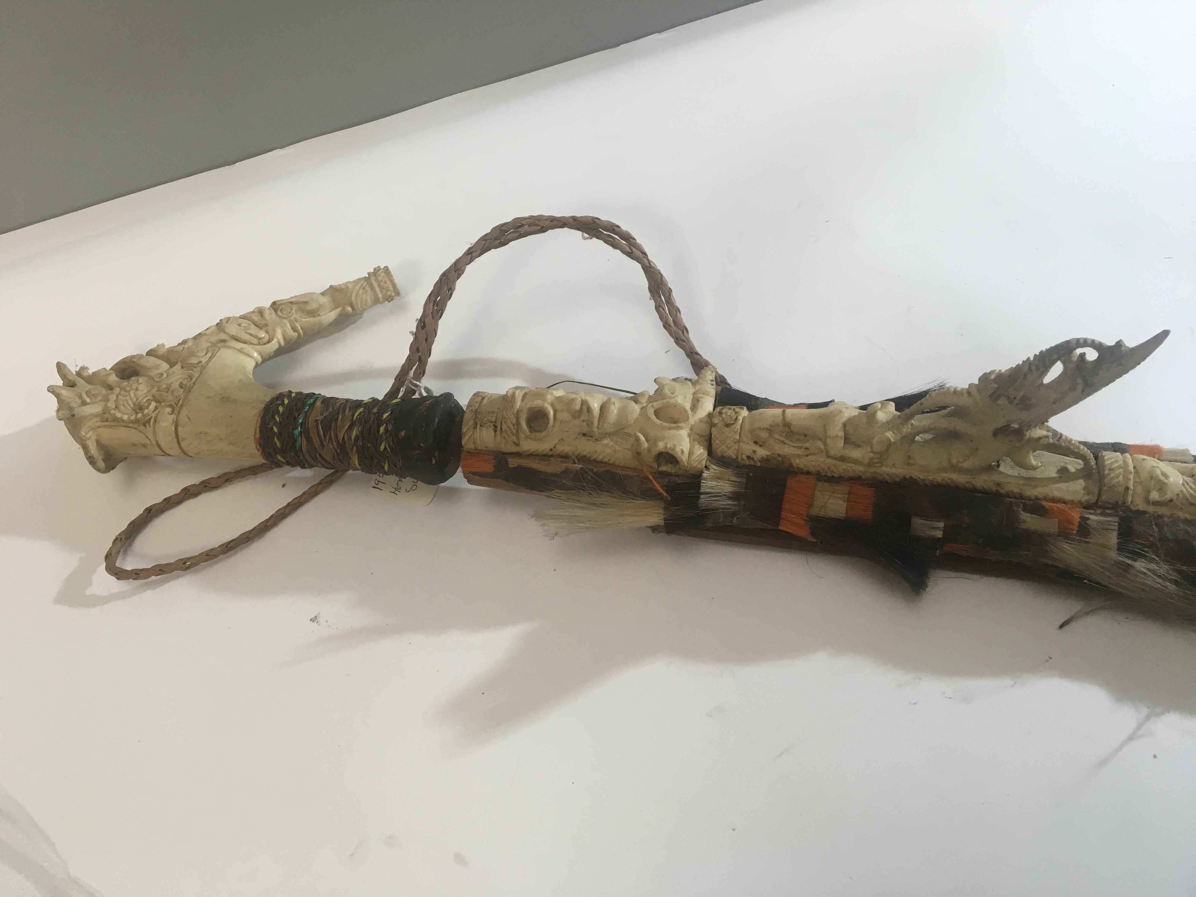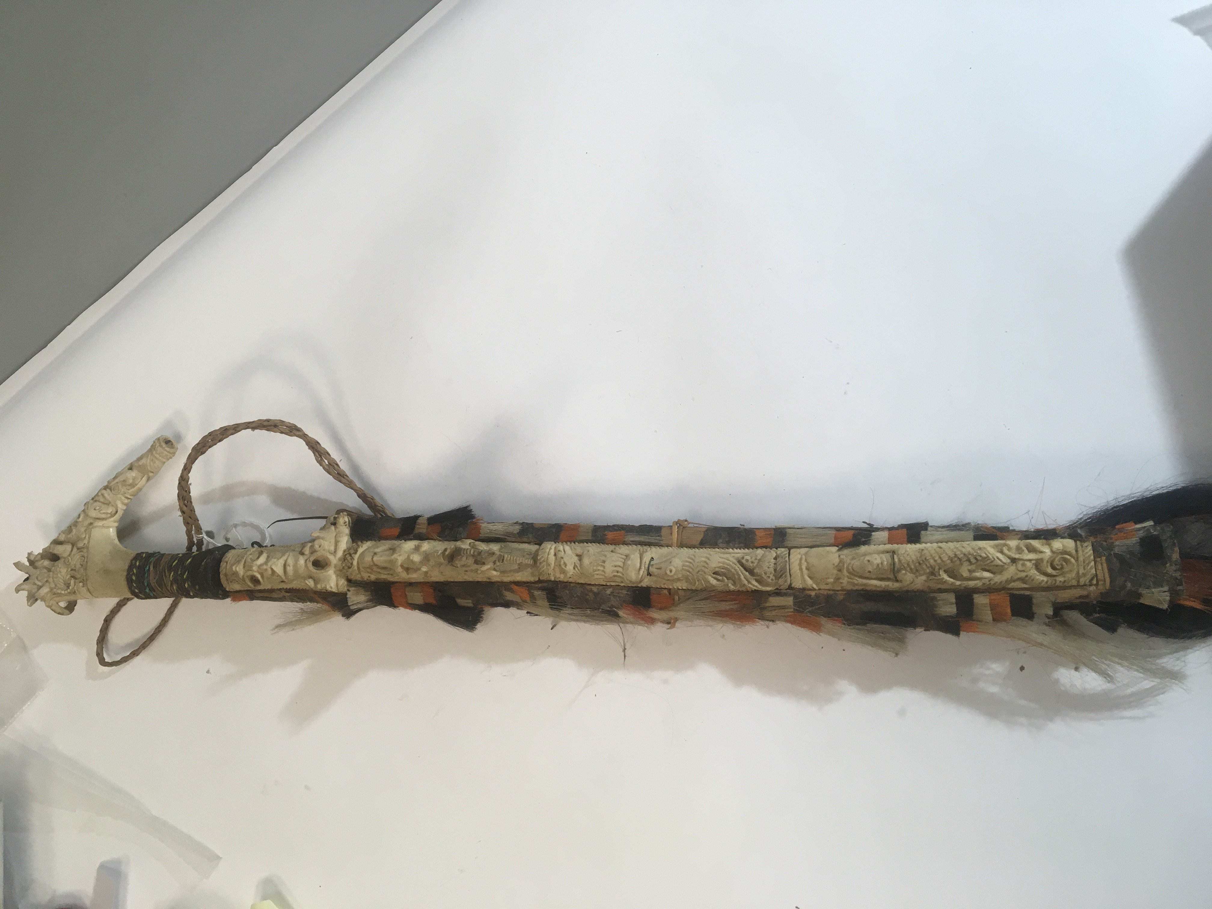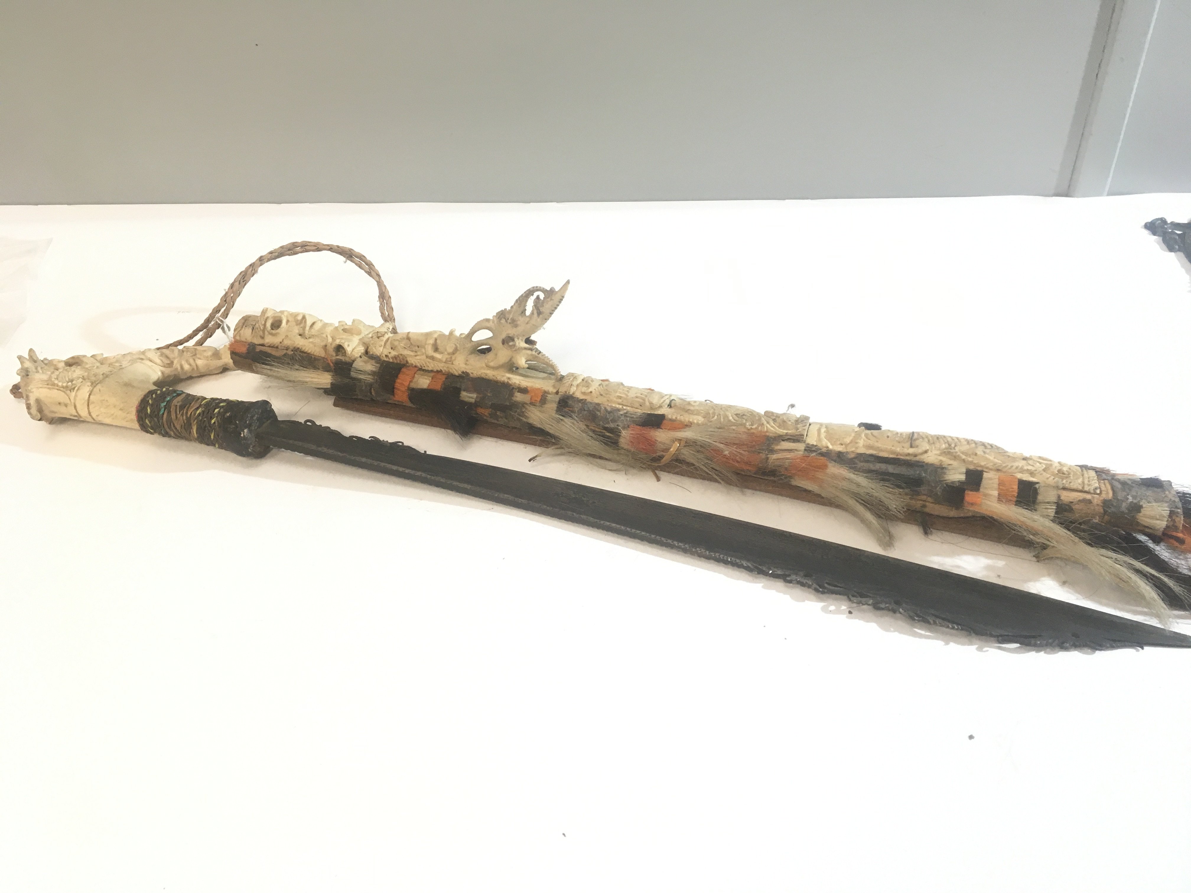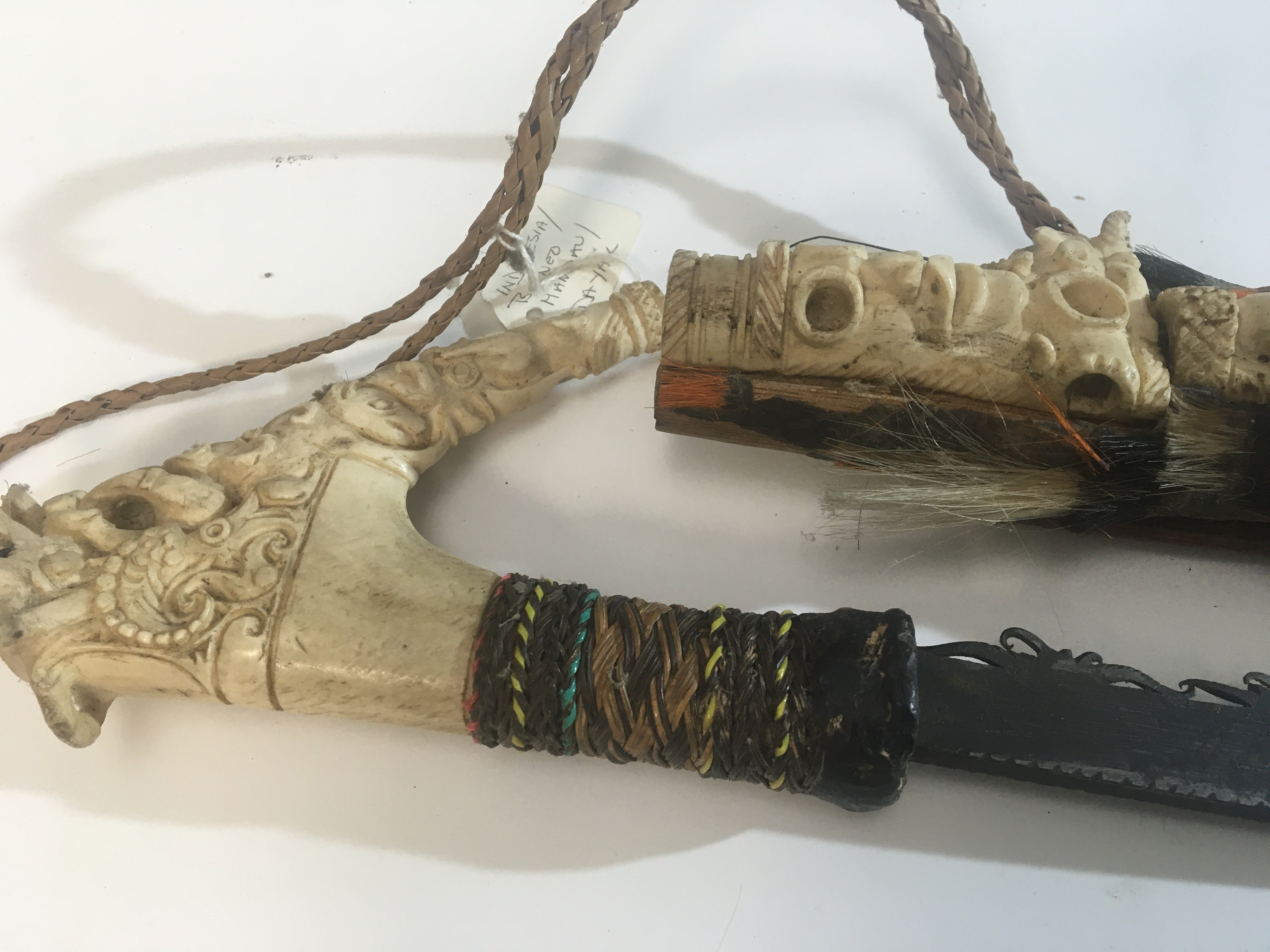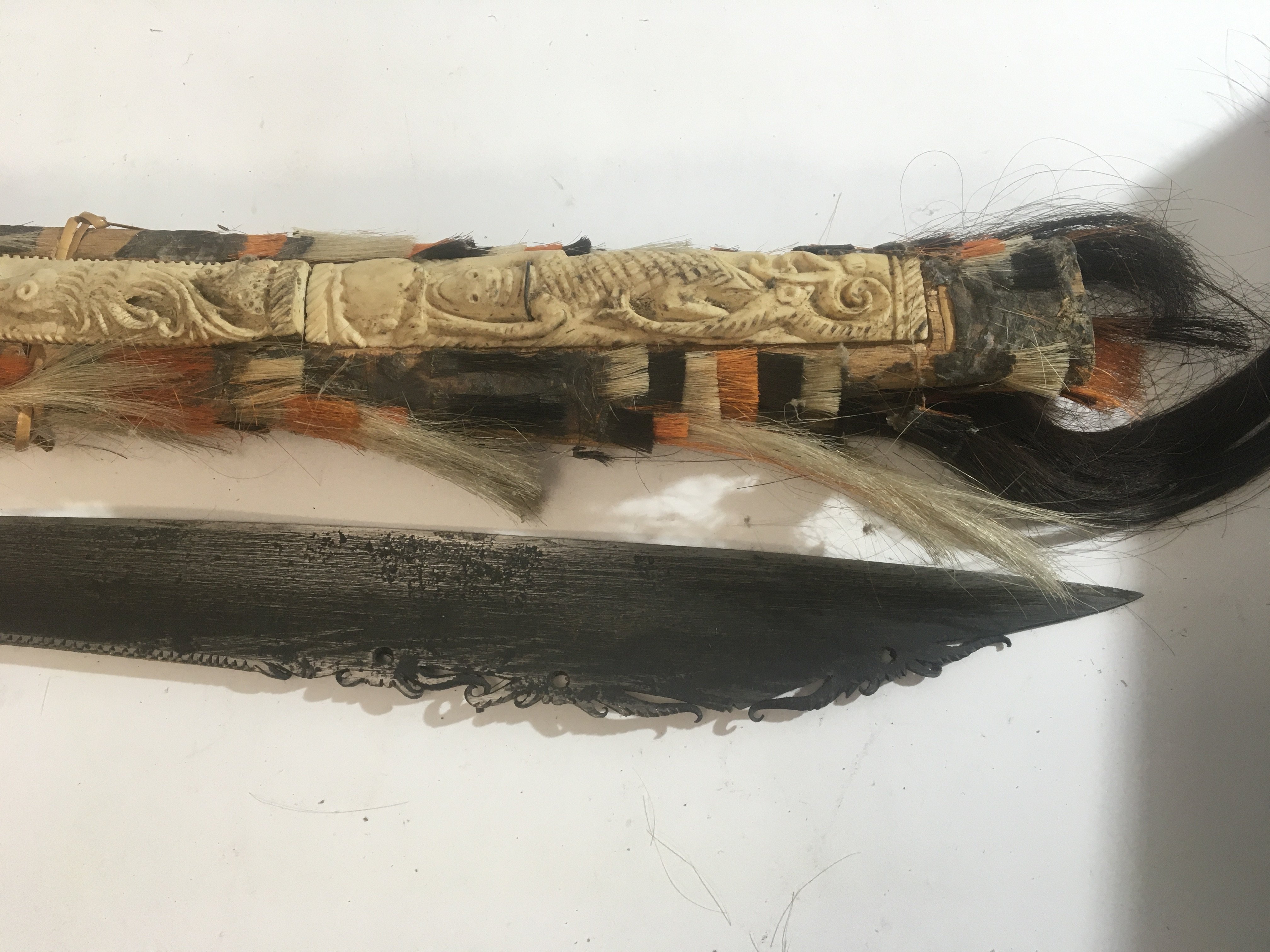 An Exceptional example of a Head Hunters Mandau sword Borneo. The grip of carved bone with further raised carved bone with heads and lizards with tassel of human and coloured hair attached. With a shaped steel blade. 19th century.