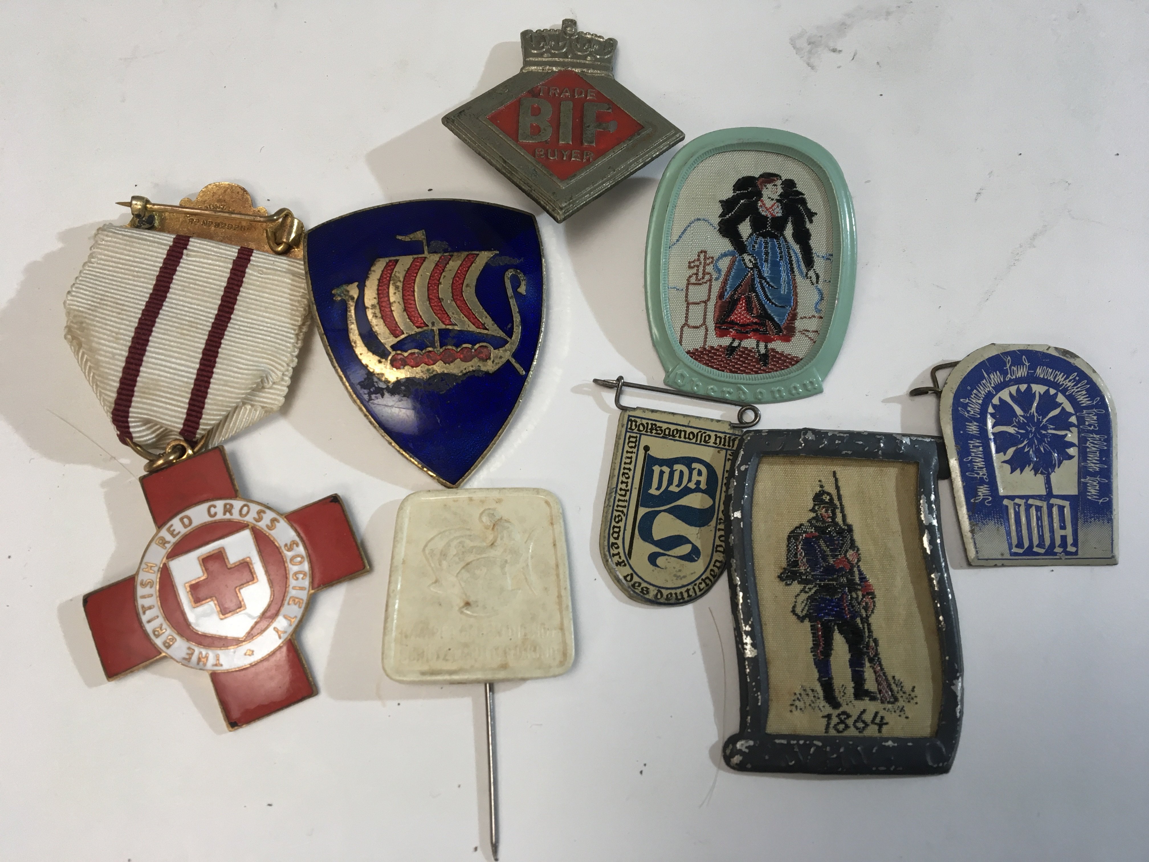 A collection of Badges including a British BIF trade buyers badge numbered back A32276 rare badge a British Red Cross medal awrded to 39390 NH Rouse. and other mid 20th century badges.