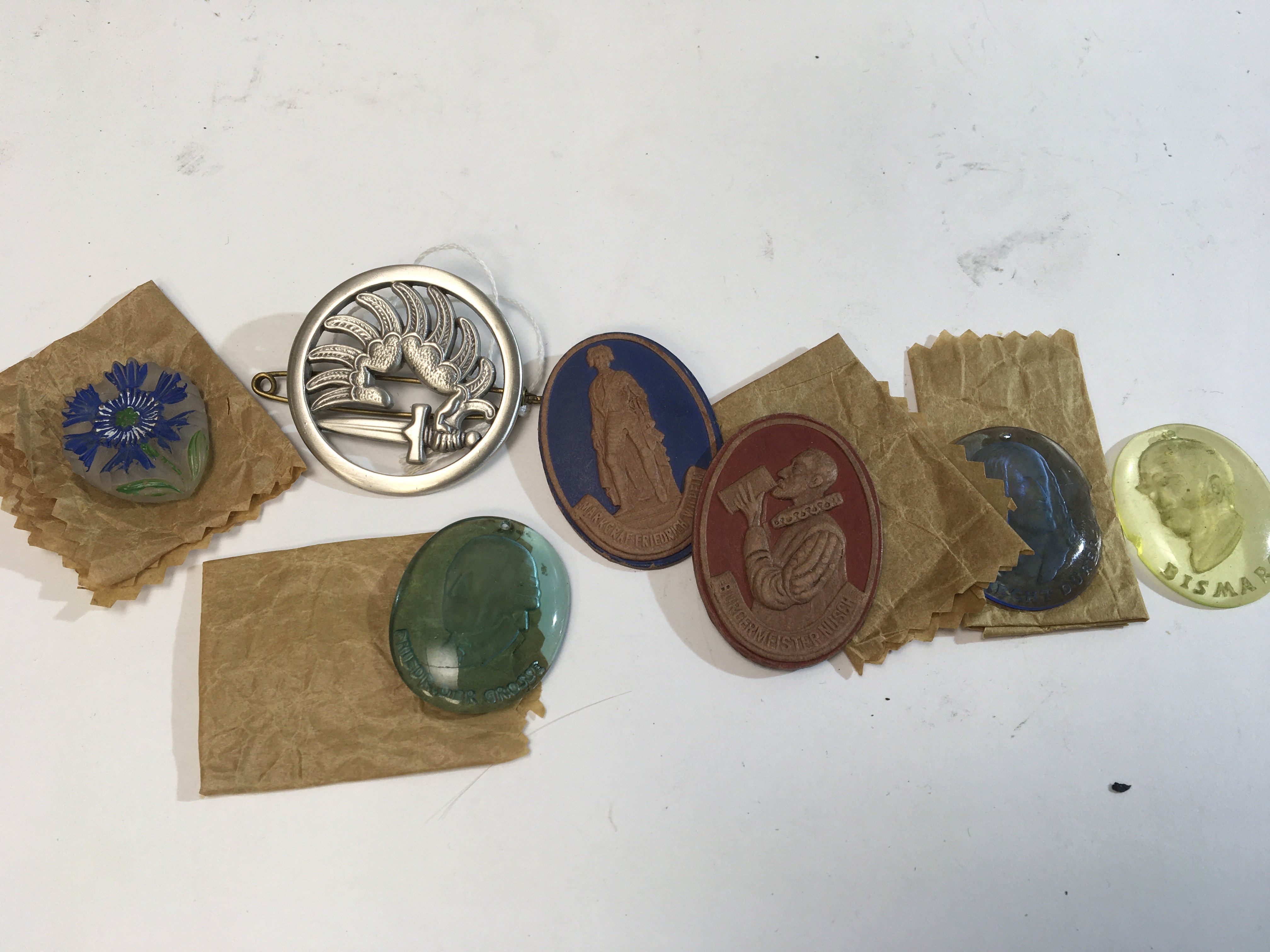 A Military badge possible French Foreign Legion. Glass intaglio and other badges.