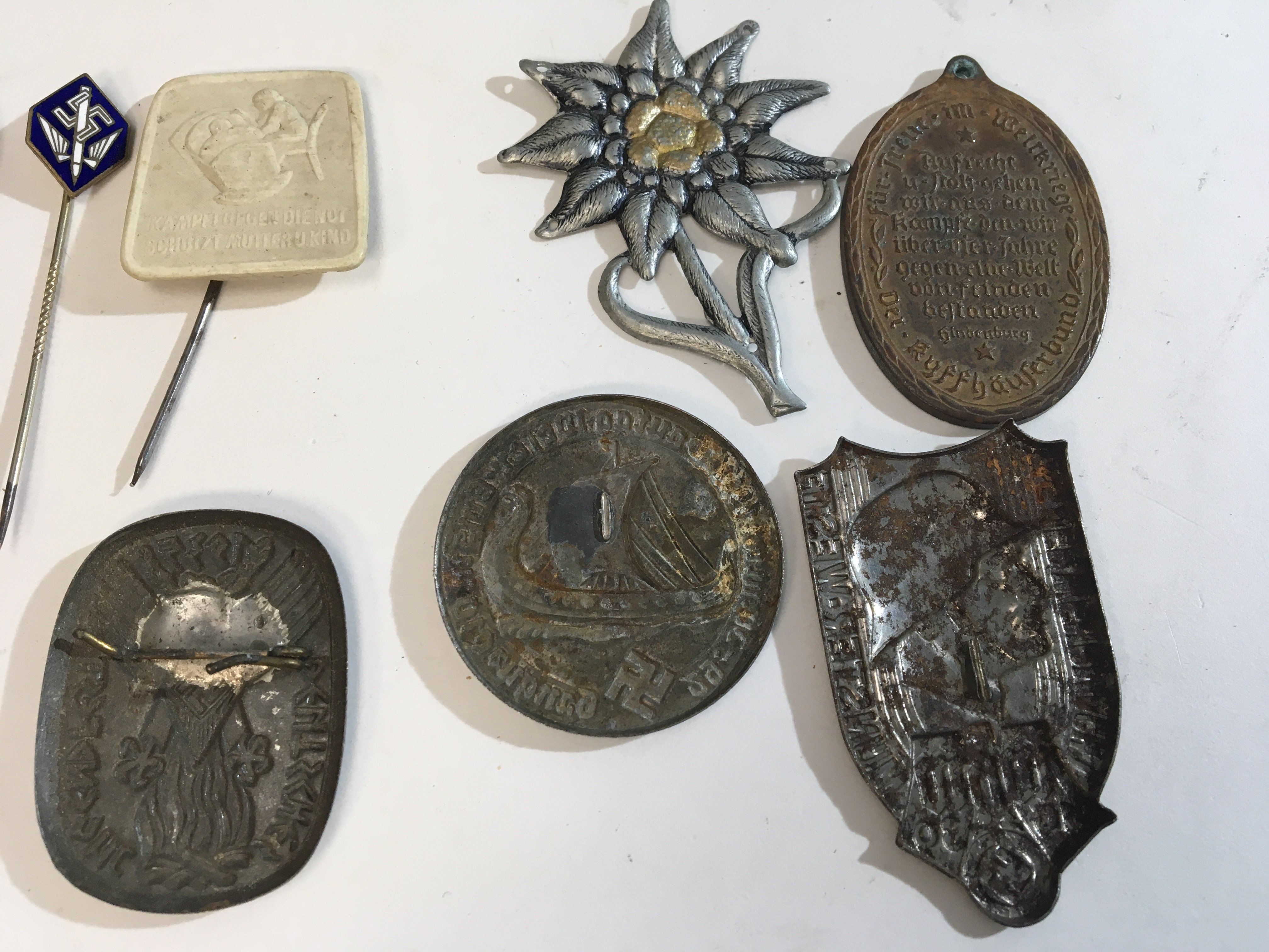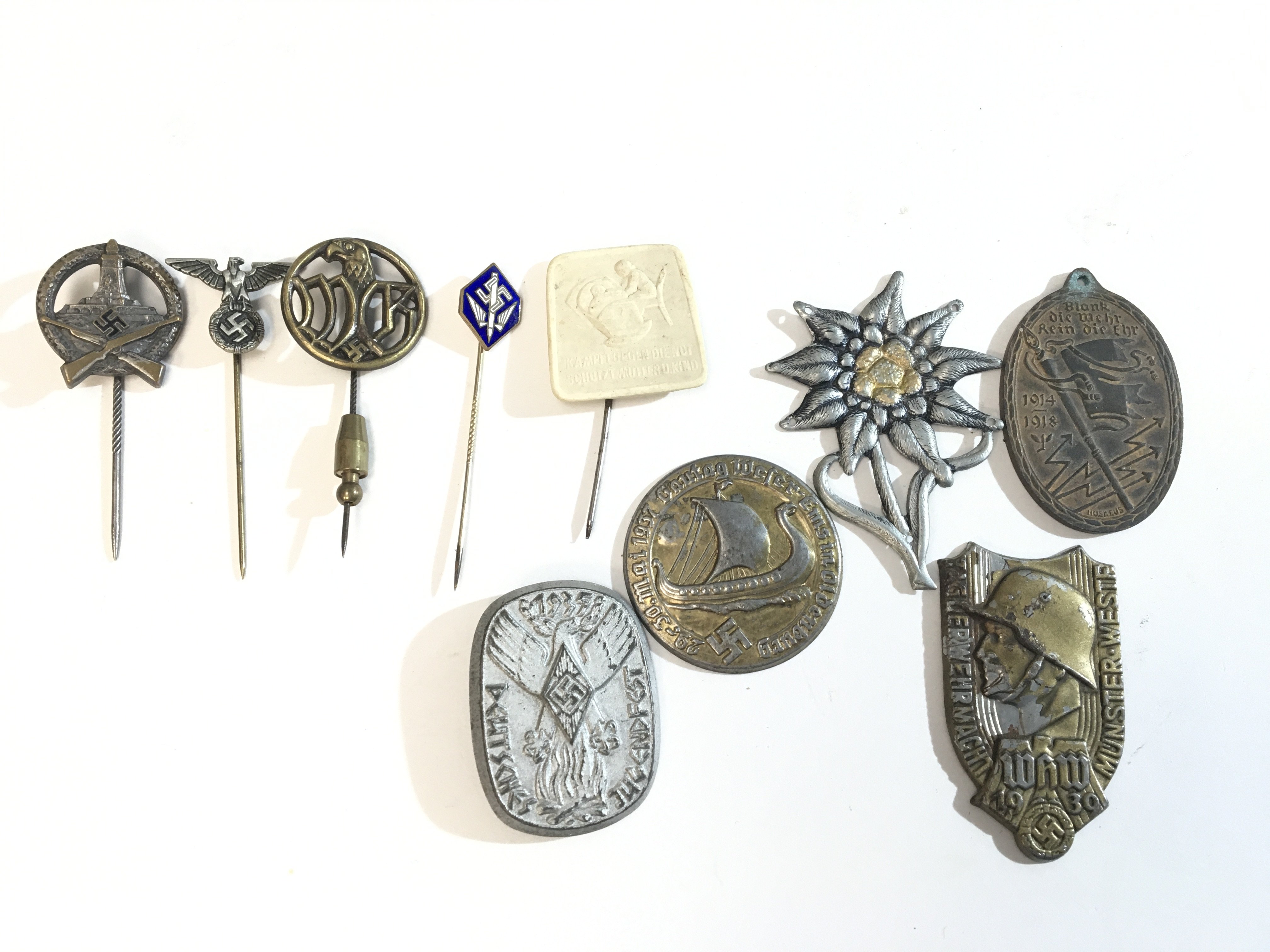 A collection of German Third Reich stick pins including an enamel Luftwaffe stick pin a Hitler Youth badge a First World War German Medallion and other badges and pins.