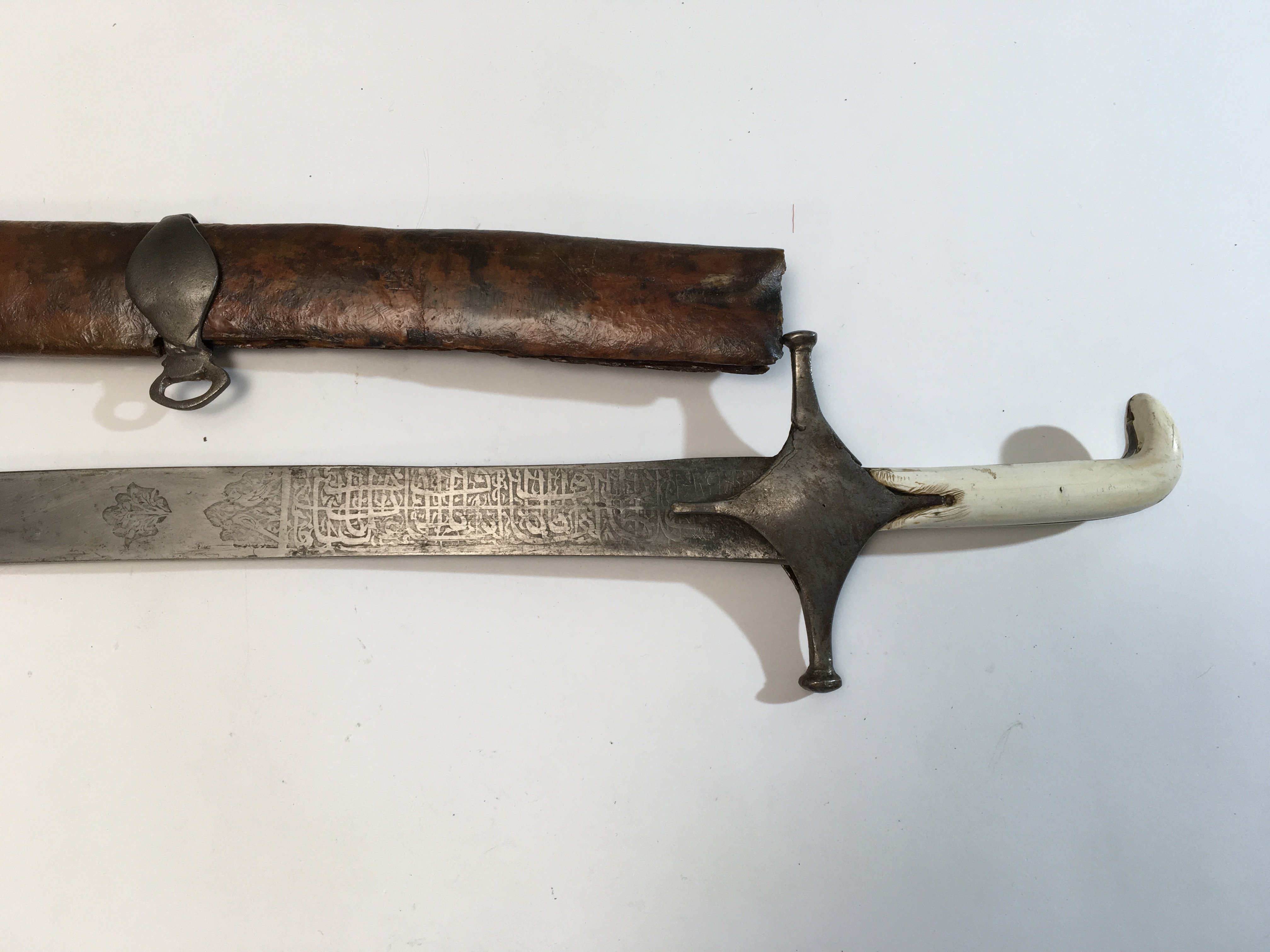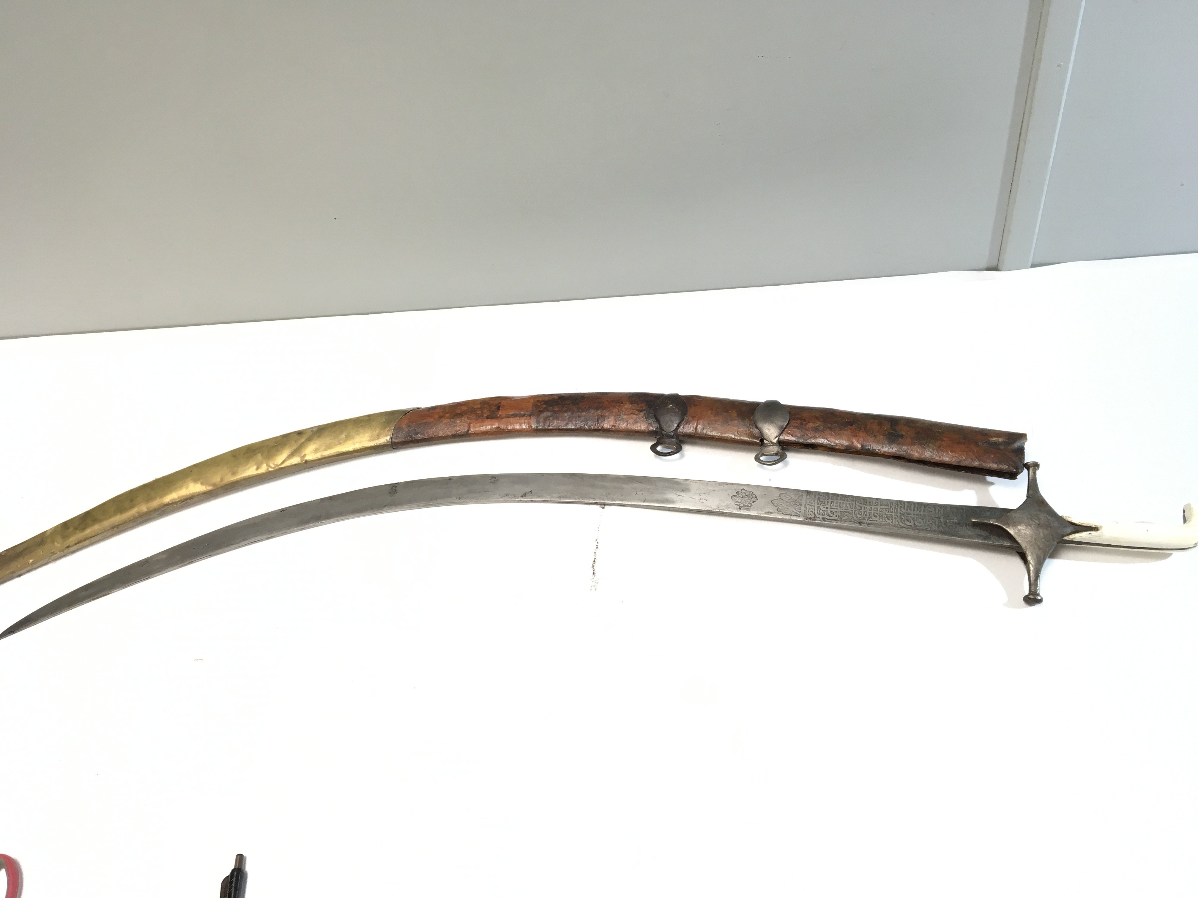 A 19th Century Ottoman Mameluk Ottoman sword with an etched still curved blade leather and brass scabbard handle grip replaced.