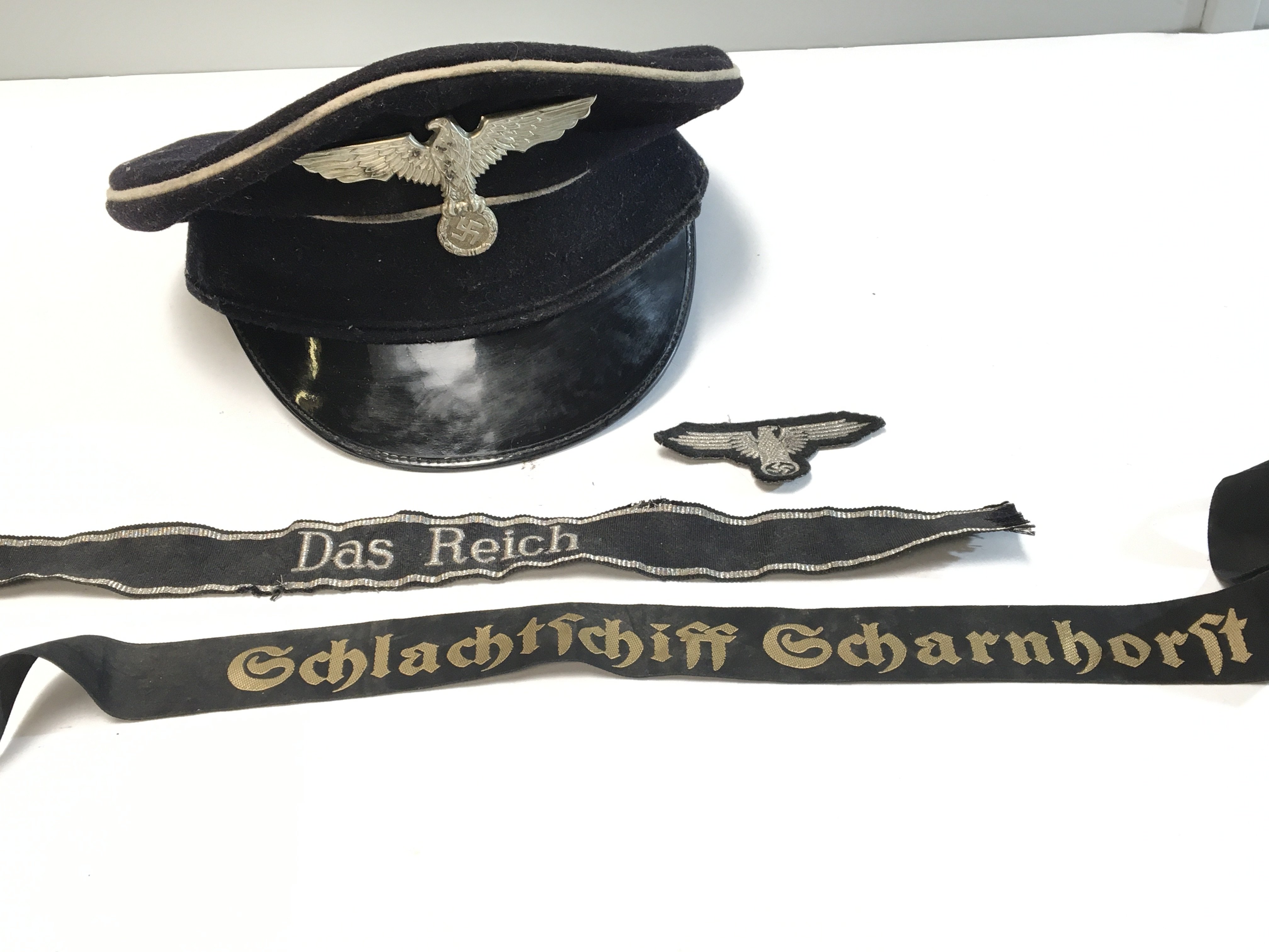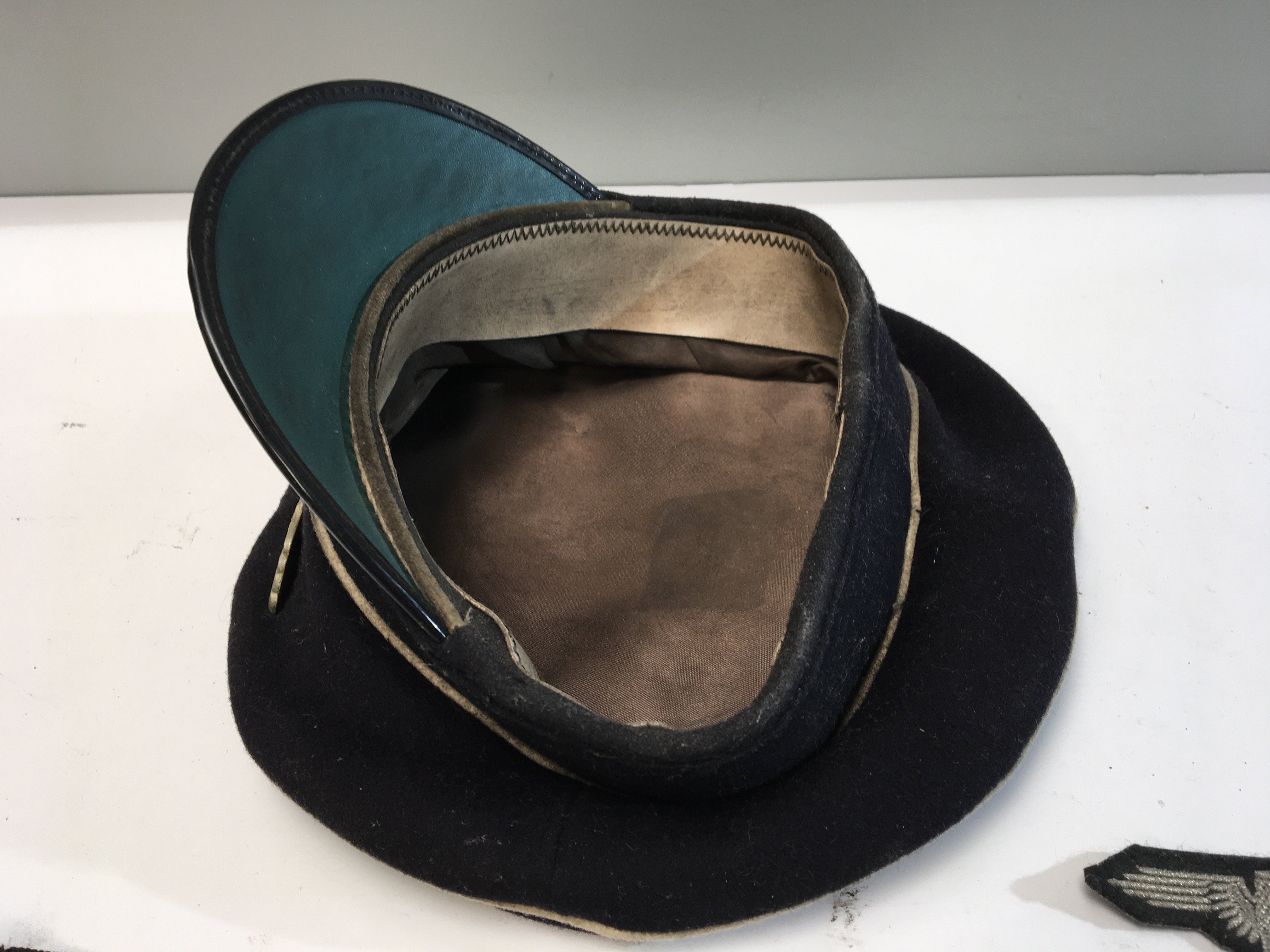 A German Third Reich II world war NCO hat with white piping two cap tallies and a cloth badge.