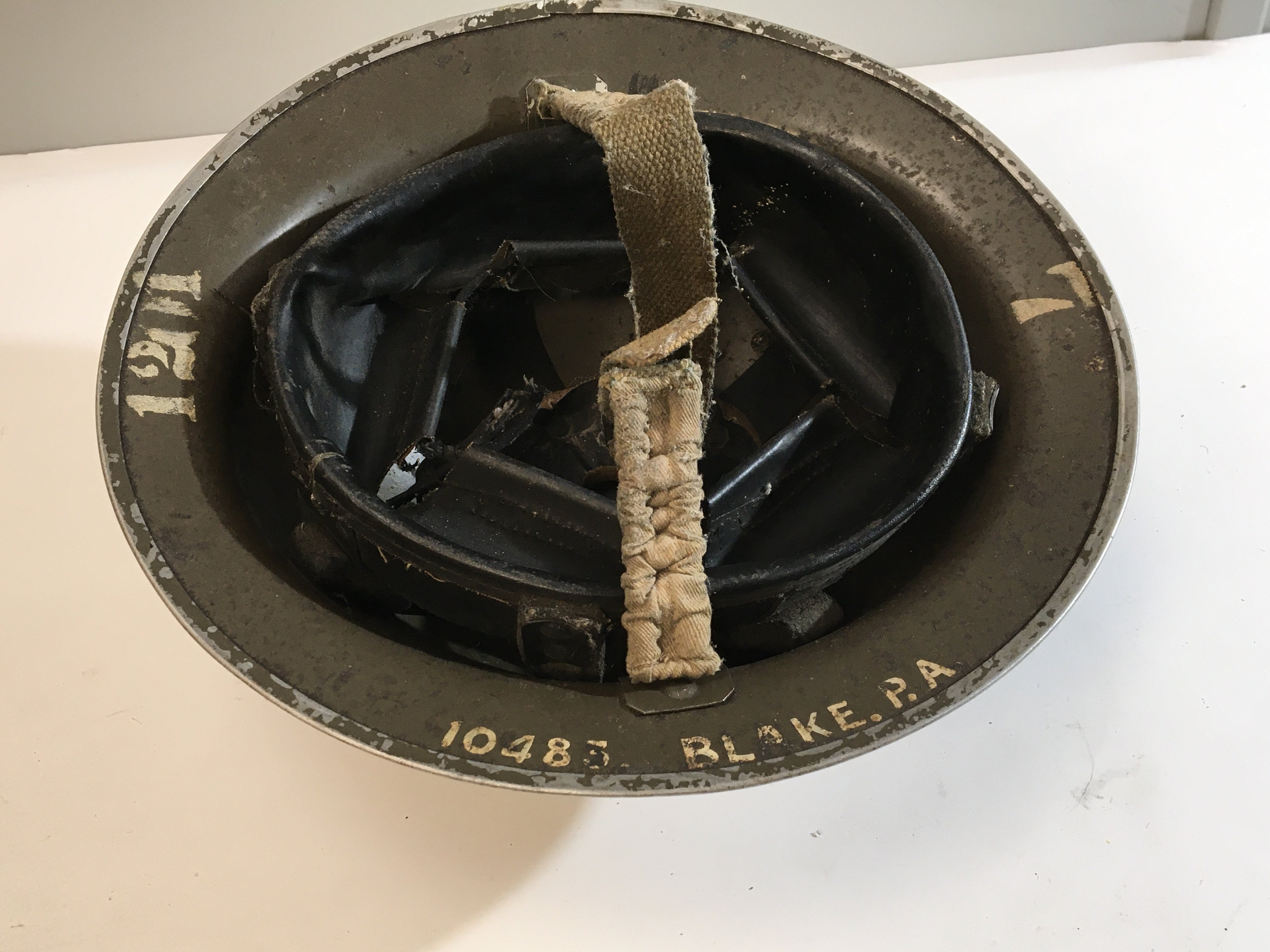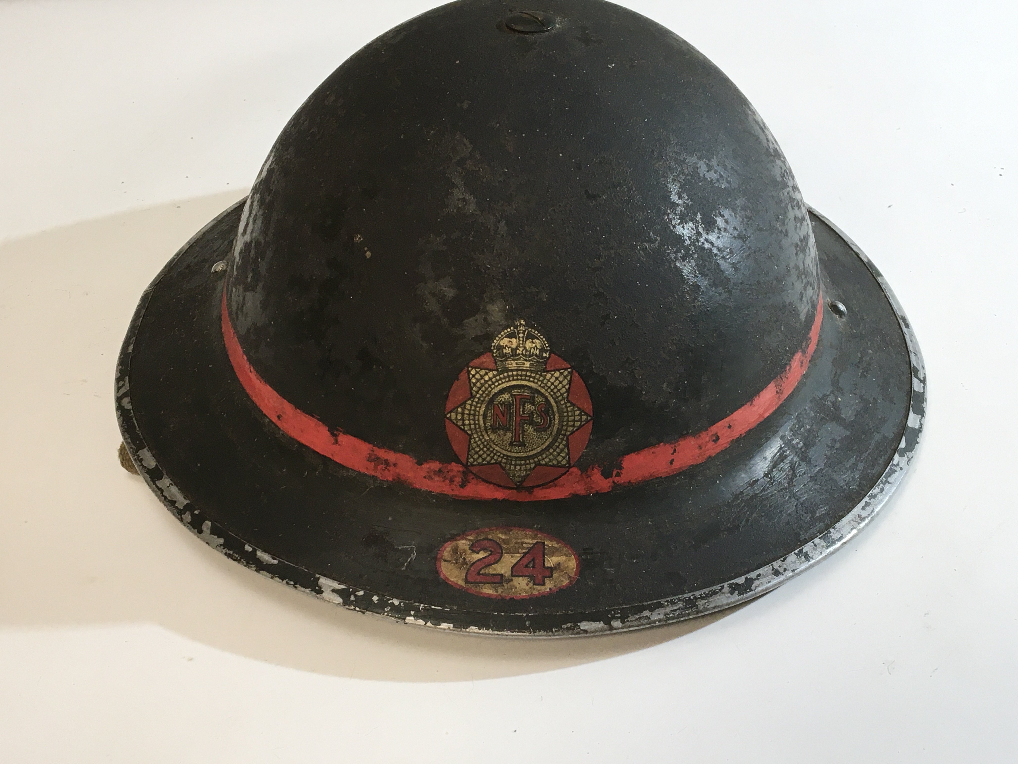 A II world War National Fire Service helmet 24th division Birmingham a good example with the firemans name and number painted on the inside rim retaining original liner and with makers stamp.