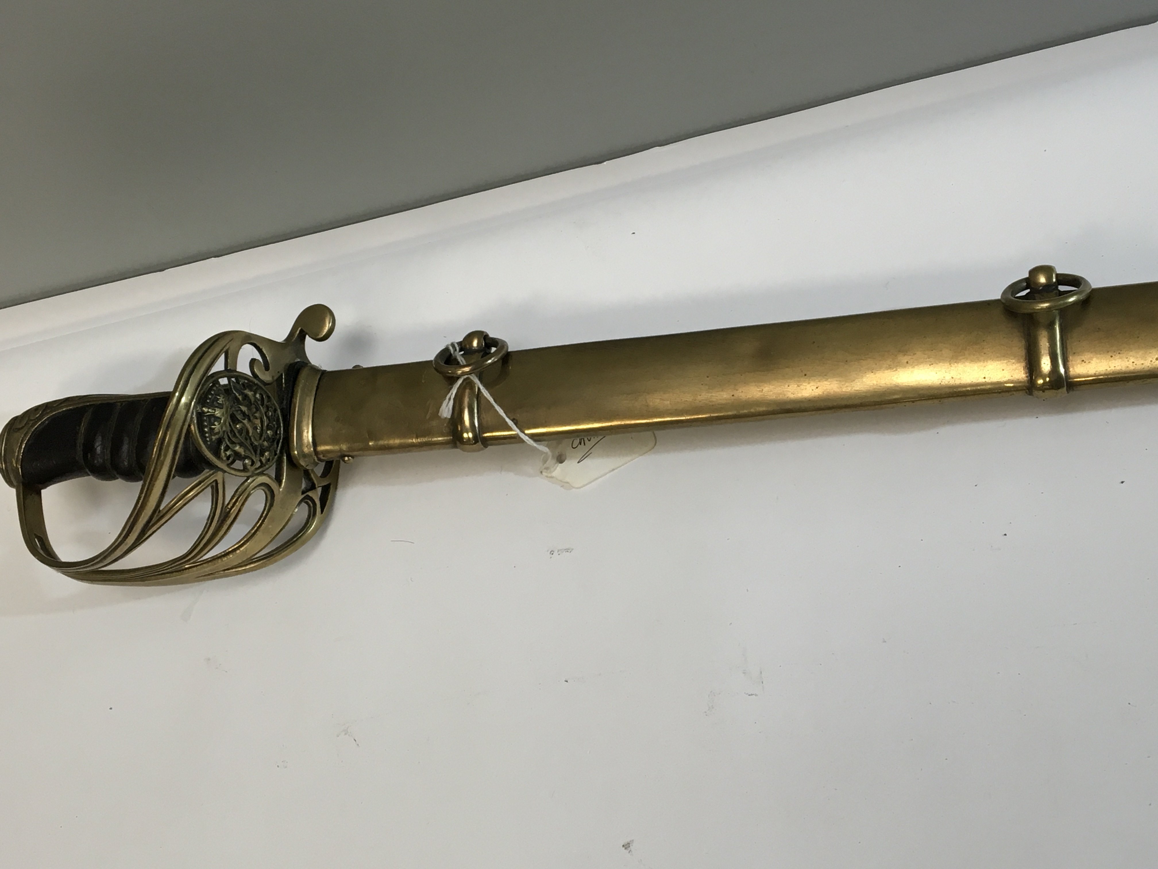 A Good Example of a Victorian light cavalry sword the basket hilt with Royal Cypher. etched blade and full length brass scabbard.