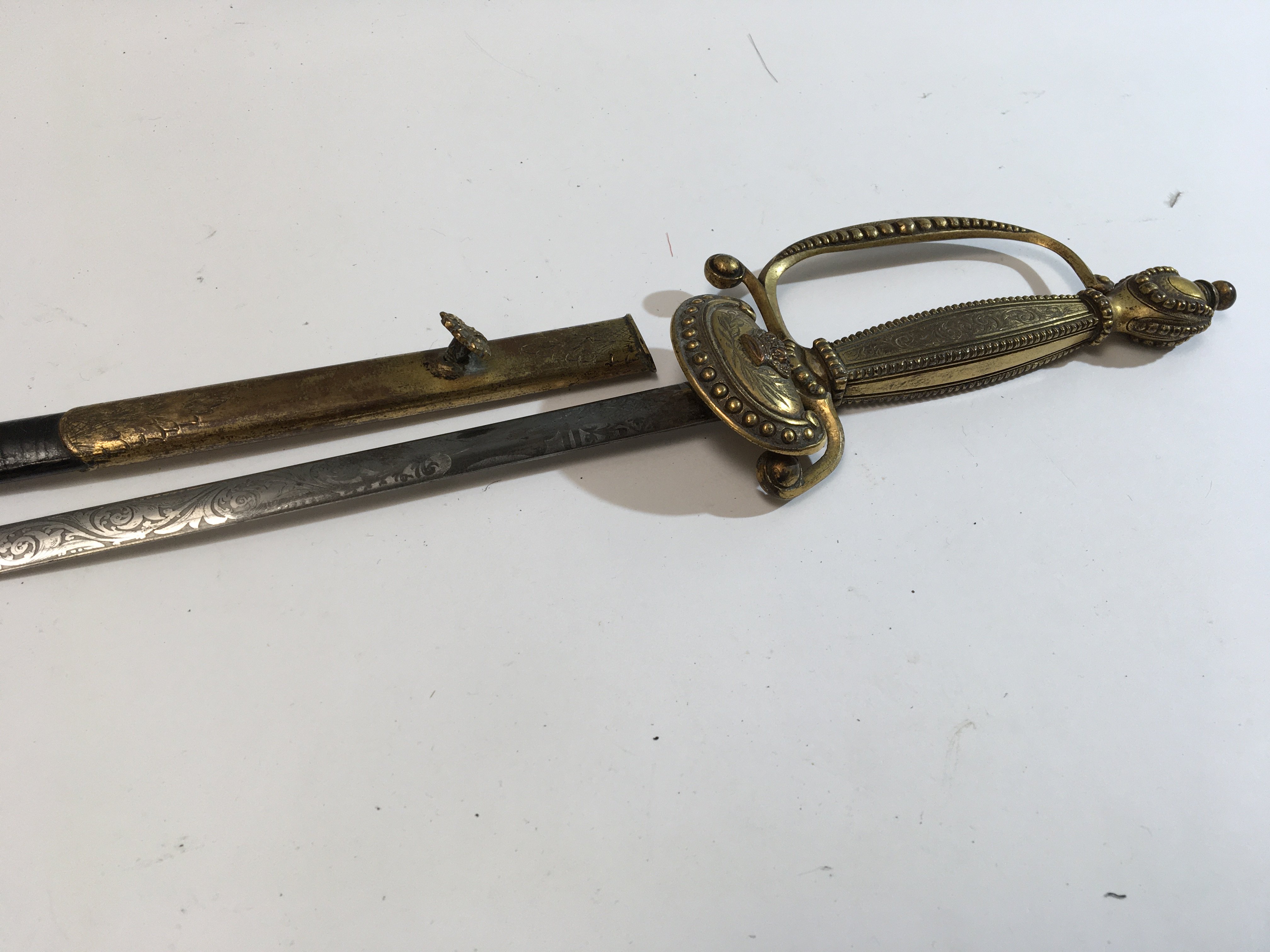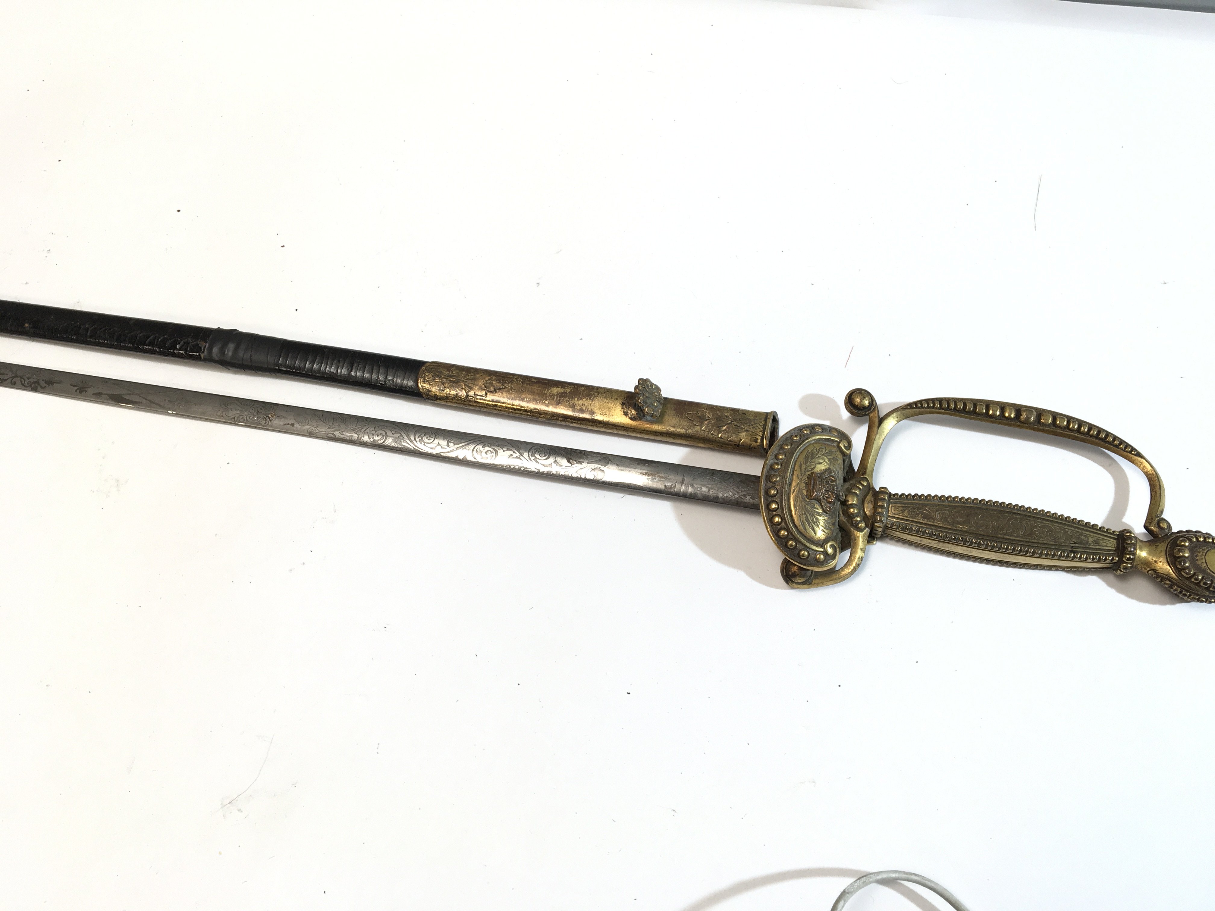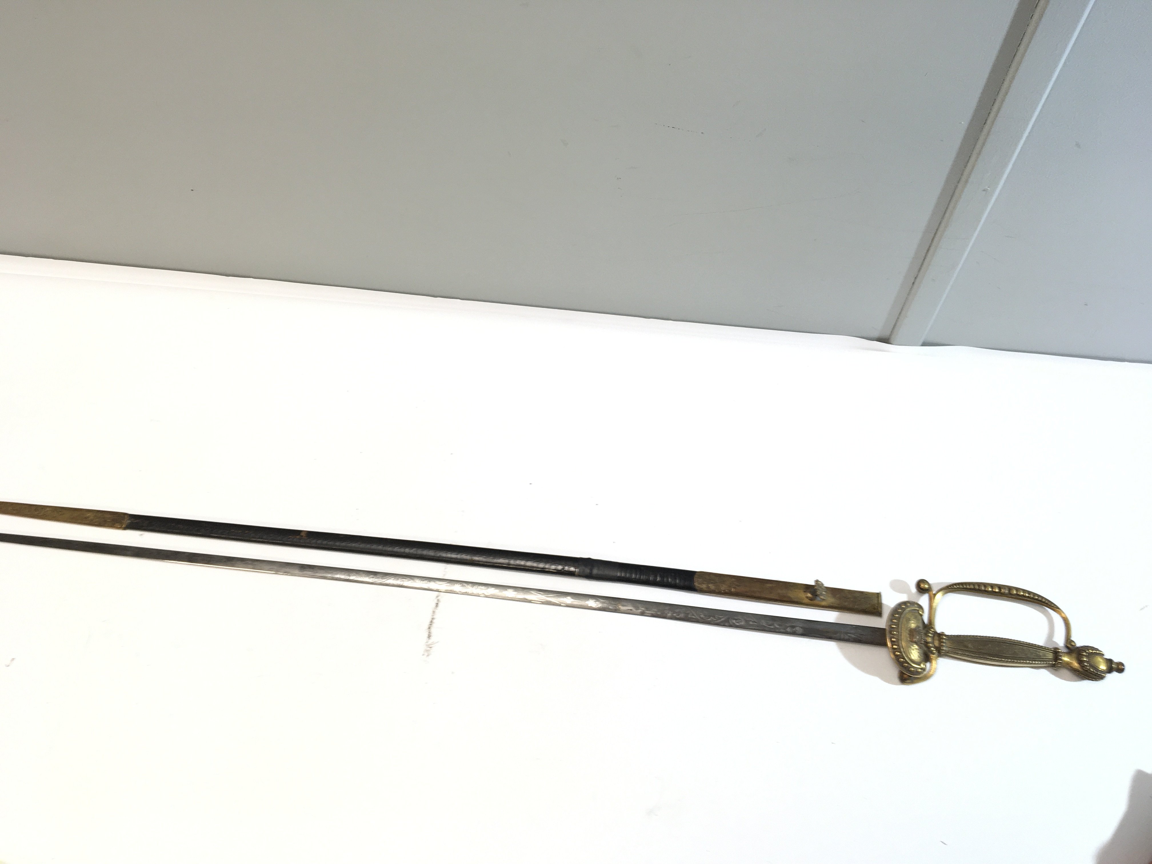 A good example of a Victorian Court sword with crown pommel raised Crown and further ornamentation with an etched blade retailed by Cooling & Lawrence London. repair to the leather scabbard.