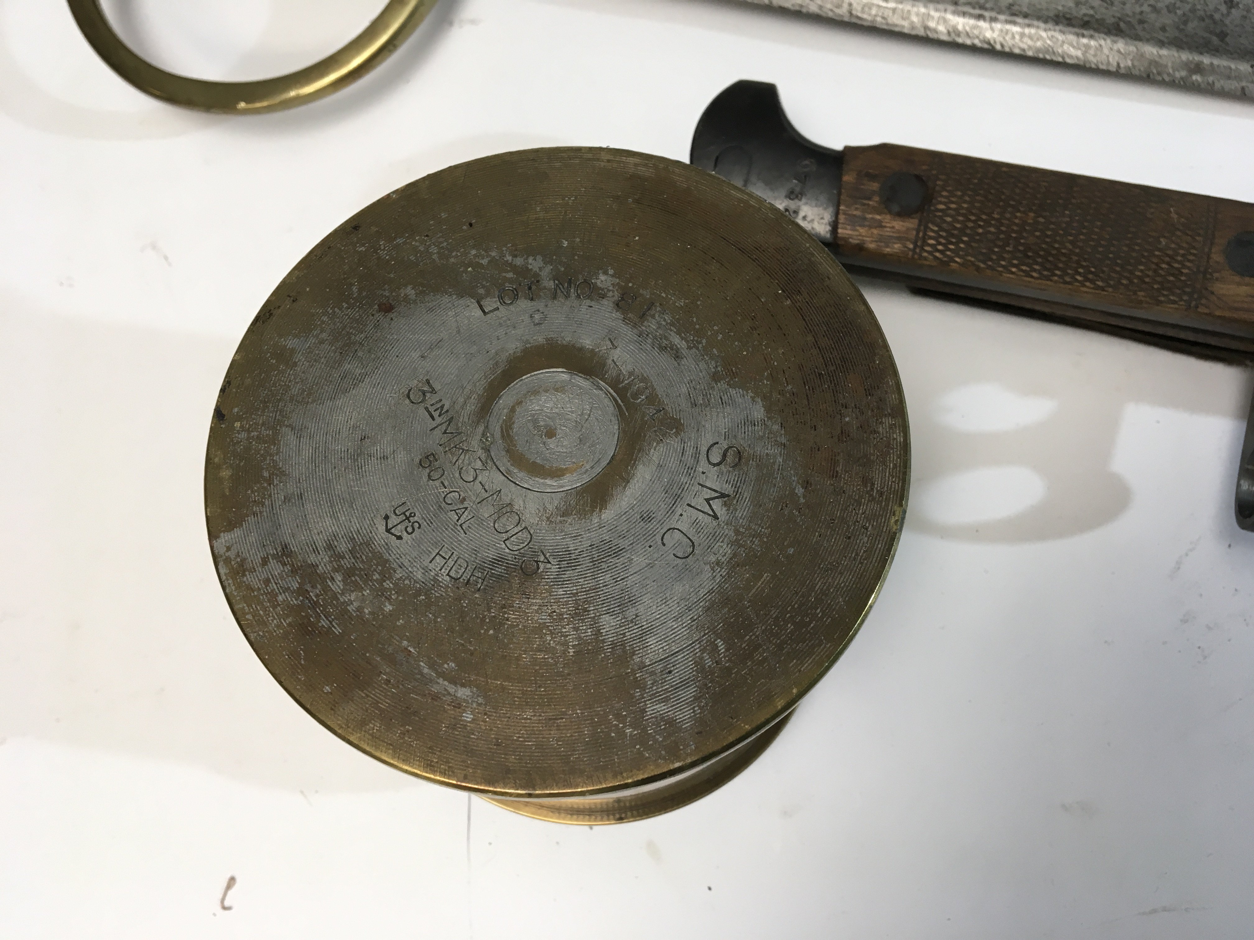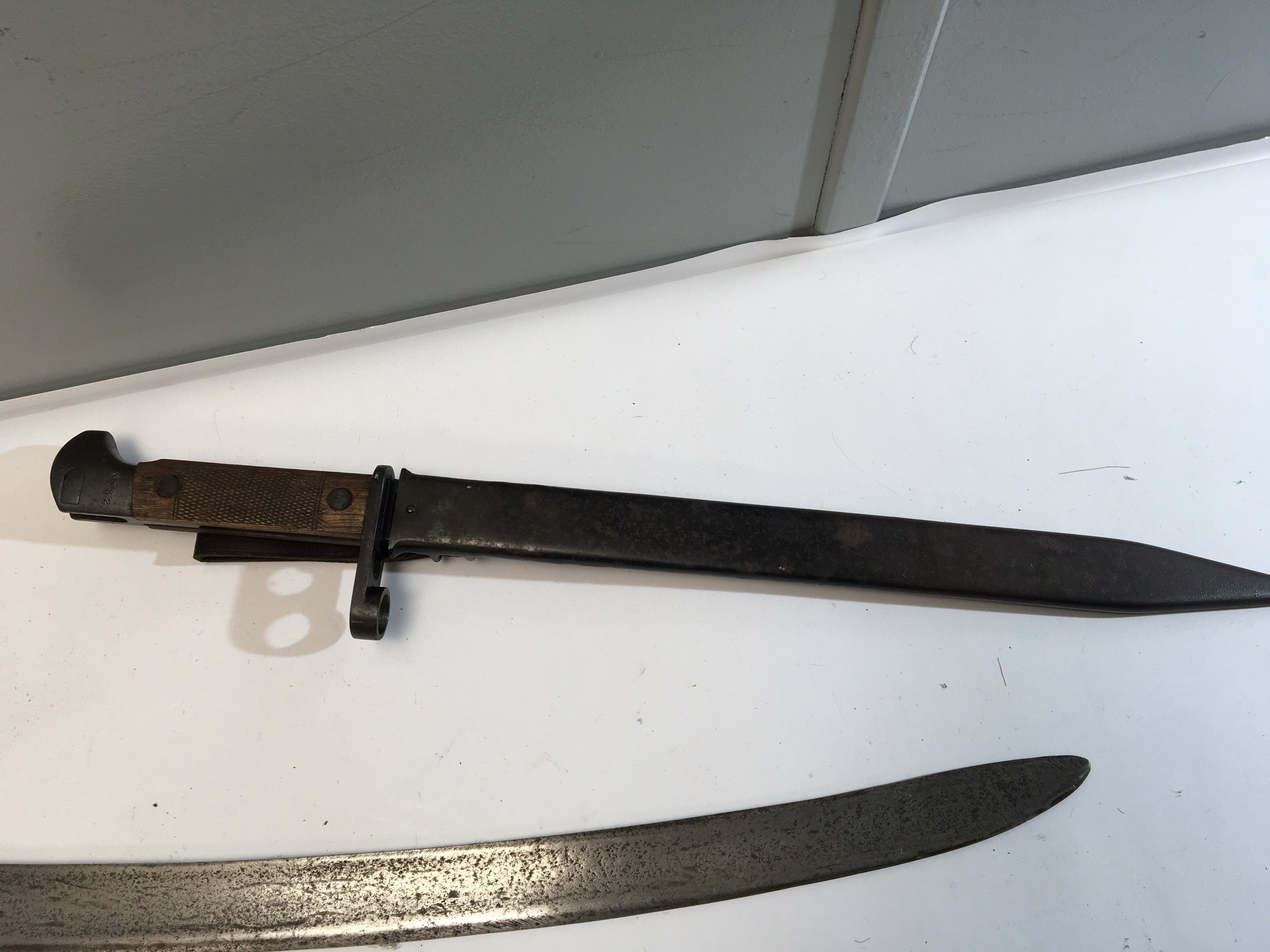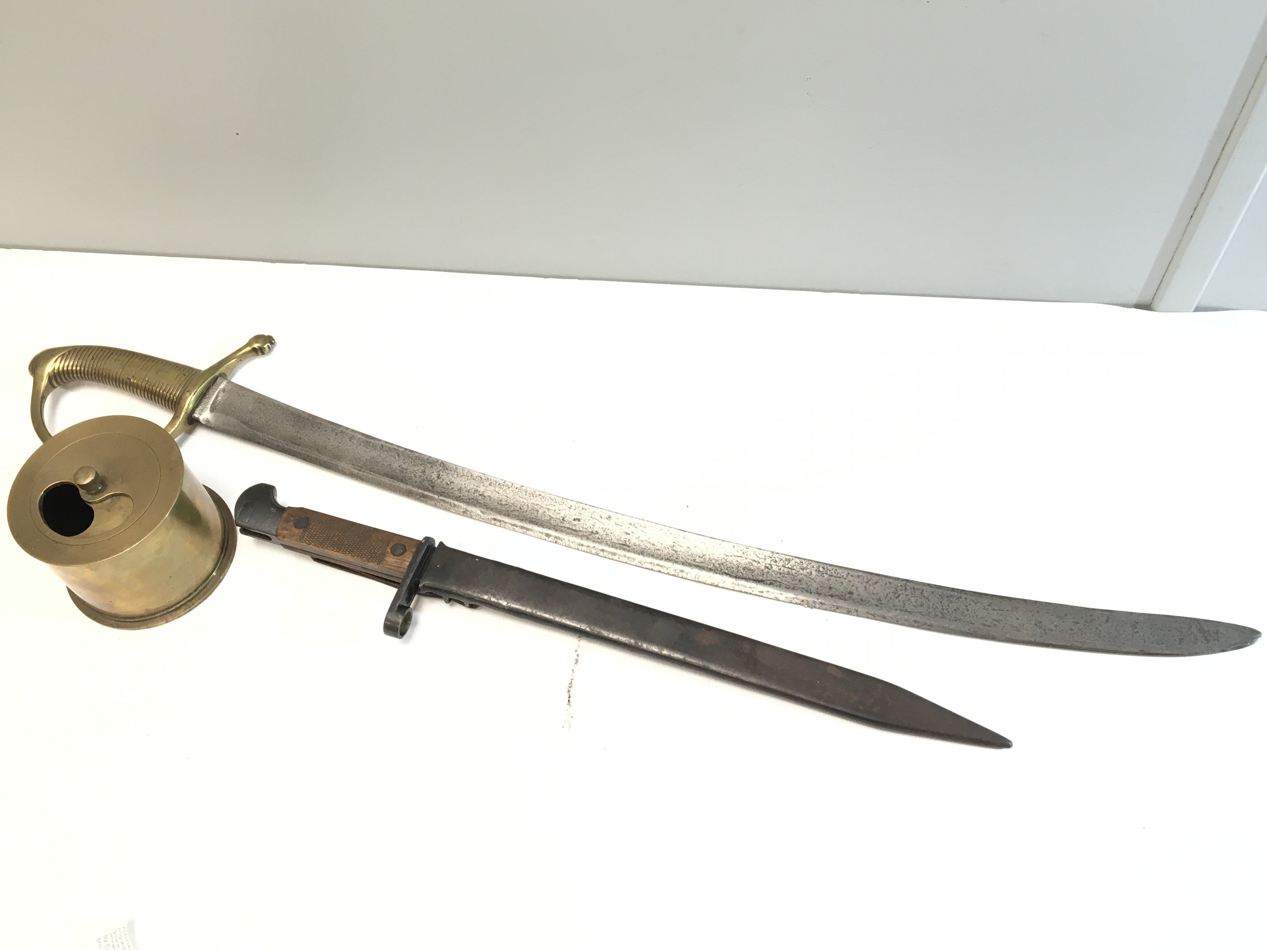 A 19th century short sword with brass hilt a bayonet possible Russian II world war and a trench art shell case container 1942. (3)