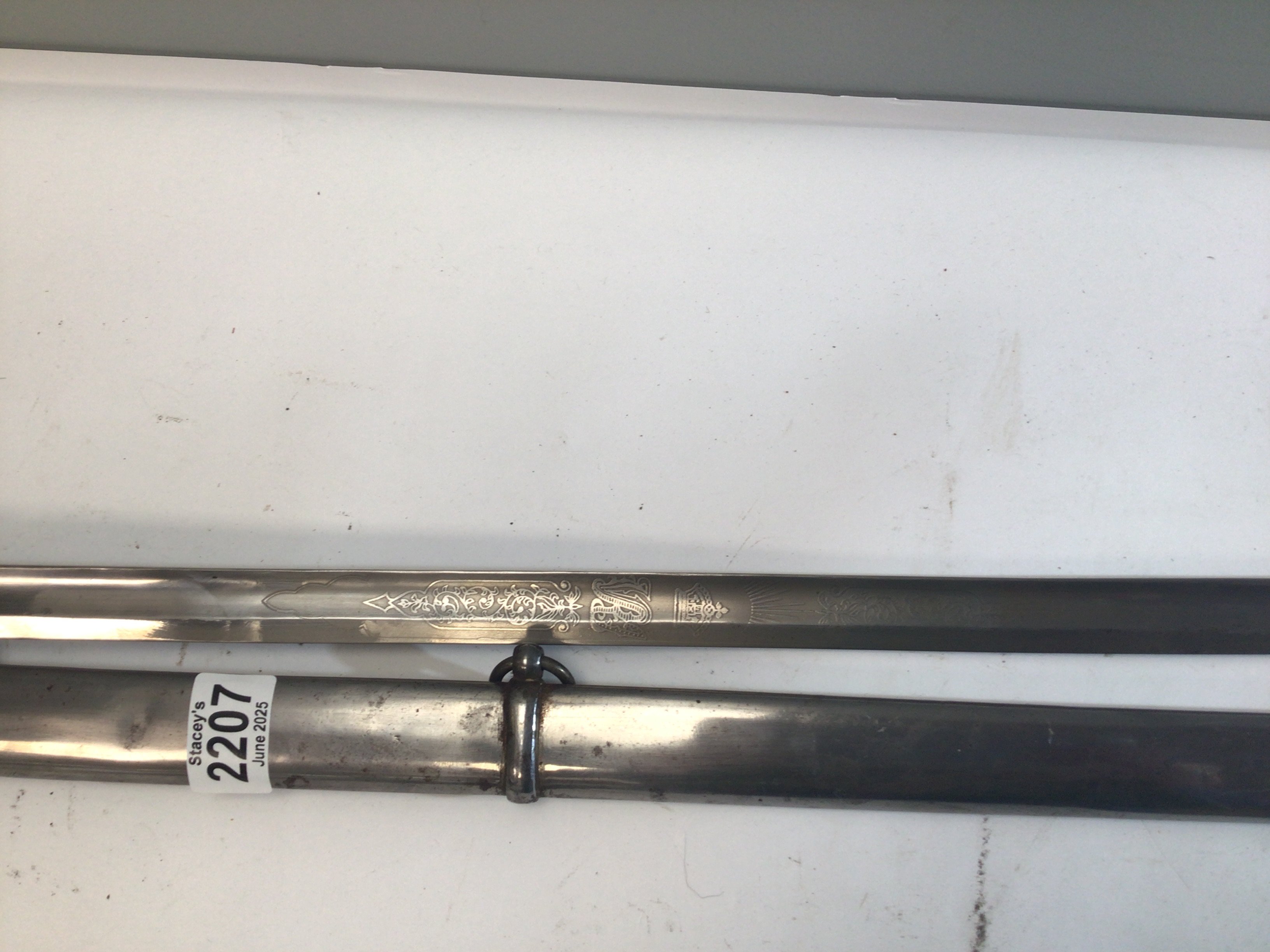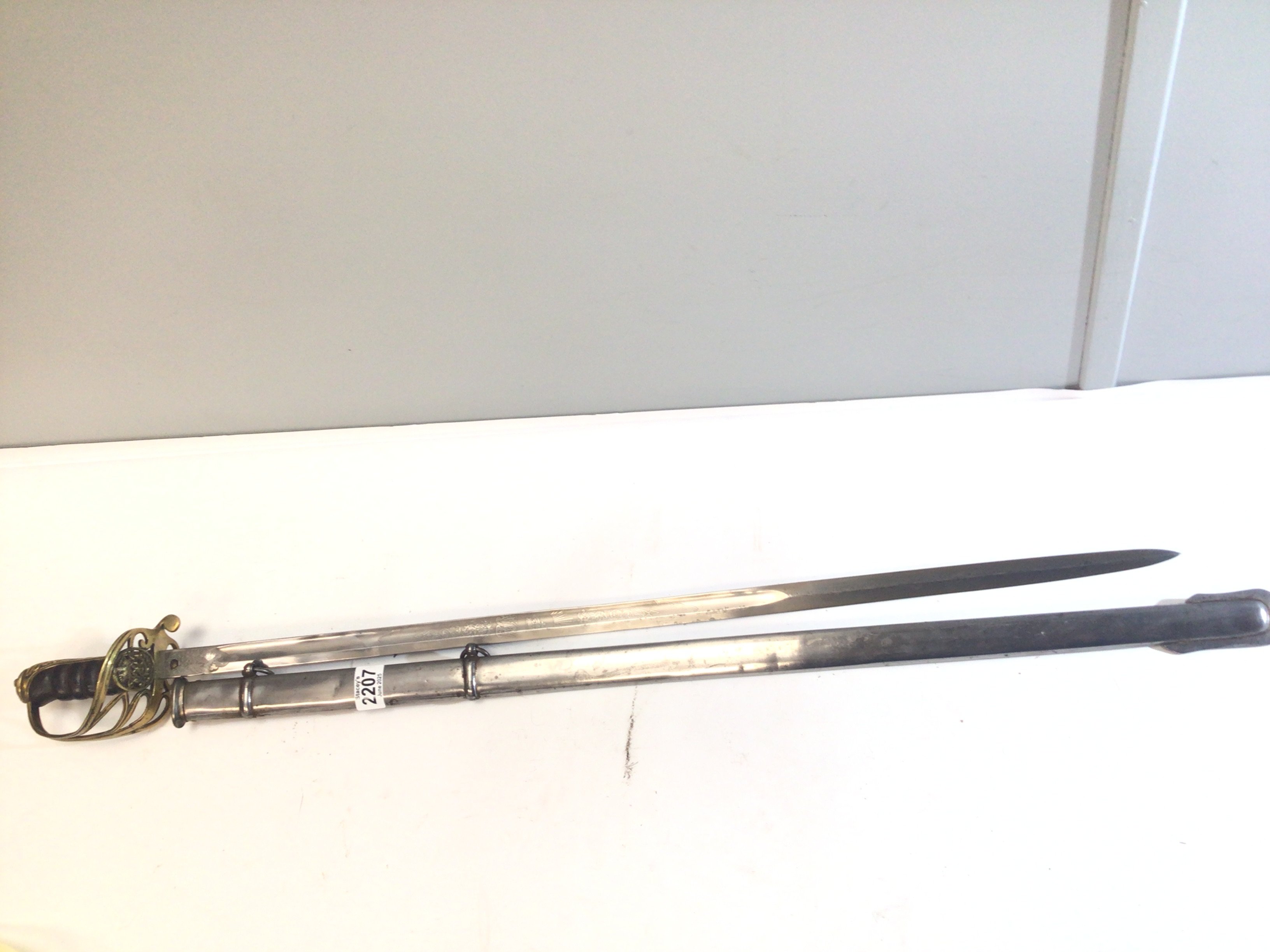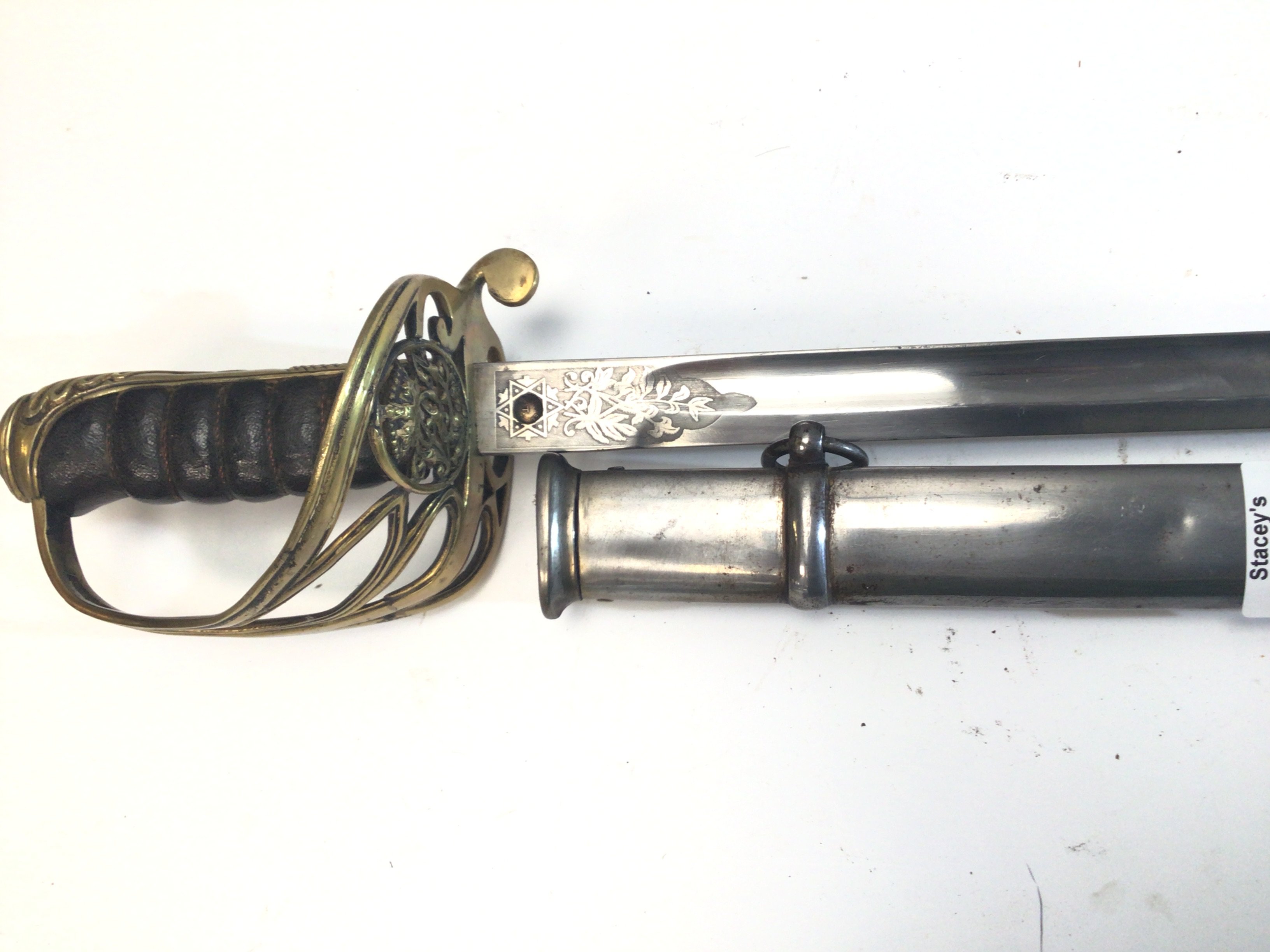 A British Victorian officers sword possibly cavalry. The brass hilt with Victorian cypher the blade with conforming etched decoration wired leather grip steel scabbed.
