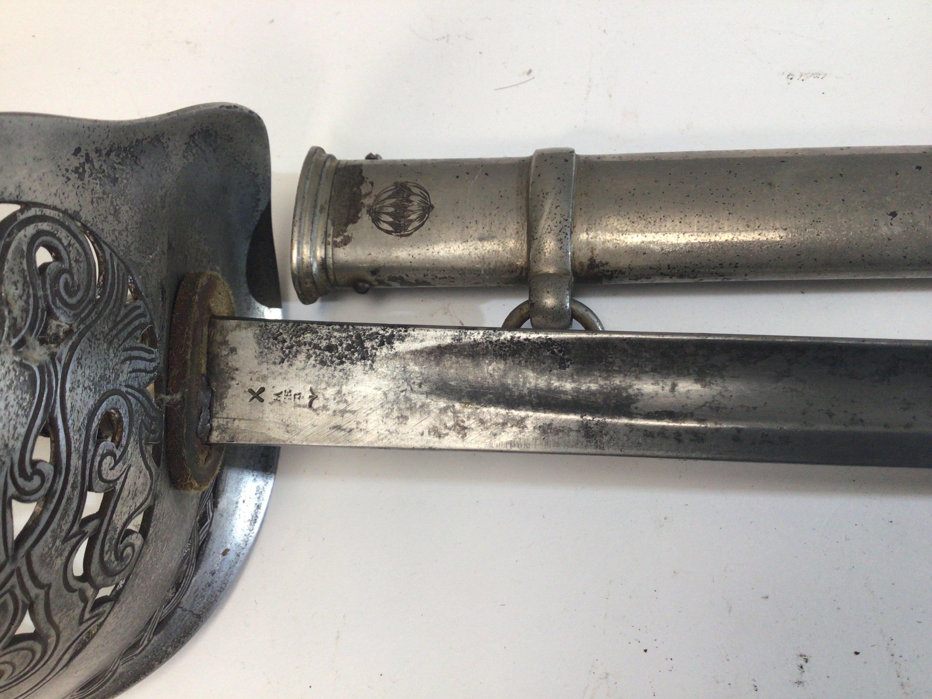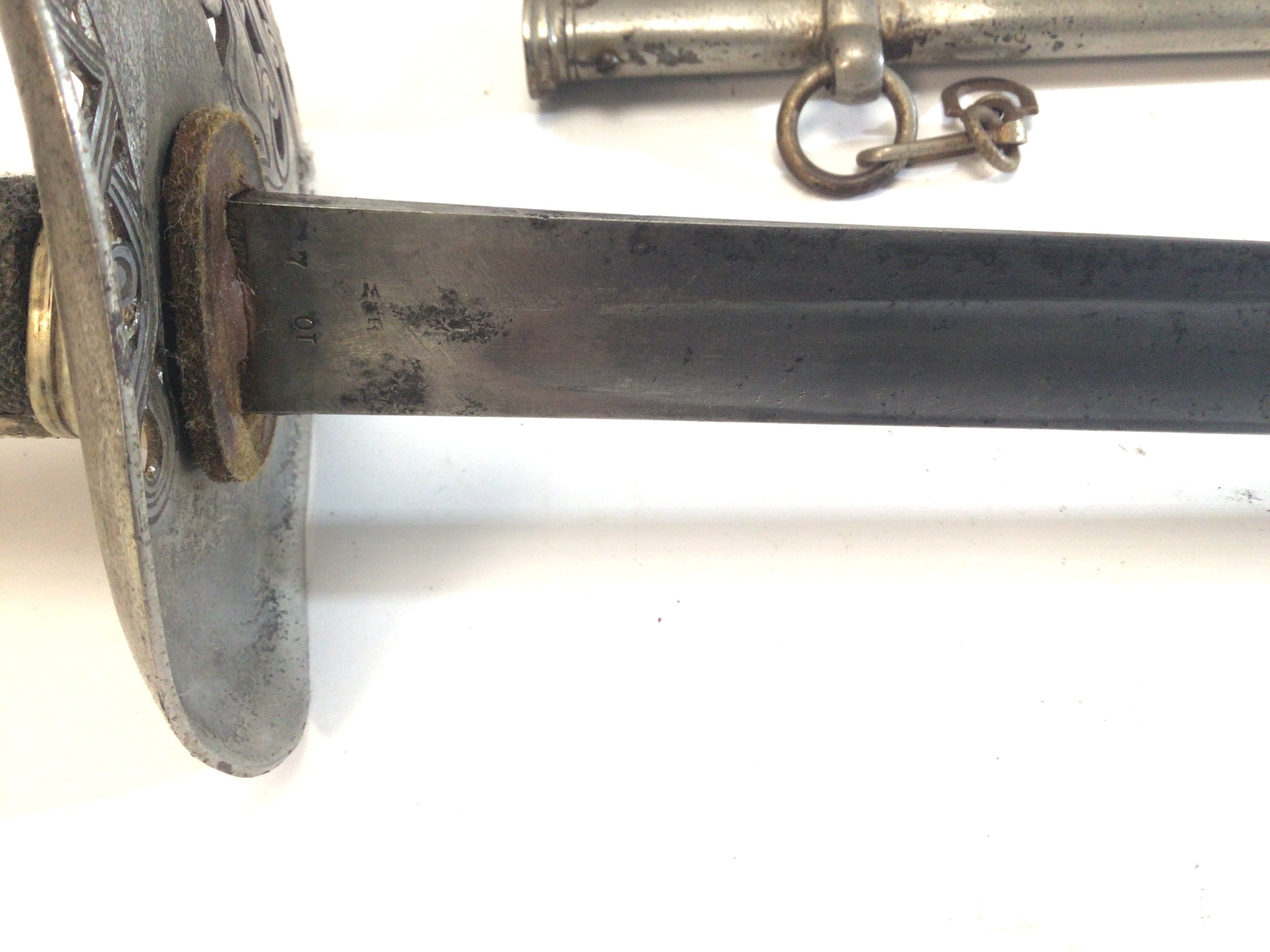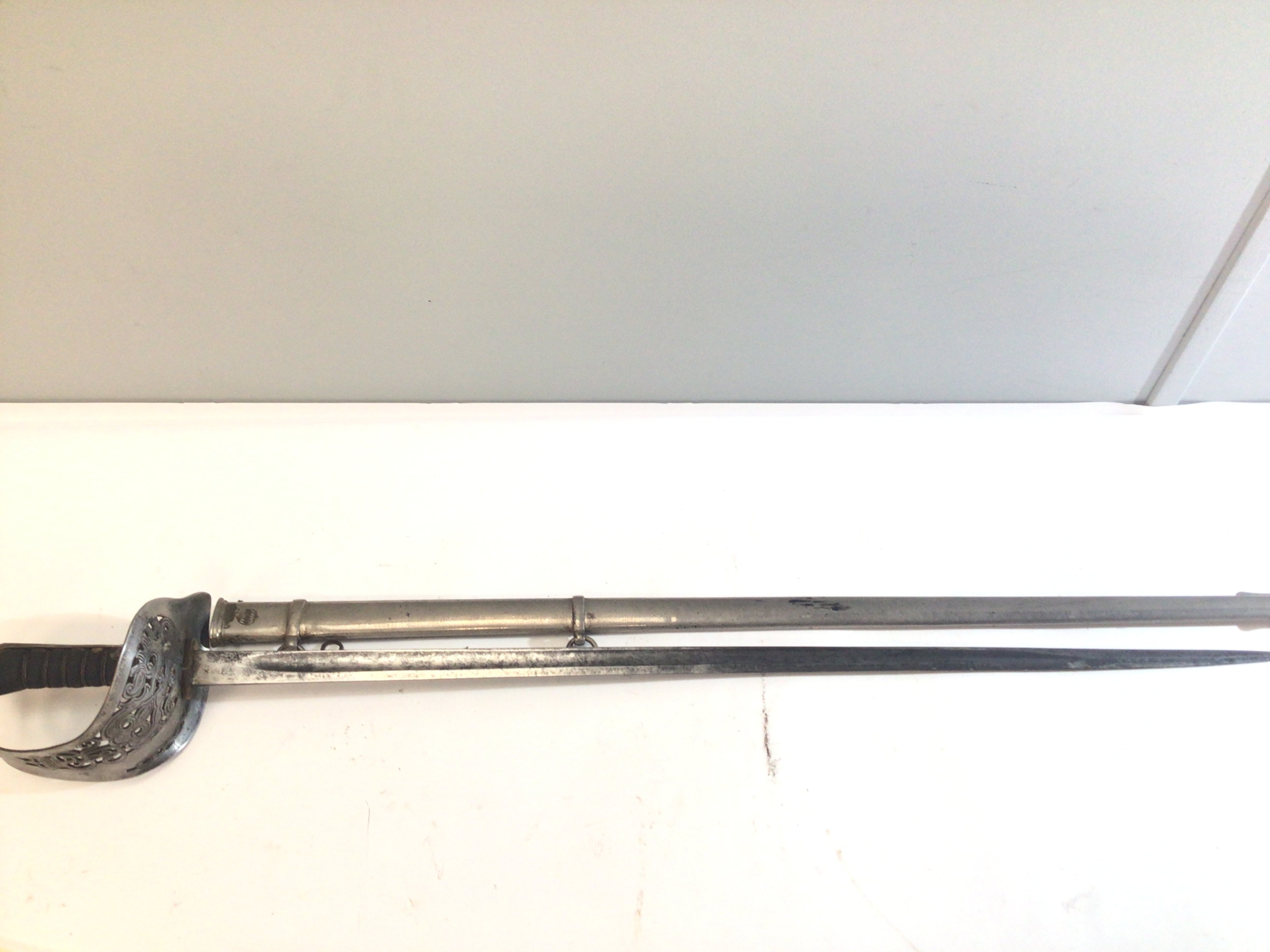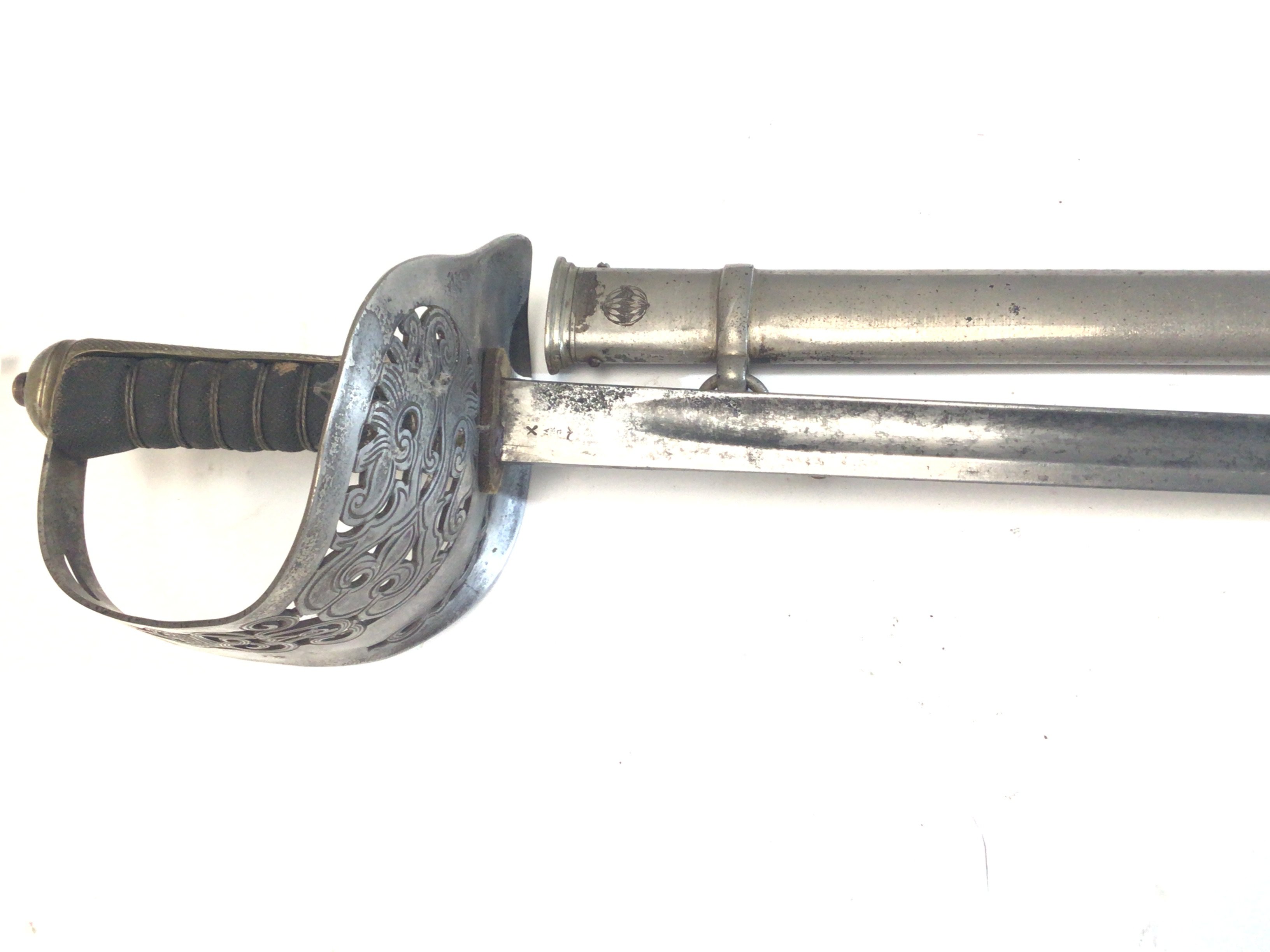 A George V British Military sword I world war infantry officers sword the priced enclosed steel hilt with Royal Cypher the blade with military marks and the steel scabbed with a small circular symbol.