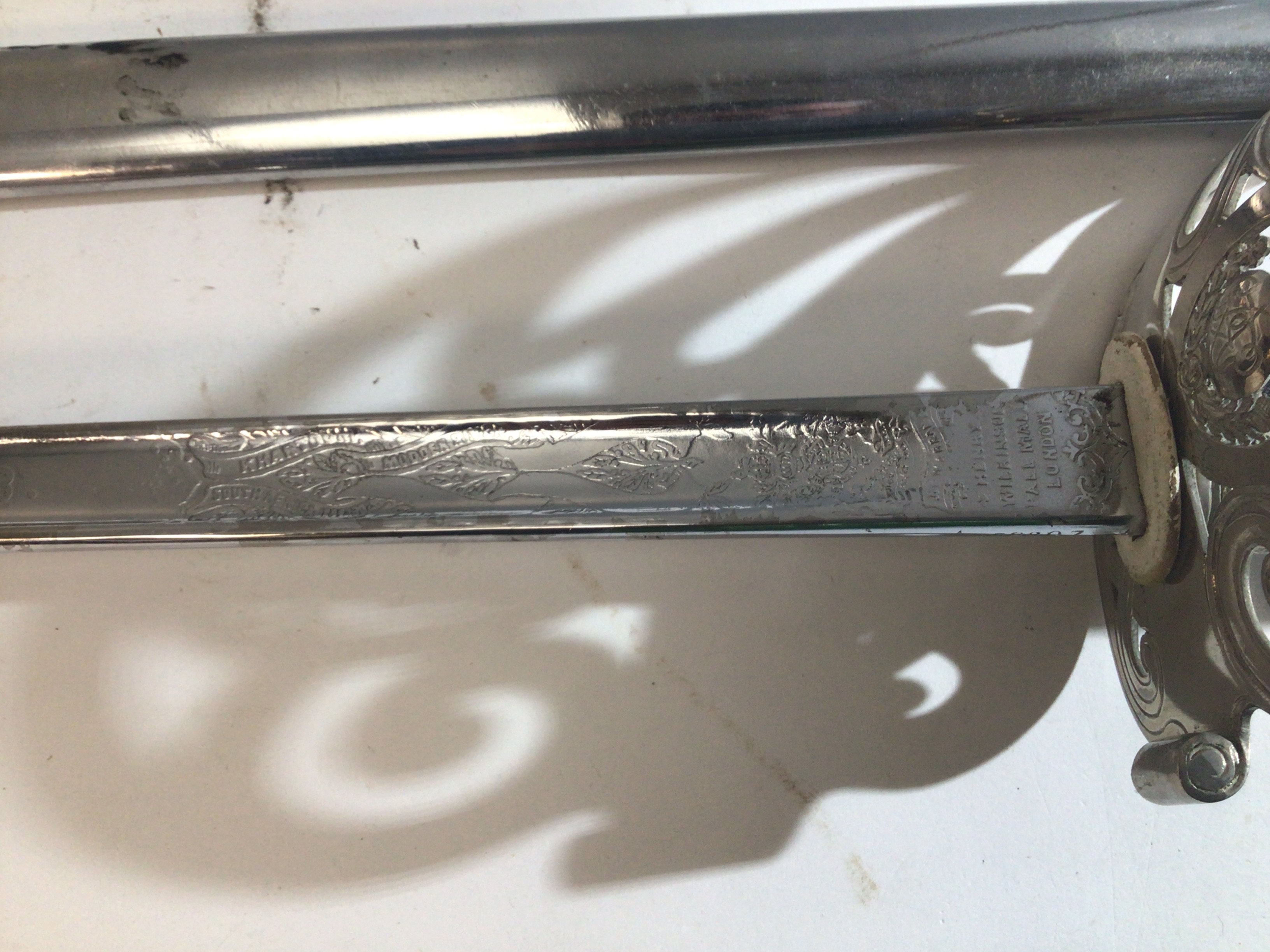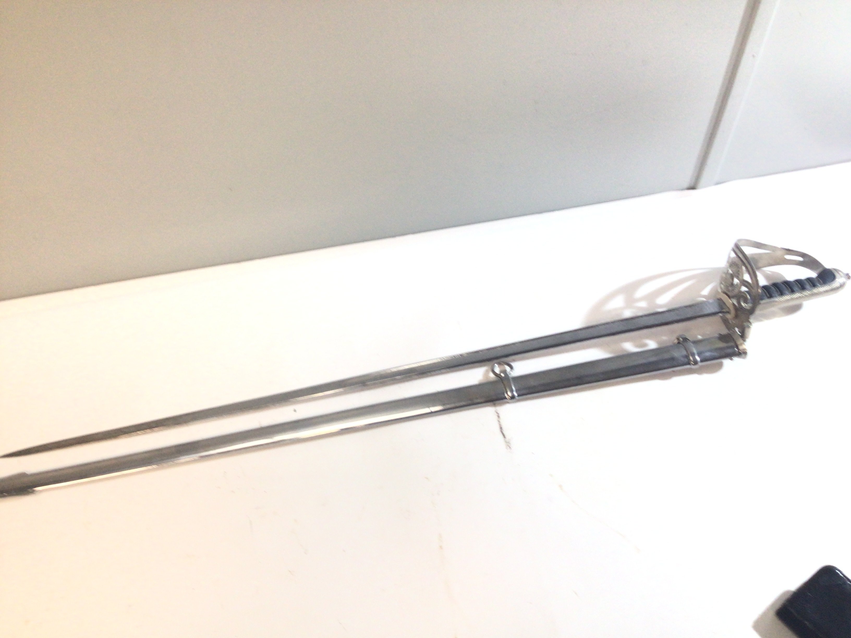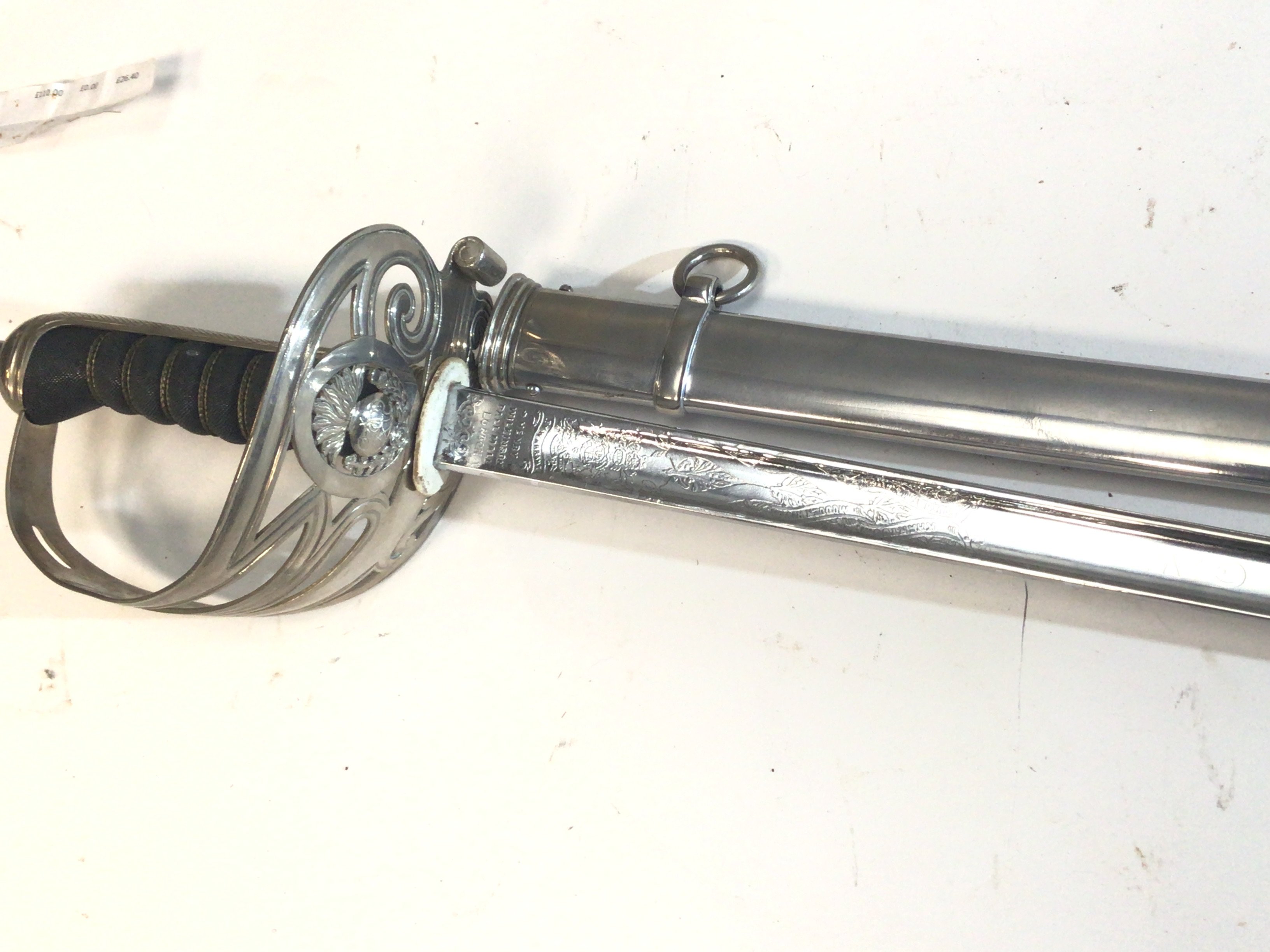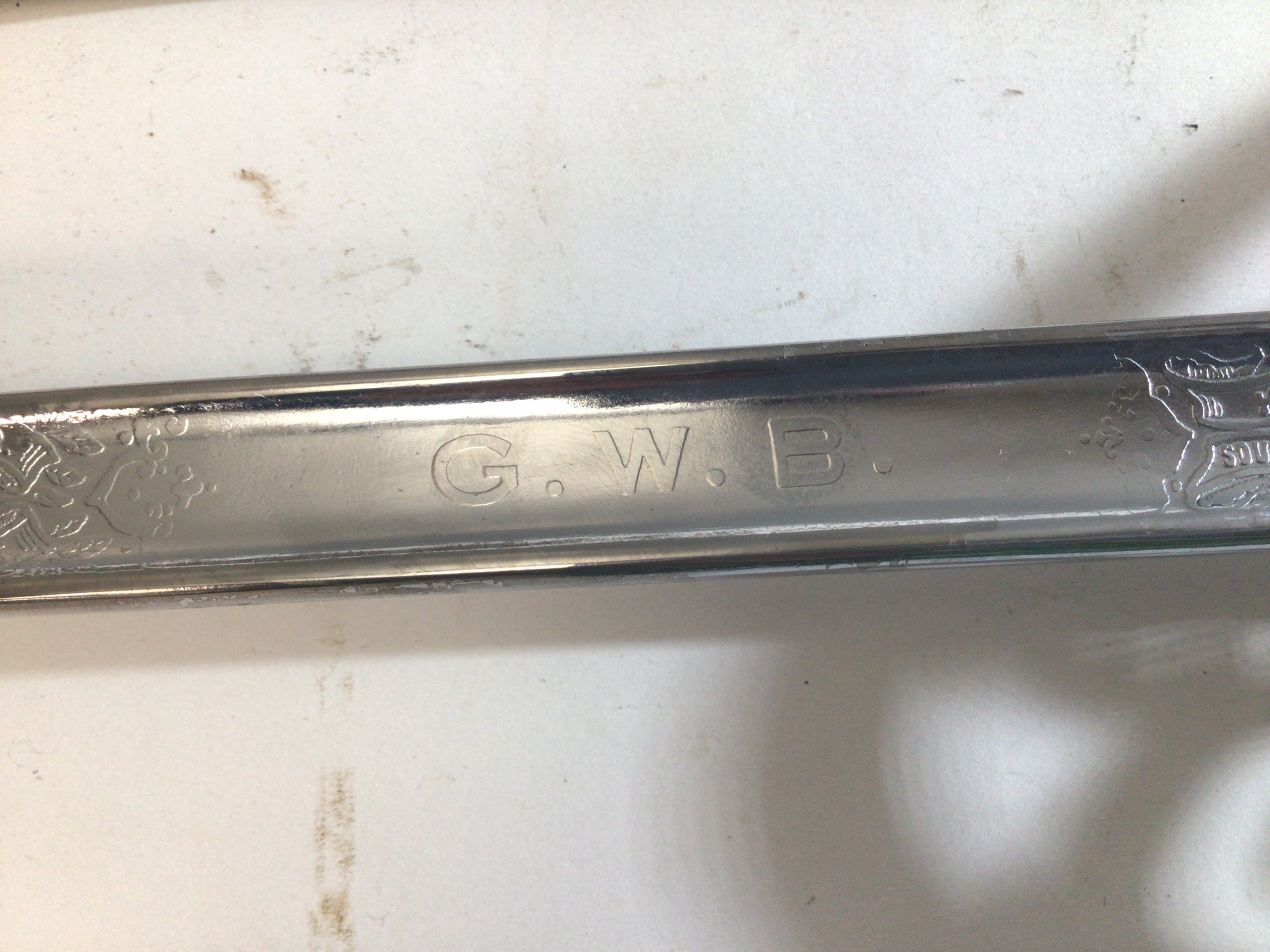 An intresting George V British Military officers sword made by Henry Wilkinson London the Hilt with regimental badge the chrome finished blade with named campaigns and the letters G.W.B with a steel scabbed.