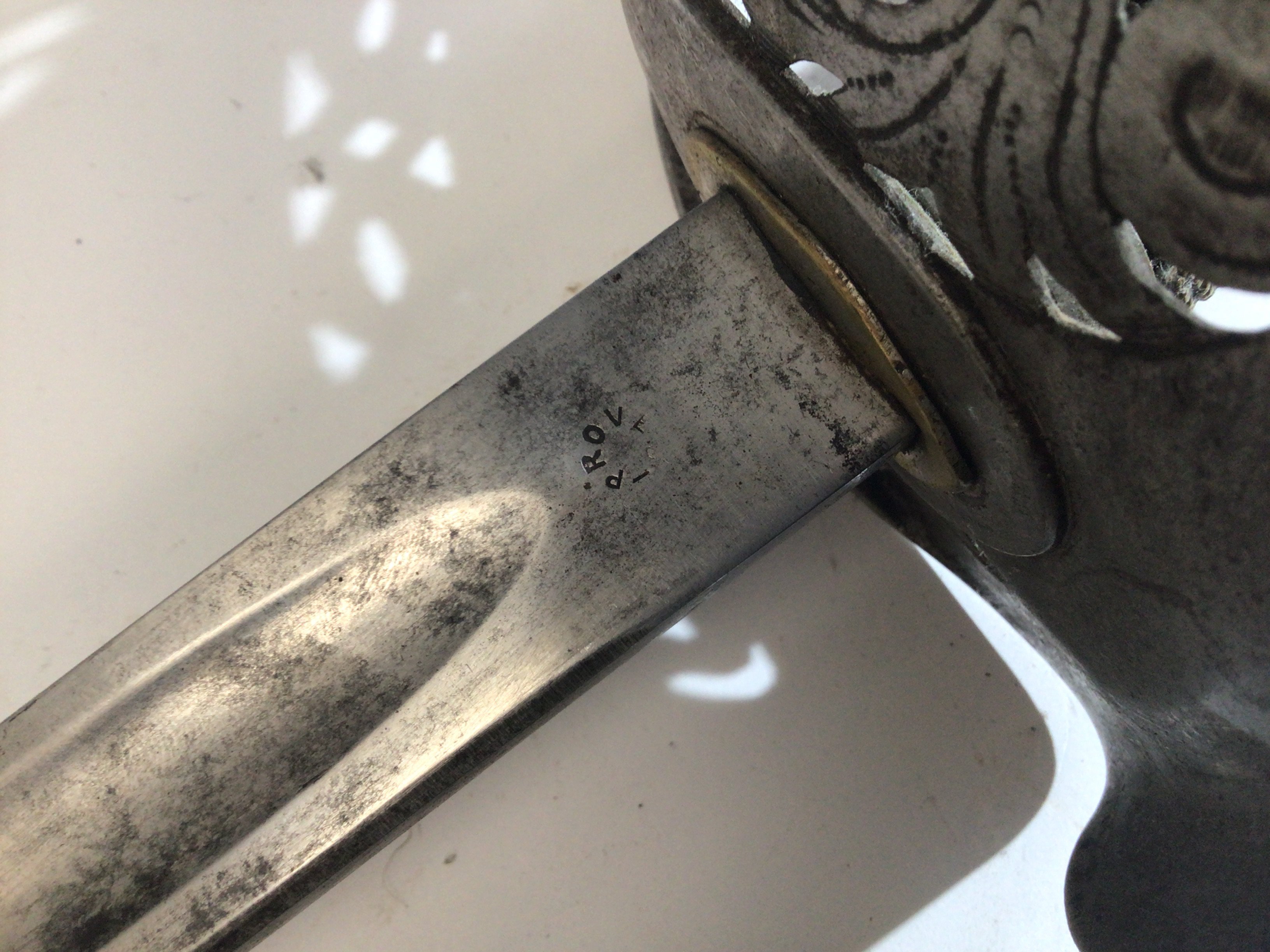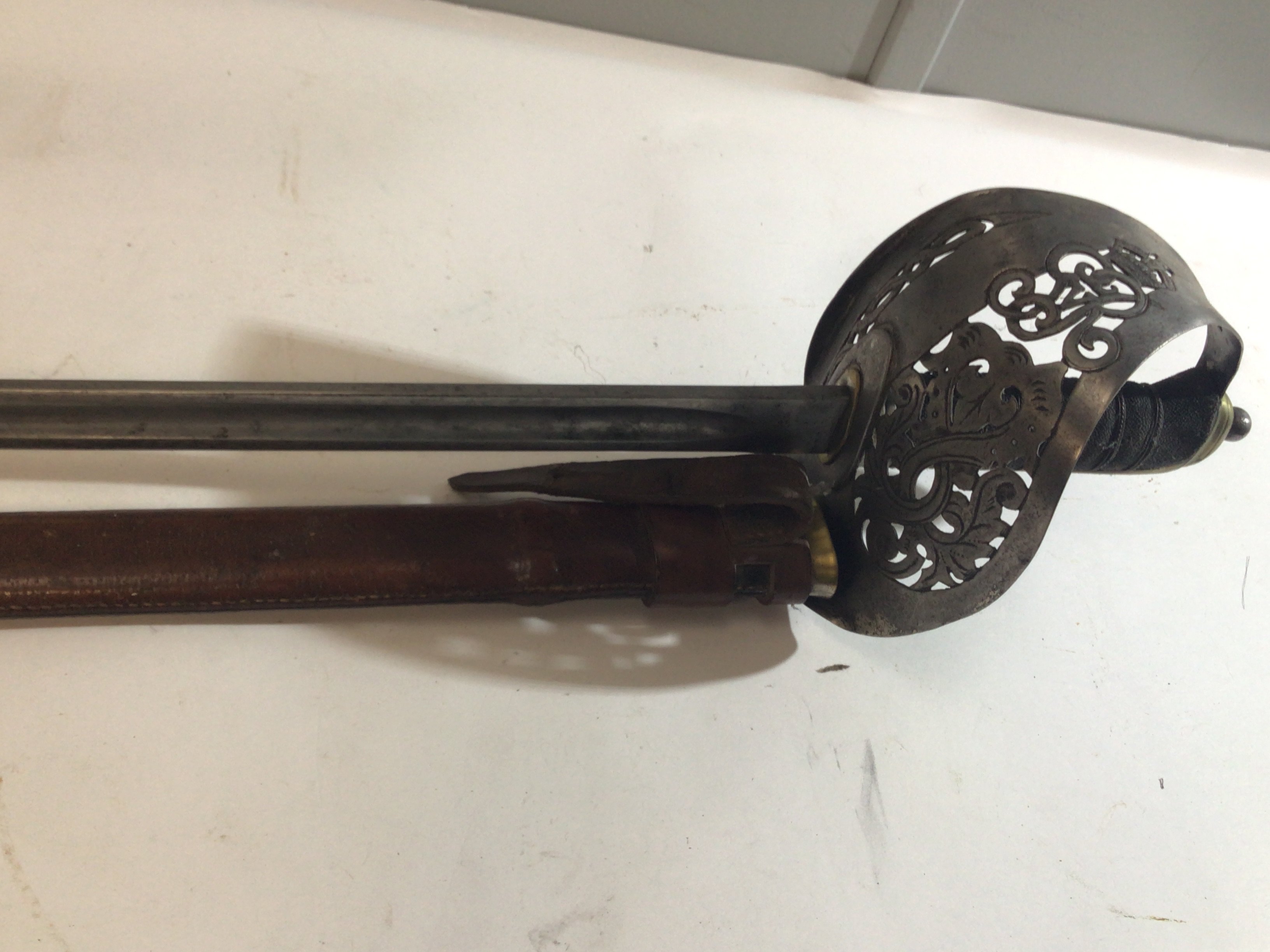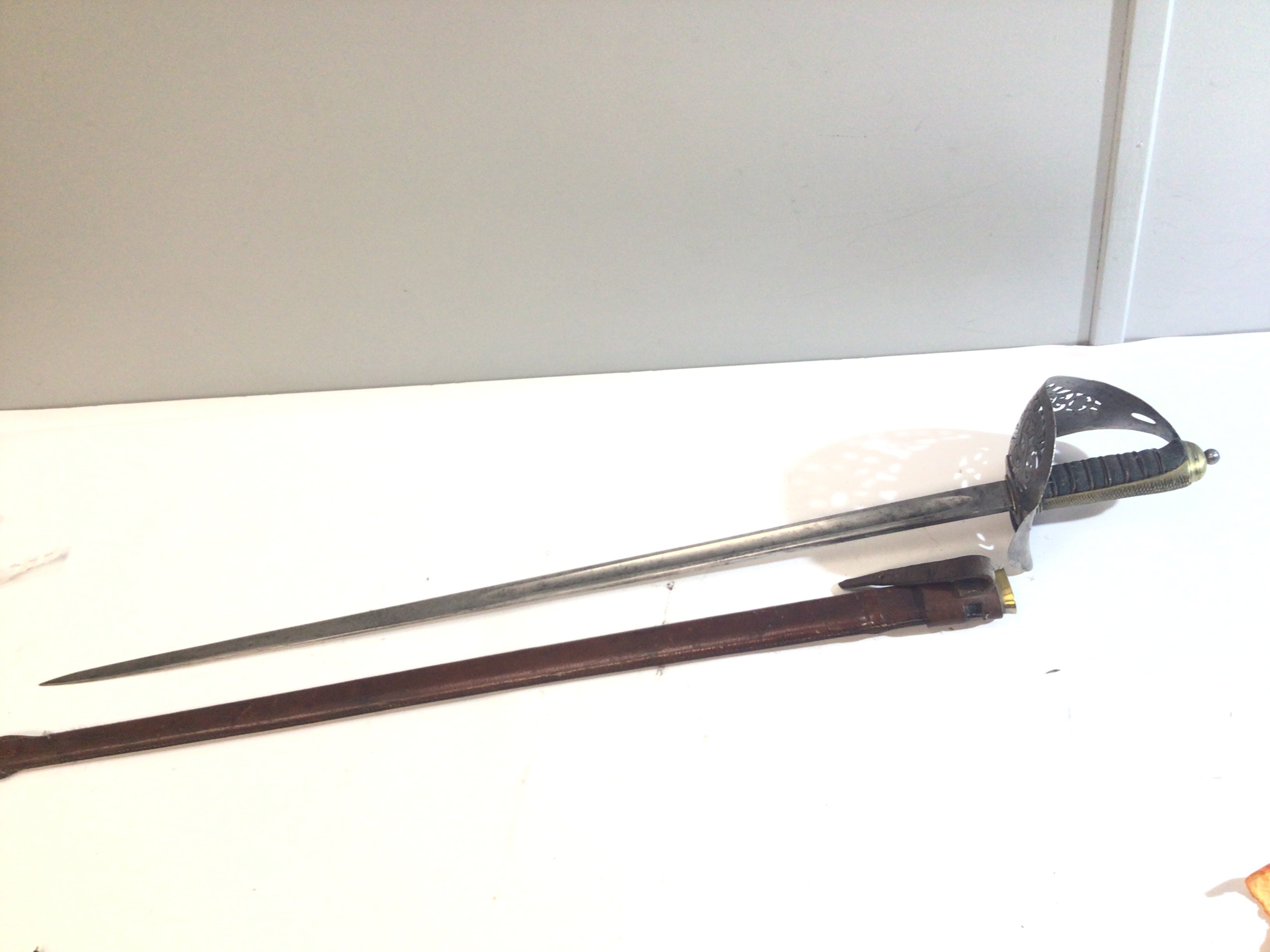 A George V British military infantry officers sword the steel hilt with Royal Cypher wired grip and leather covered scabbard the blade with small marks.