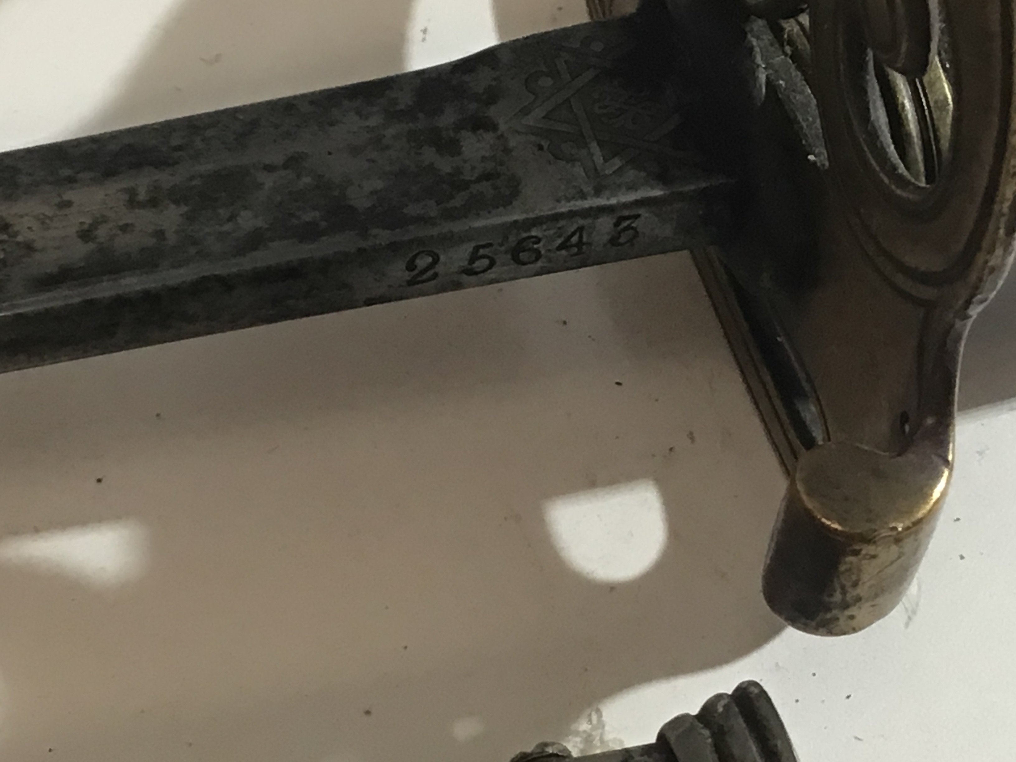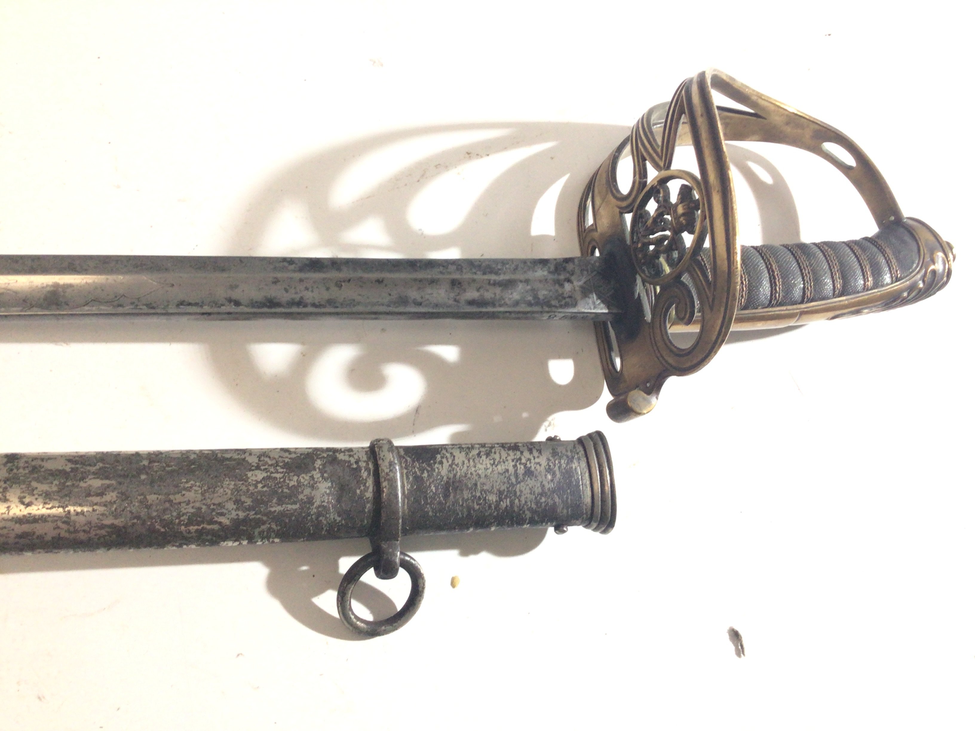 A Victorian British Military Officers sword The Royal Welsh Fusiliers with a brass hilt with Victorian Royal Cypher the blade with a list of regimental battle campaigns the blade edge with issue number 25643 steel scabbed maker Henry Wilkinson