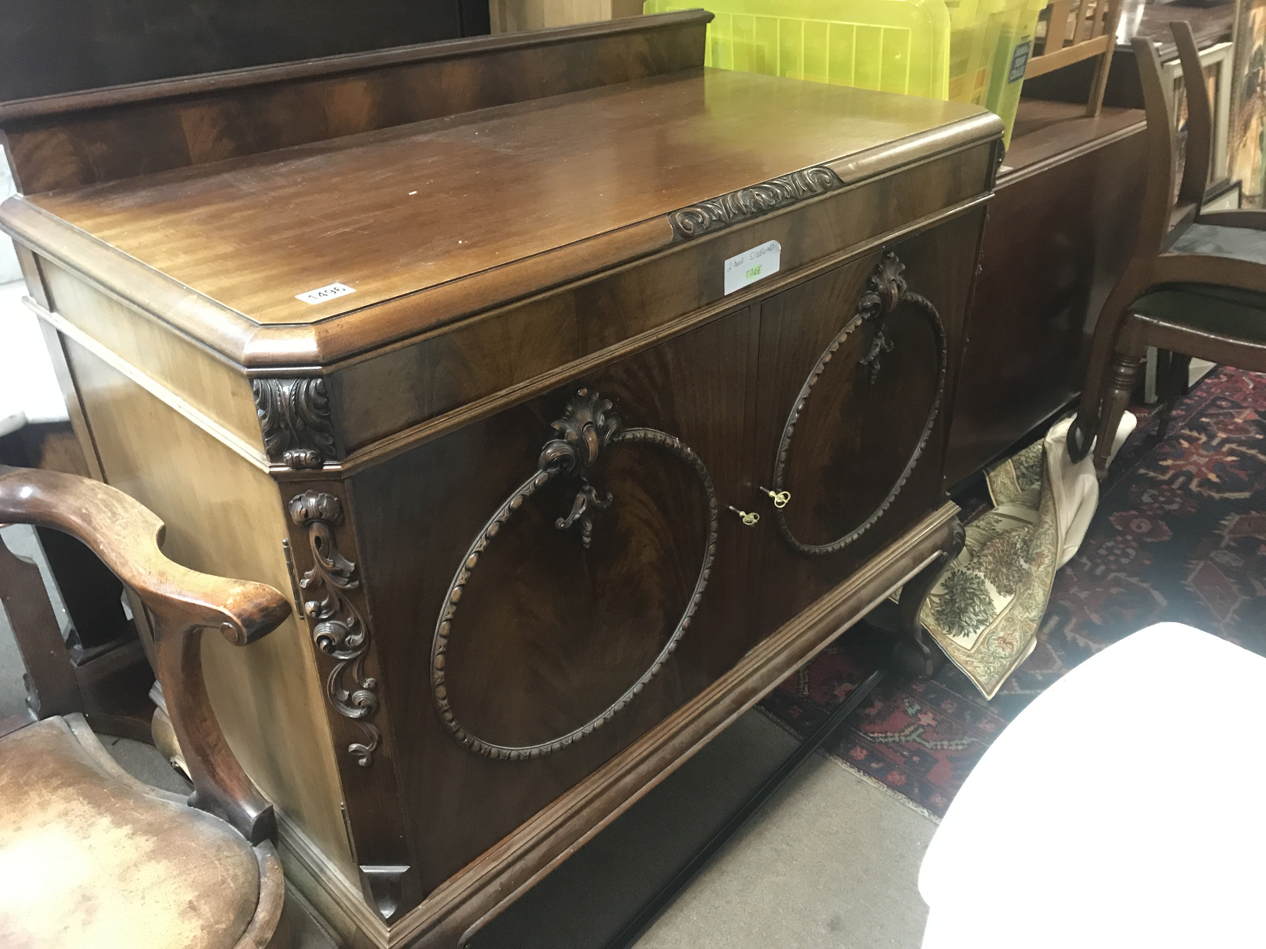A mahogany side cabinet the raised back above a pair of door on cabriole legs .