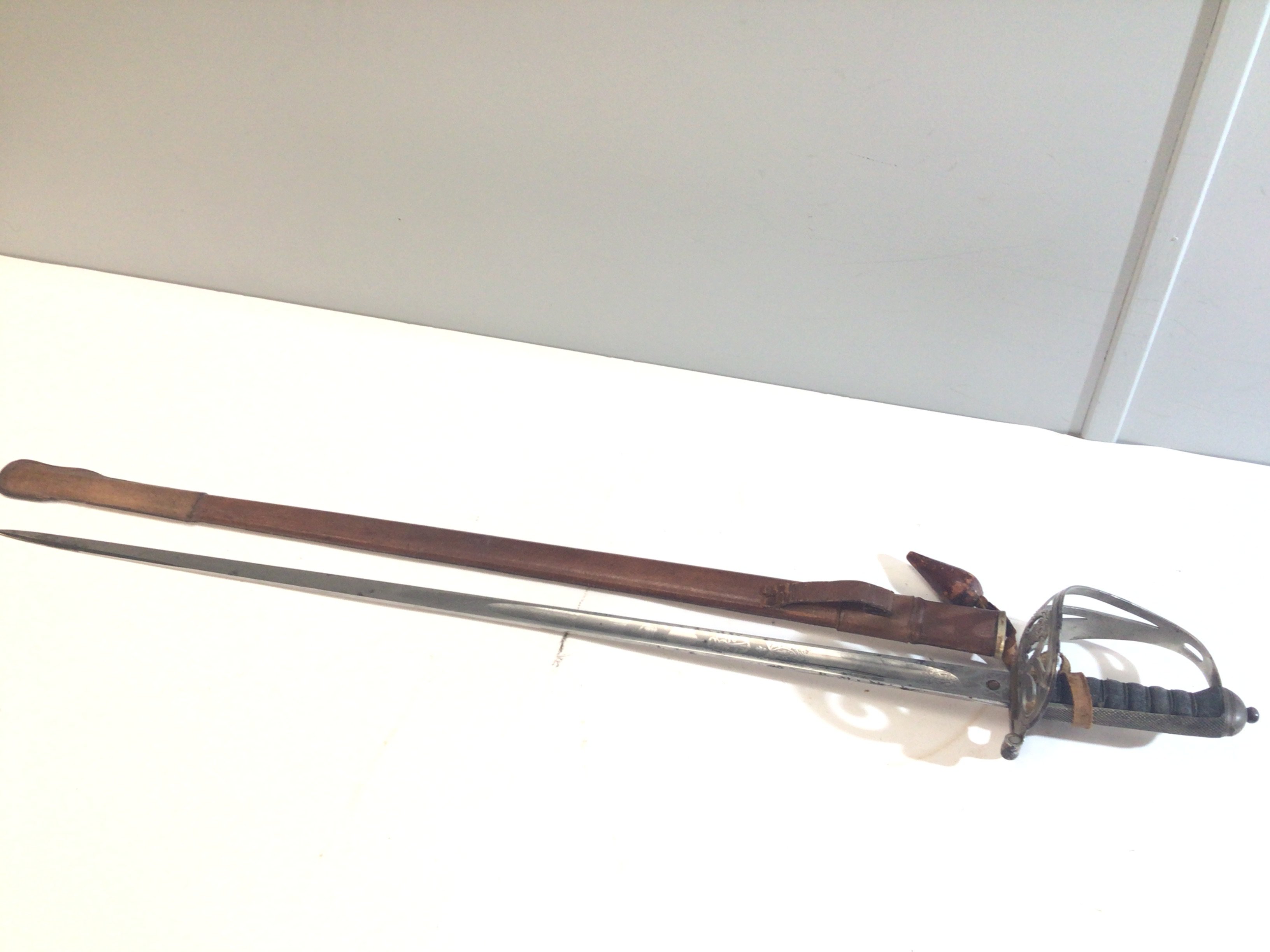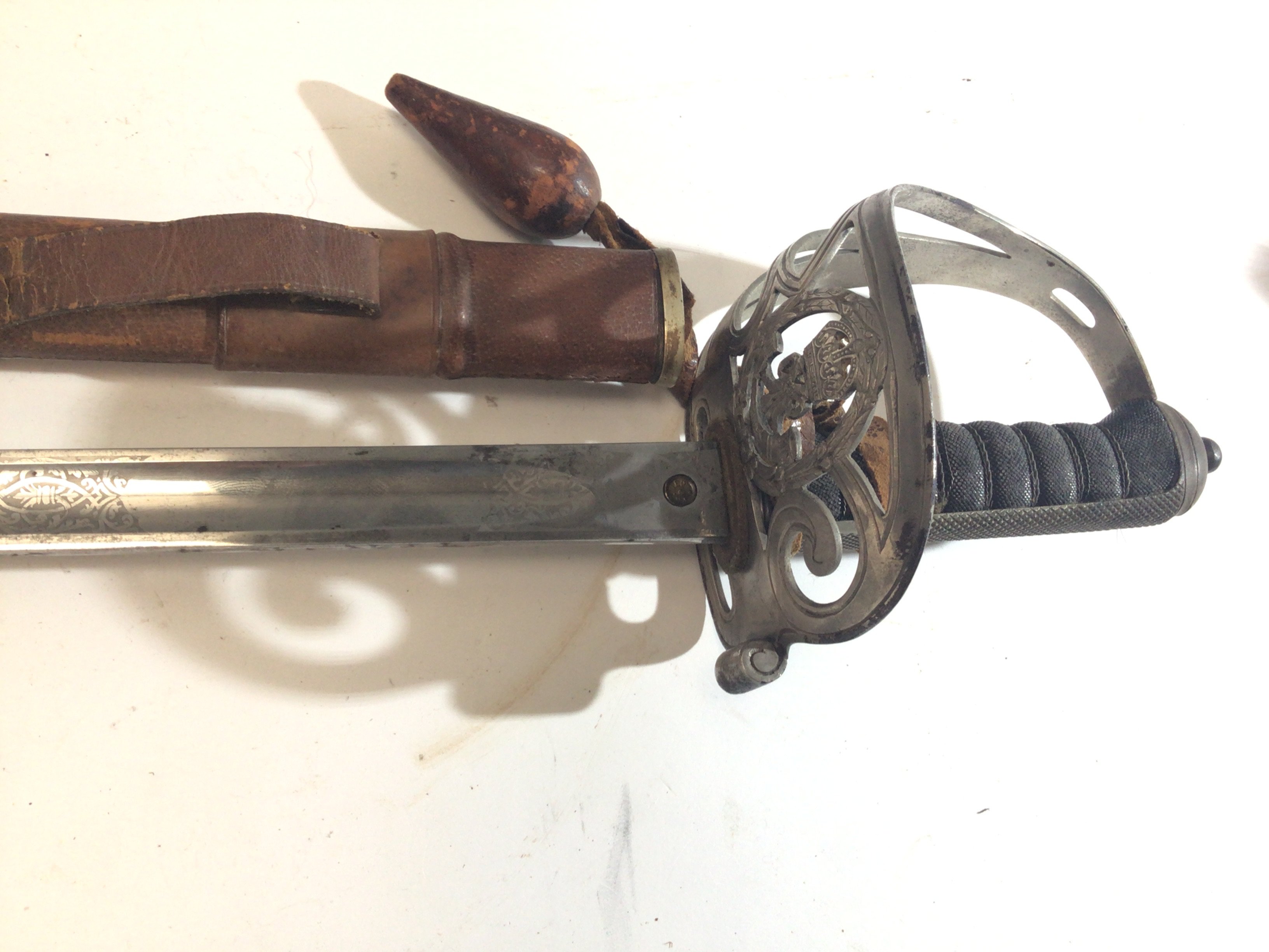 A George V British Military officers sword Rifle Regiment the steel hilt with Regimental badge wired grip. The blade with conforming Regimental decoration. leather covered scabbard.