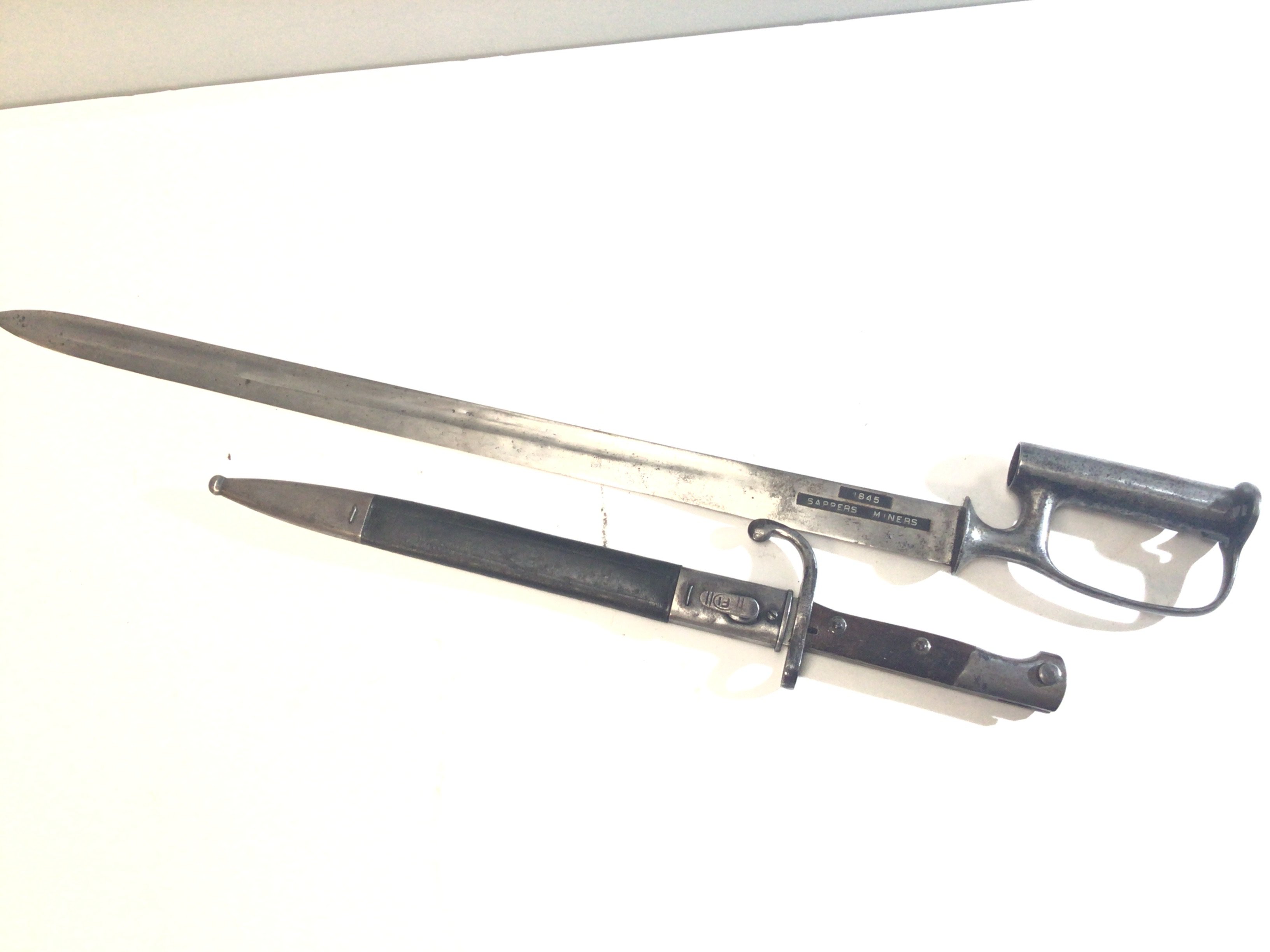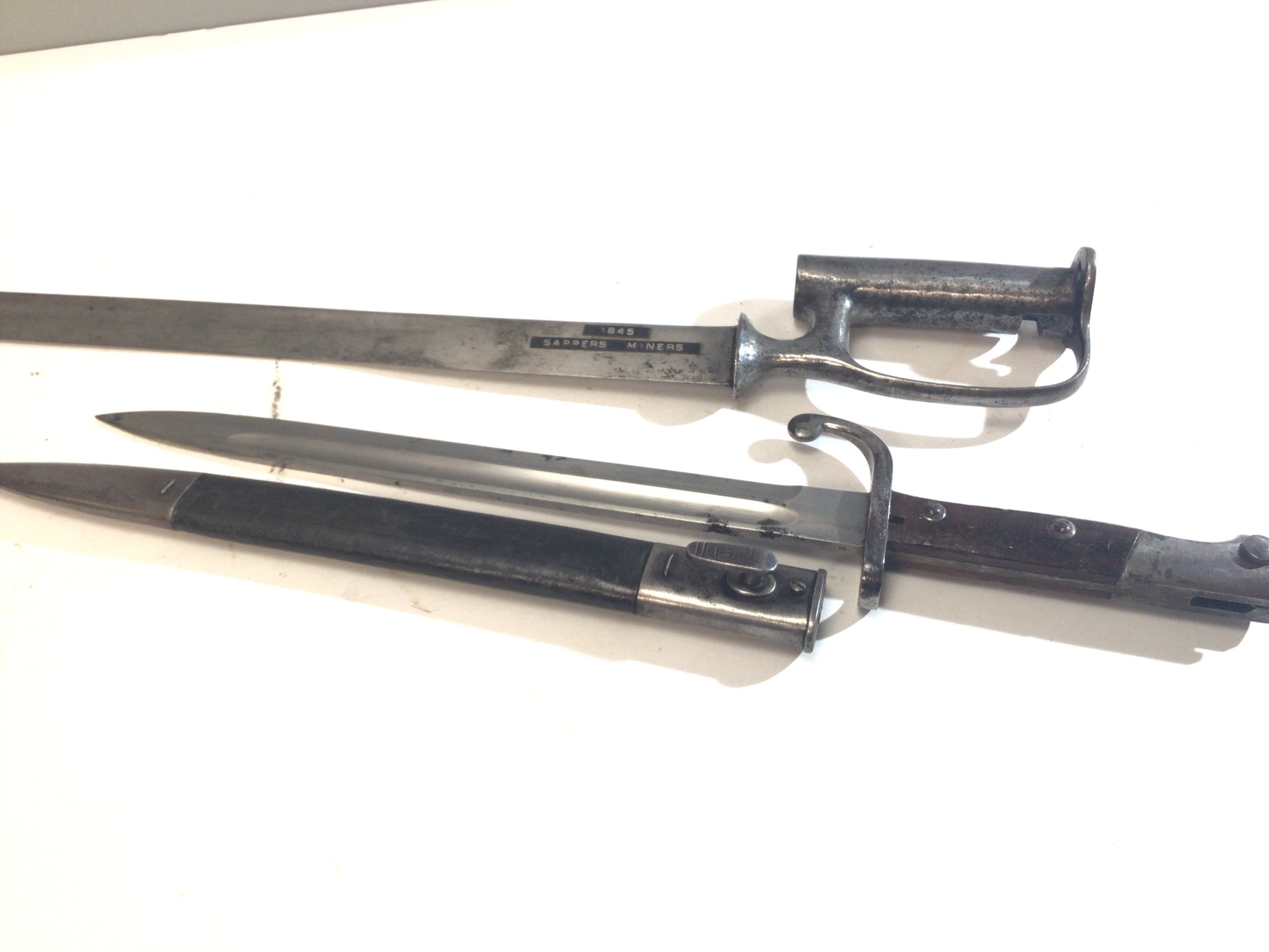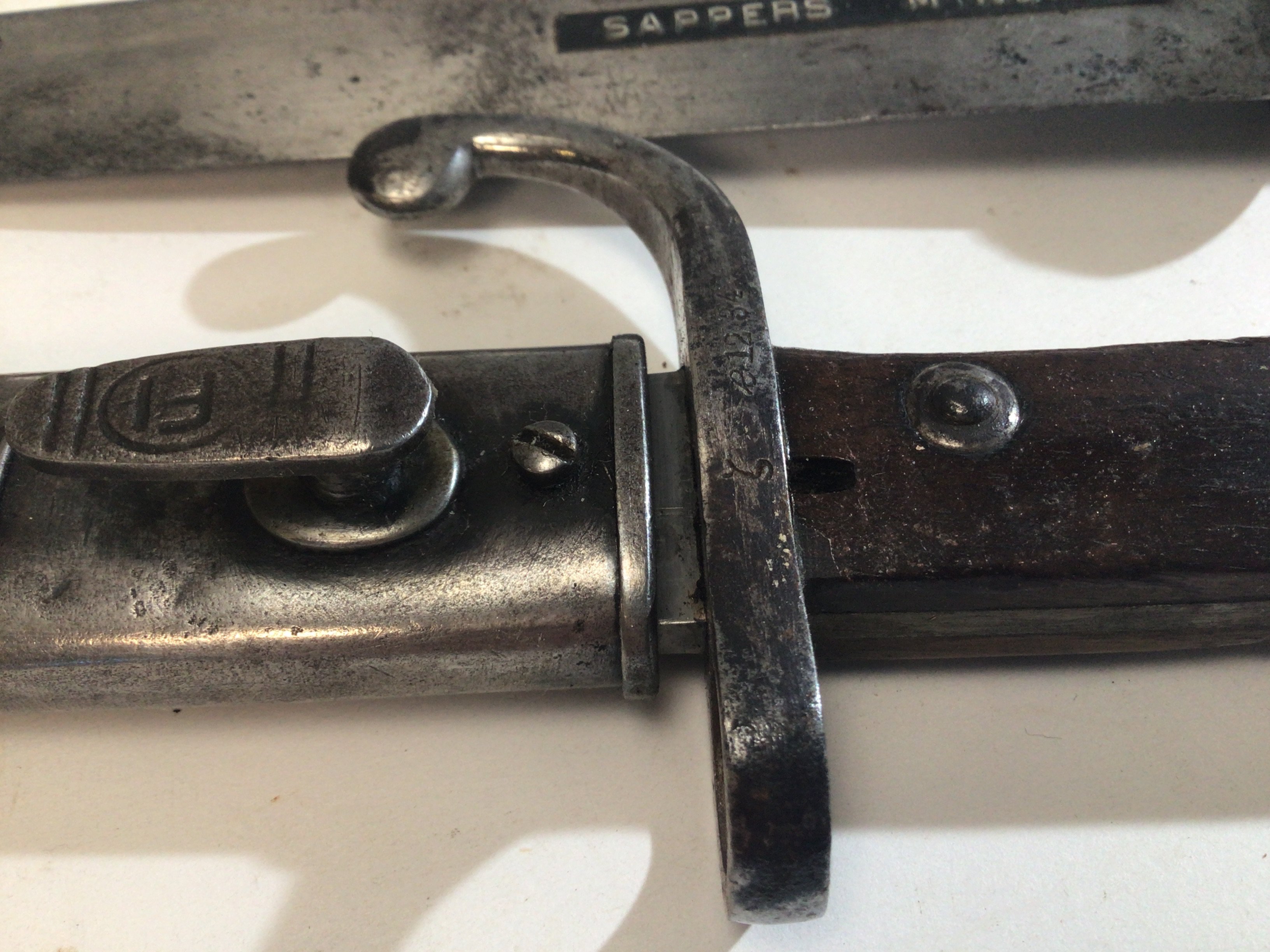 A 1907 pattern British bayonet with hook quilon with stamp marks wood grip steel blade stamped B leather and metal bound scabbard stamped on the clip F1. and a larger socket bayonet (2)