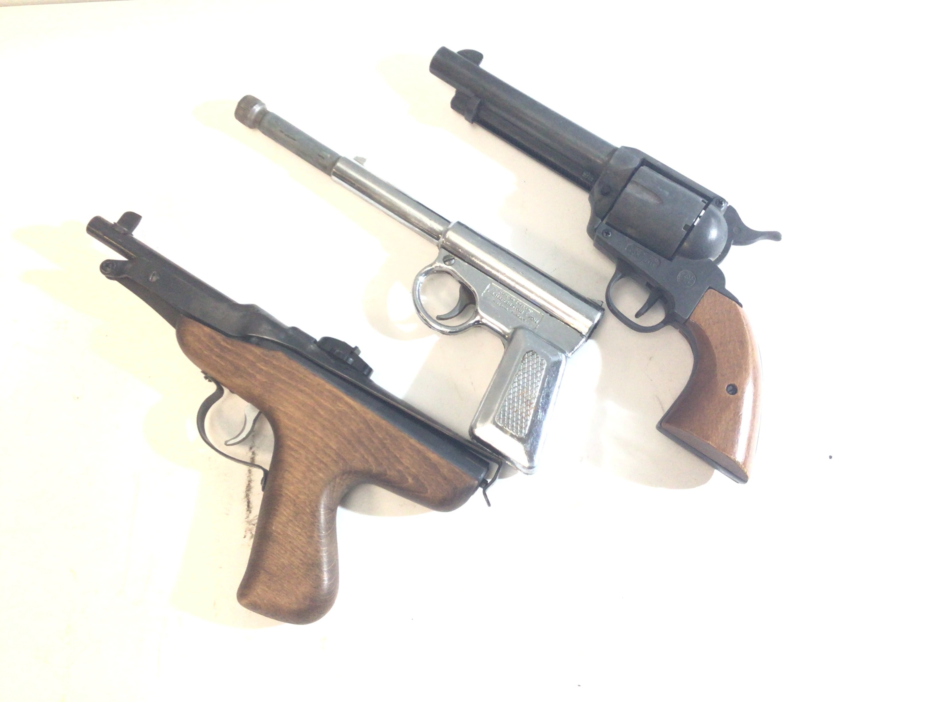 An Italian made replica revolver fires caps blanks stoped barrel. A chrome British made spud gun and a small Diana Mark lV air target pistol (3)