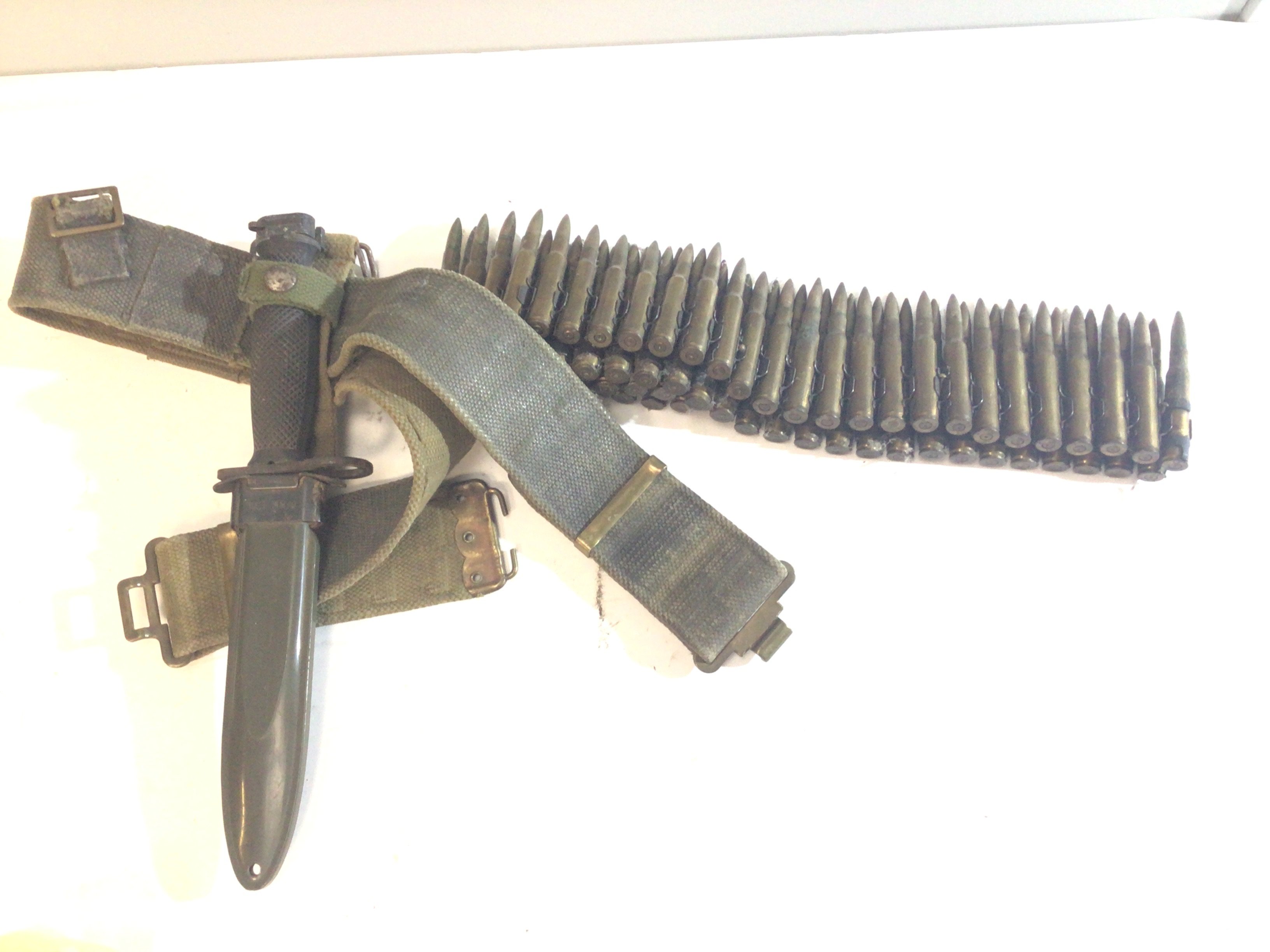 An American M8A1 bayonet with attached webbing and a belt of inert machine gun shell case bullets.