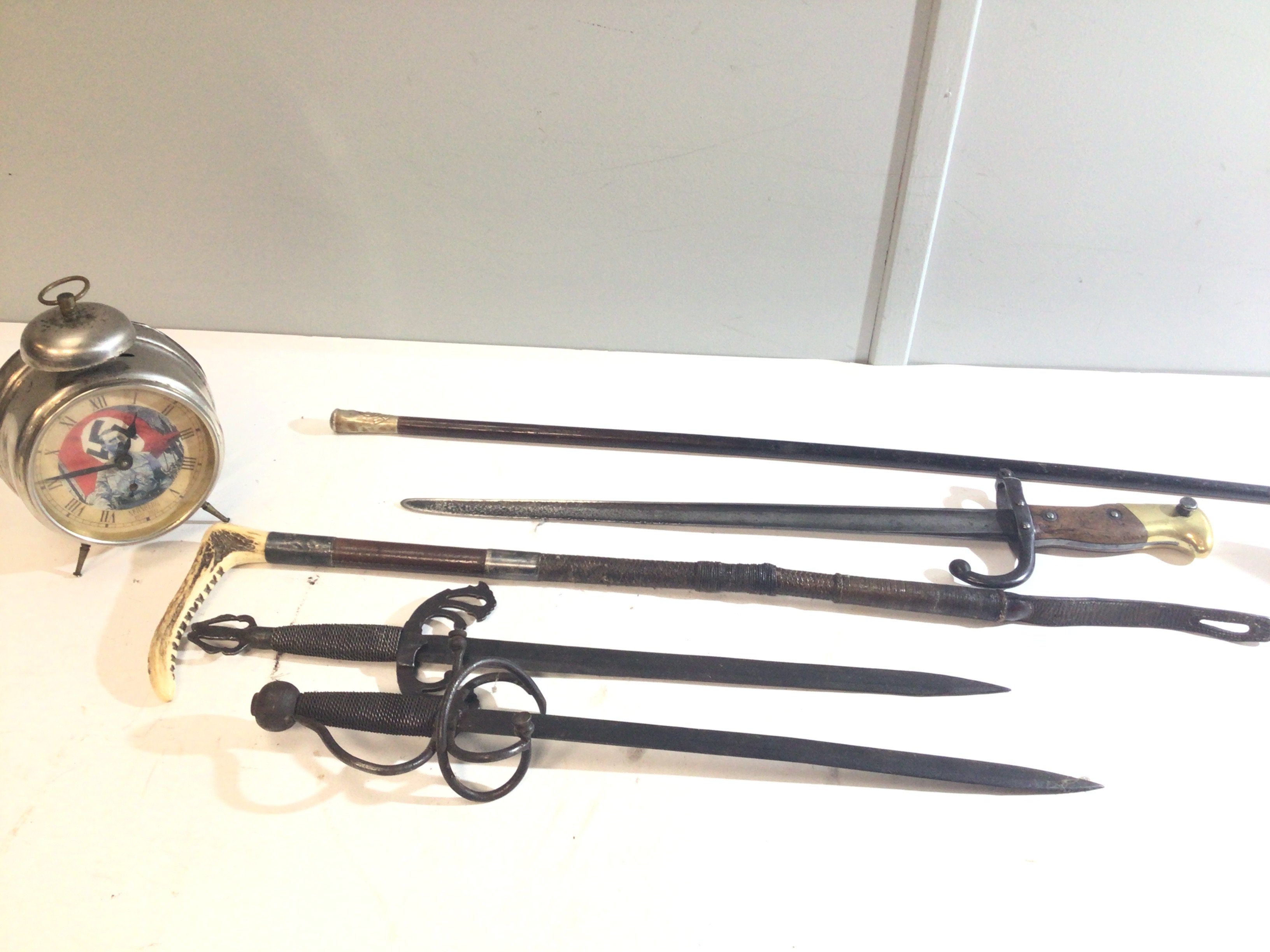 An 1887 pattern bayonet a swagger stick Royal Engineers a silver mounted riding crop an alarm clock and two short ornamental swords.