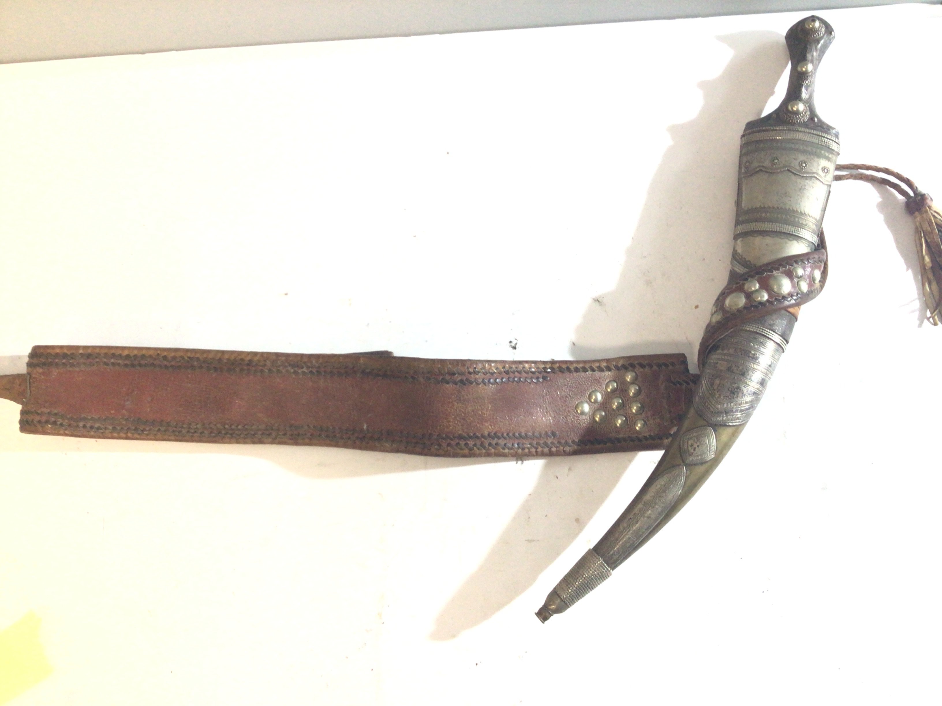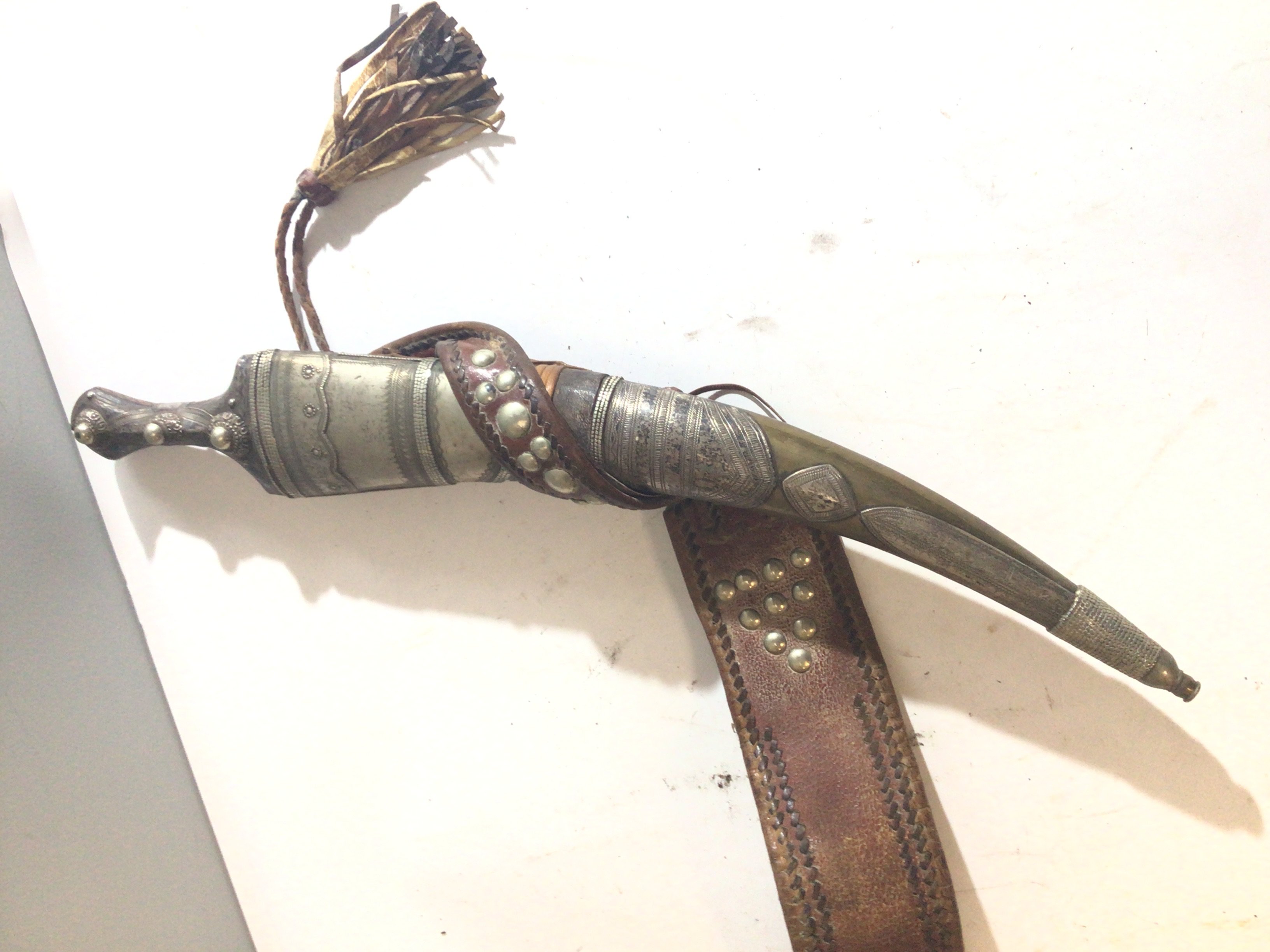 An Antique Arabian Sabilki knife brass and slivered metal scabbard with attached leather belt.