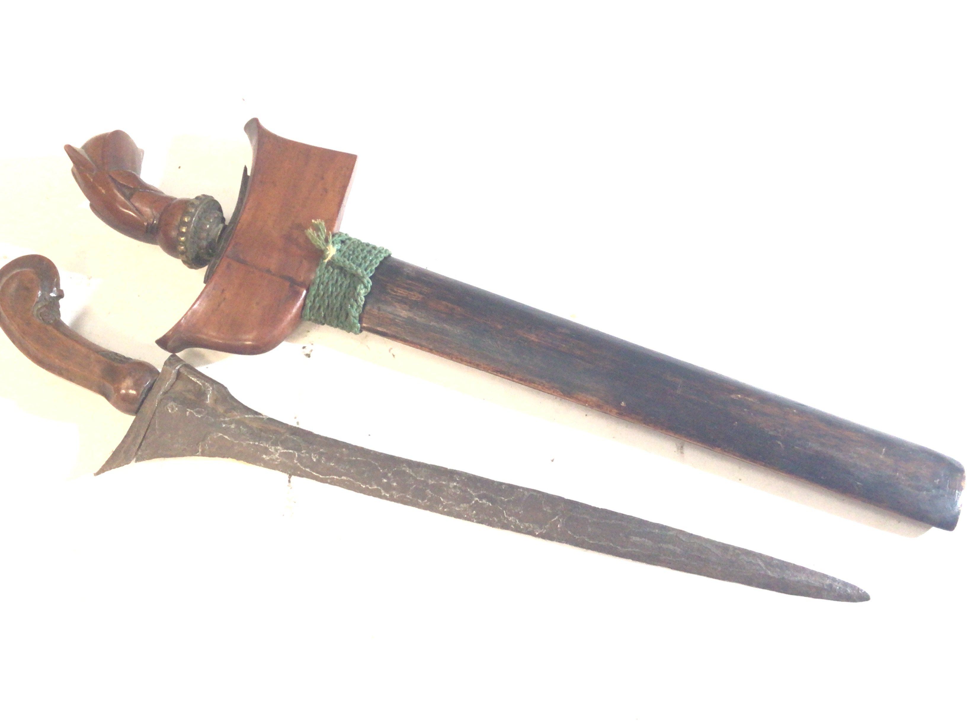 A late 19th or early 20th century Indonesian Kris with a Damascus type wave edge blade and wooden handle (2)