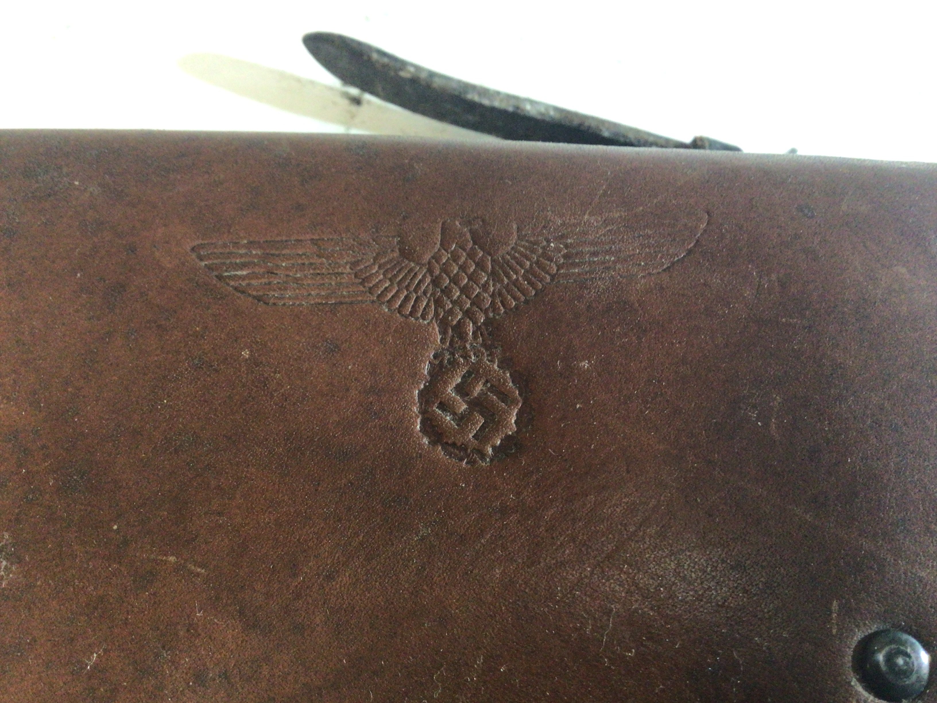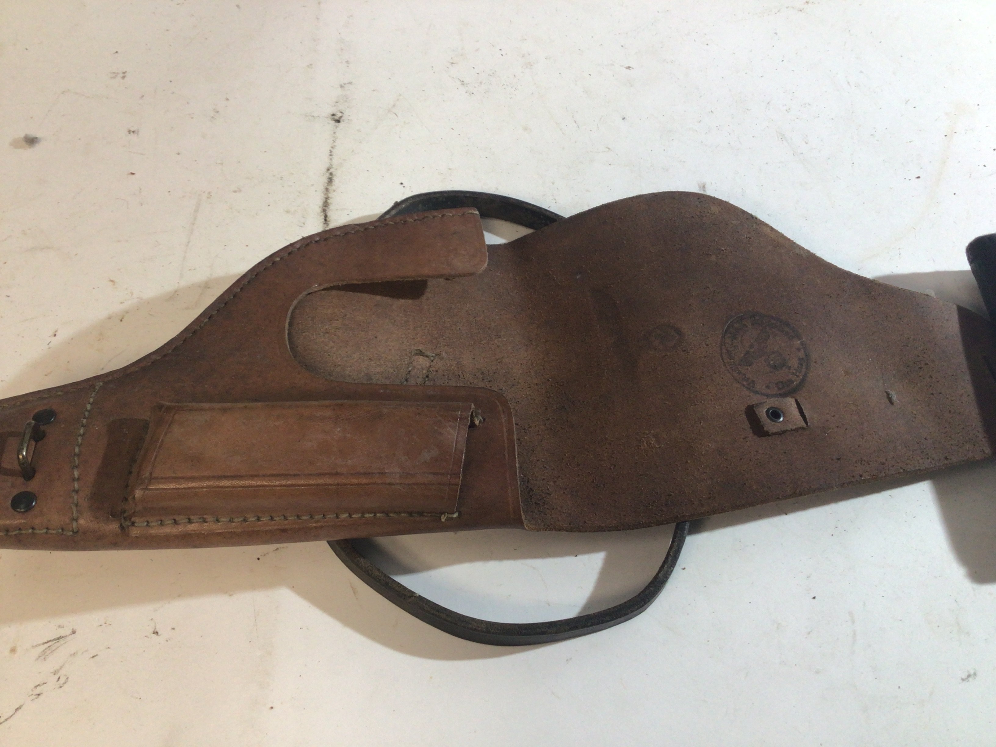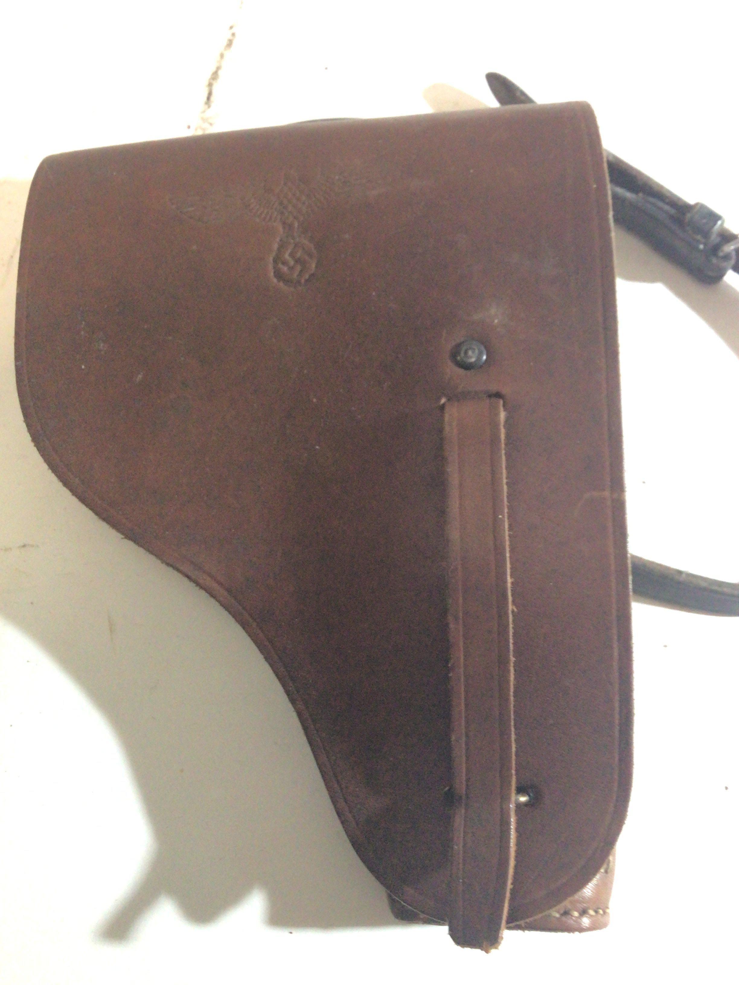 A French II world war Mab leather pistol holder with a section for spare magazine. These were captured and used by the German Third Reich following the invasion of France then subsequently stamped with German Eagle. Also with an internal stamp.