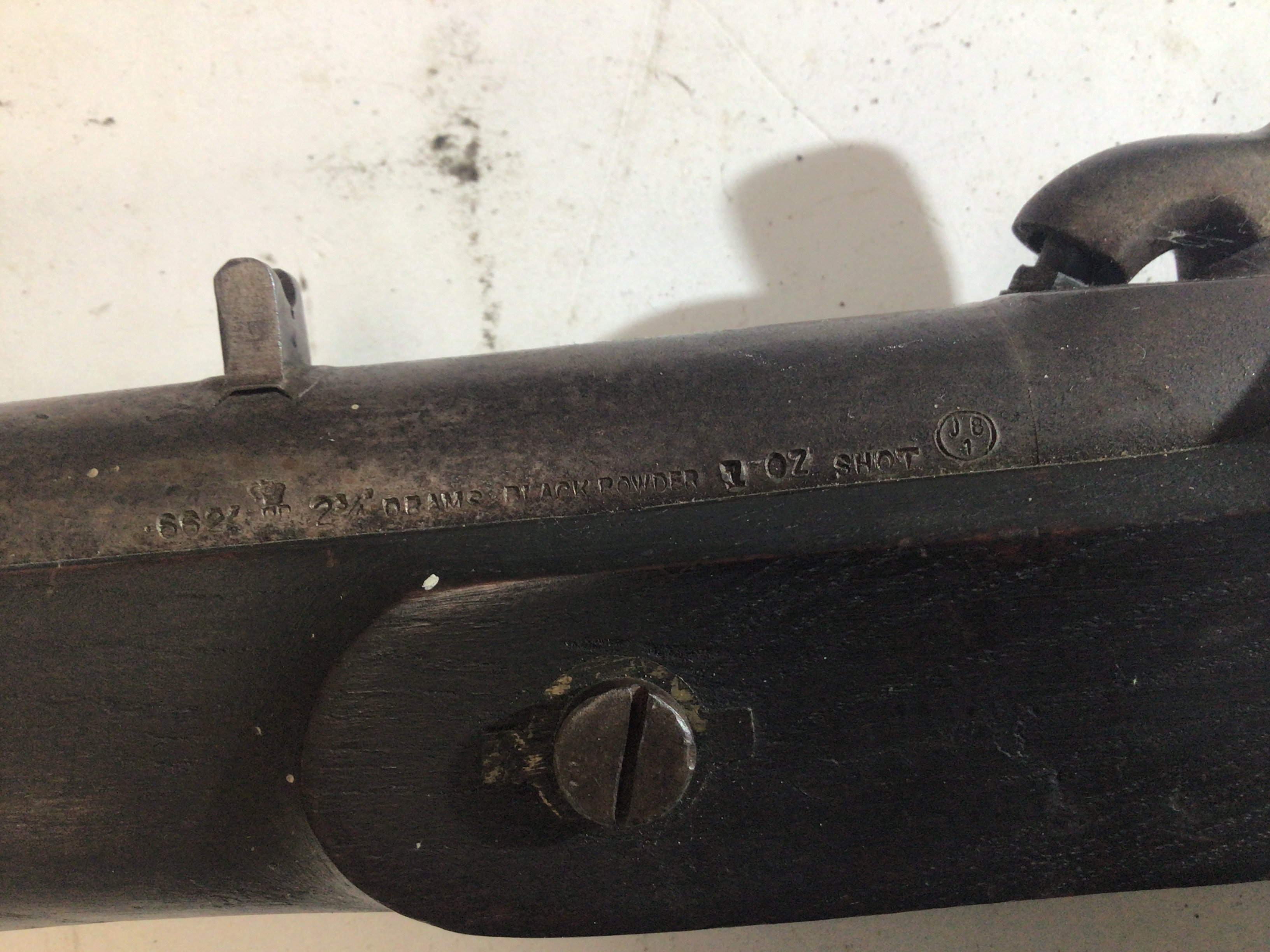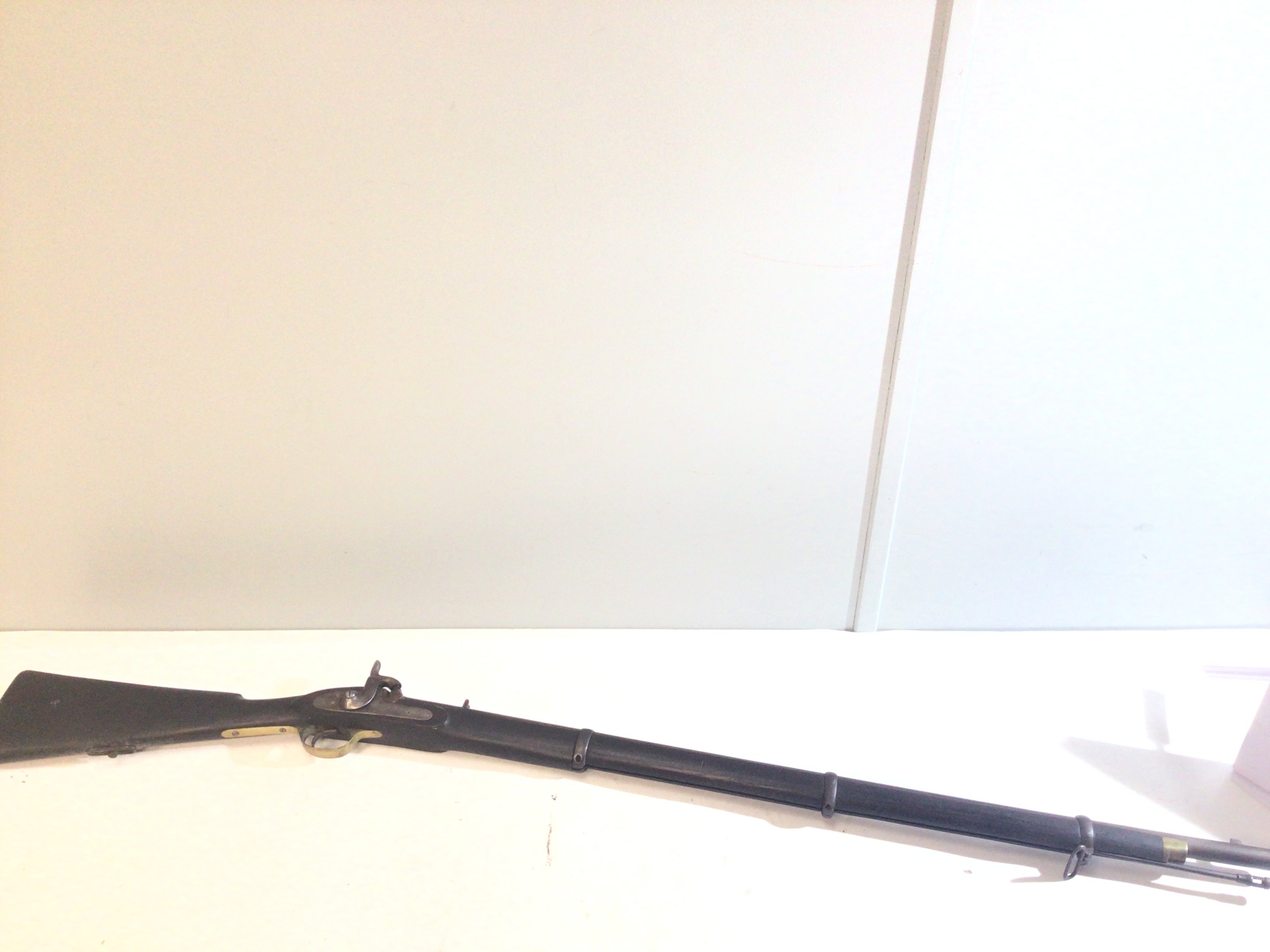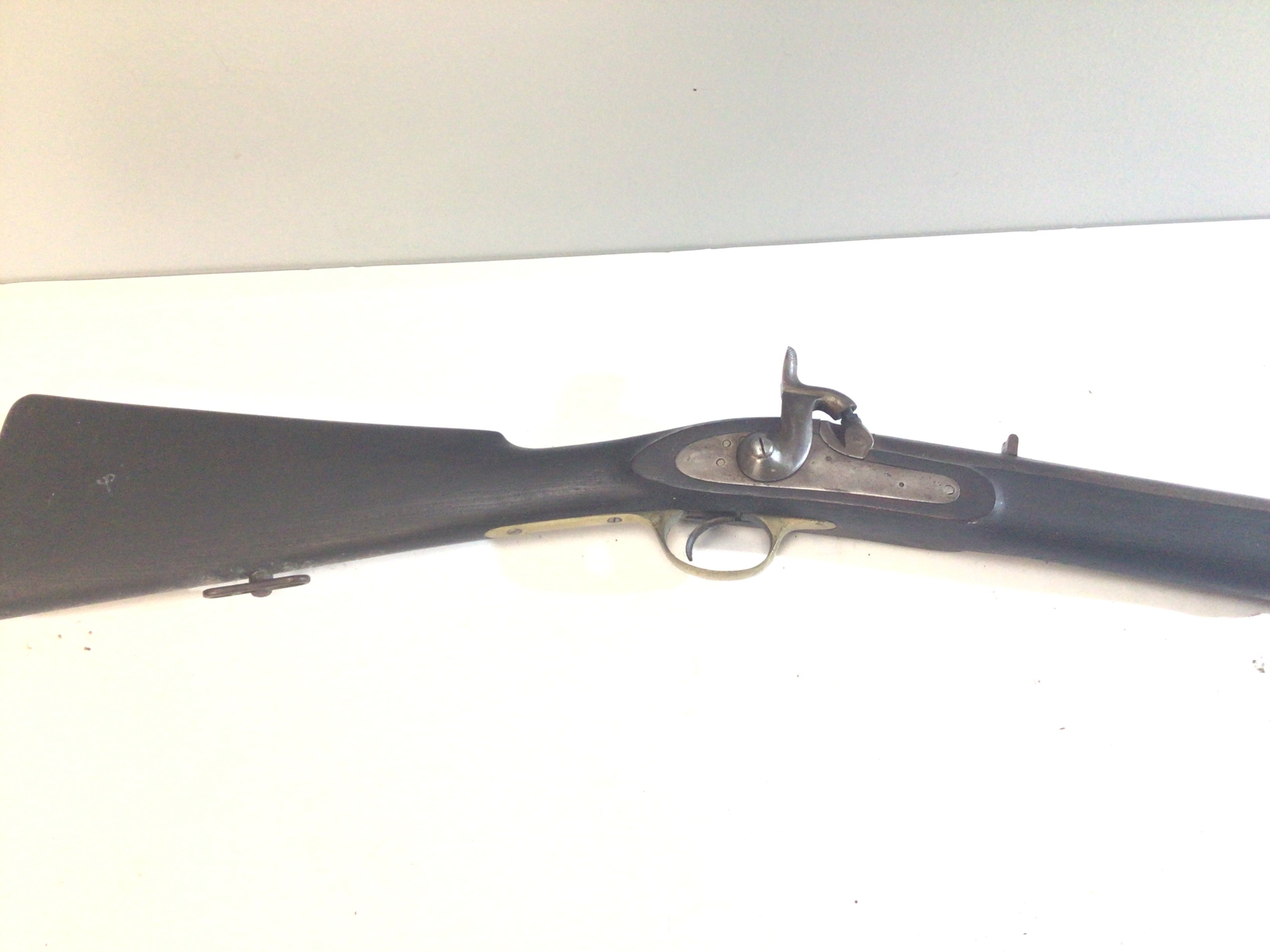 An Antique Percussion muzzle load rifle full length stock with steel action and brass trigger guard unmarked action.