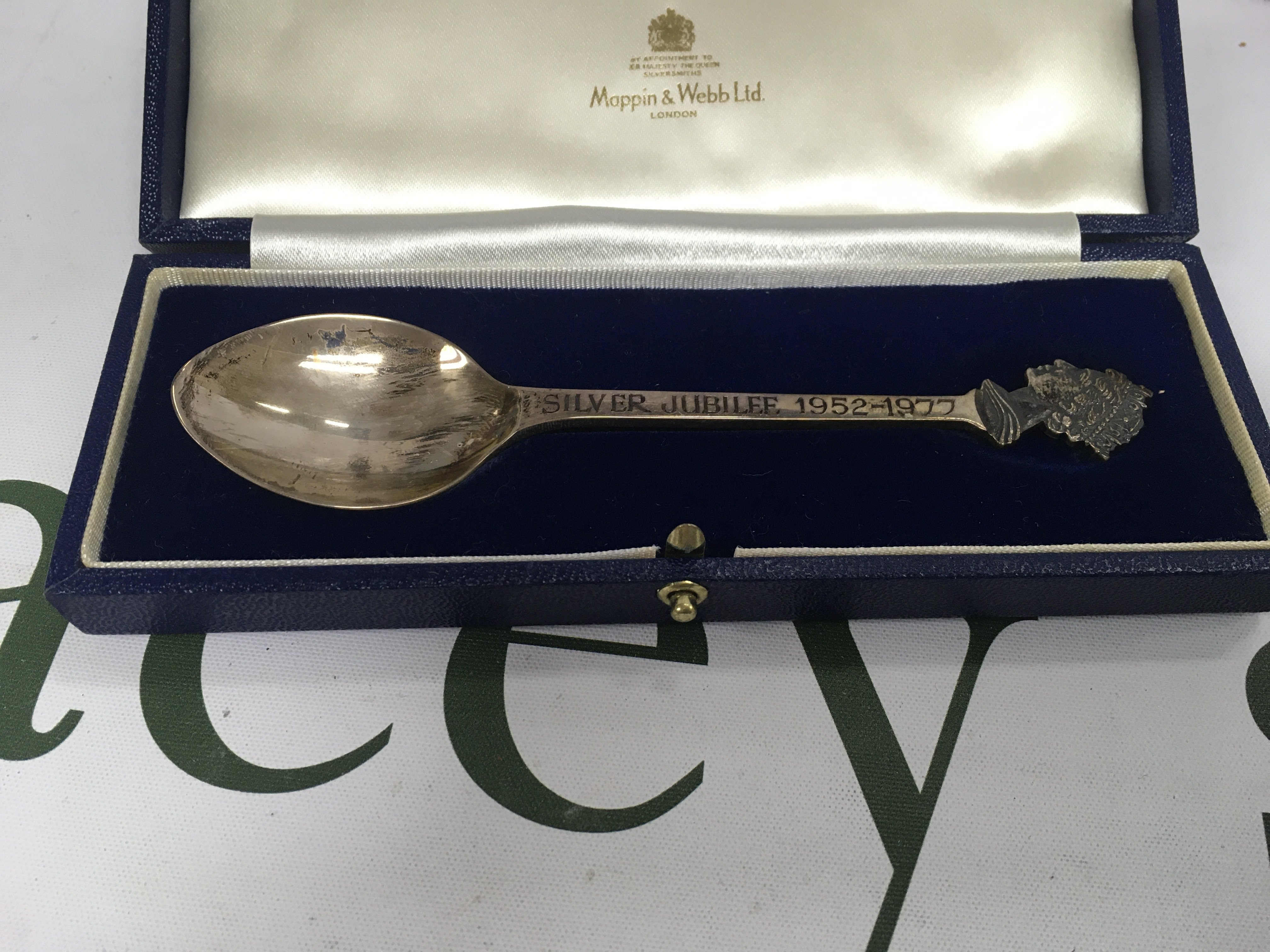 A comemorative tray and two commemorative cased silver spoons.
