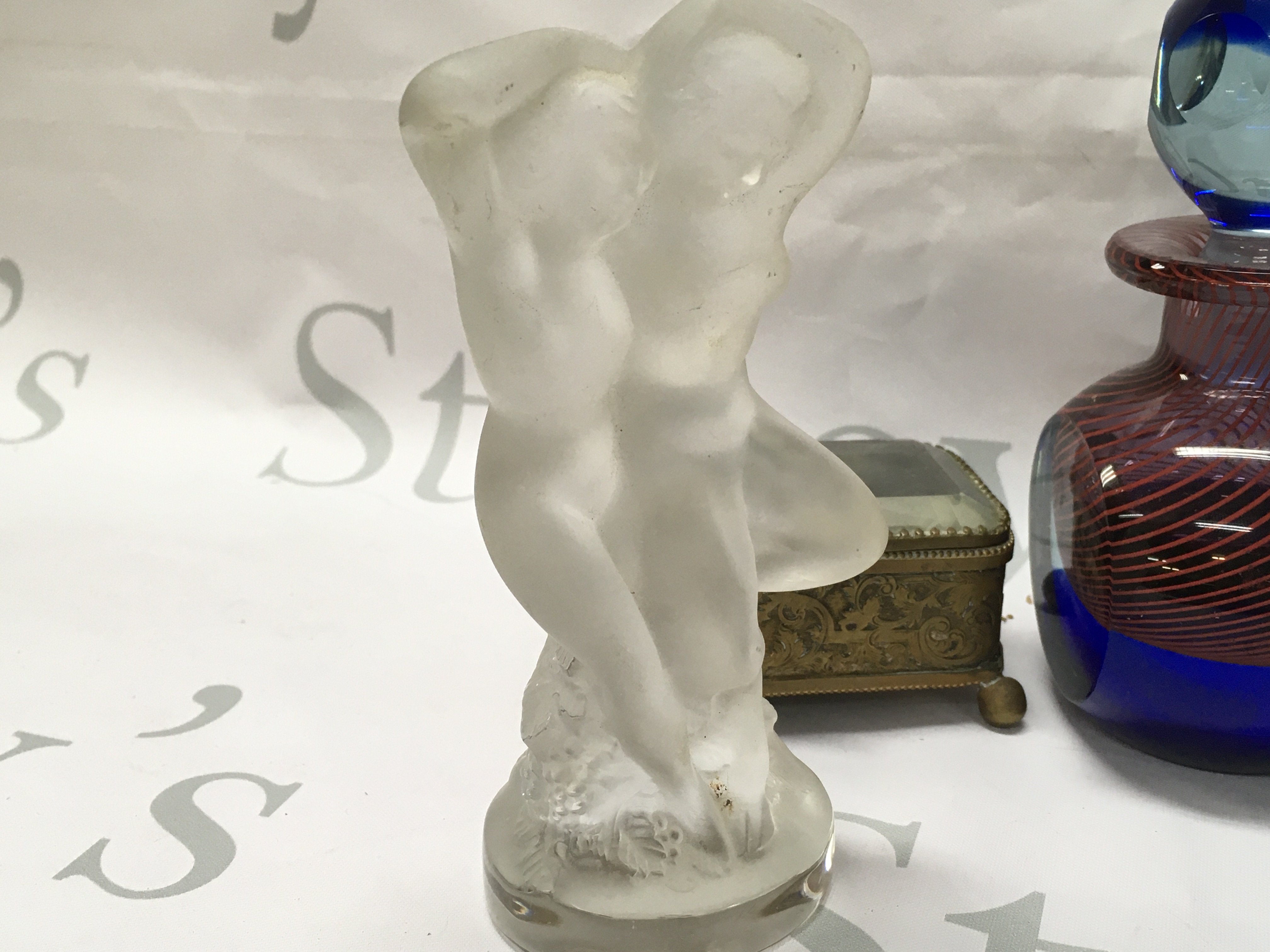 A collection of art glass ceramics including a French mid 20th century design Lalique woman figure group, Mats Jonasson paperweight, Merimakko glasses, Poole vase , silver hallmarked base glass vase