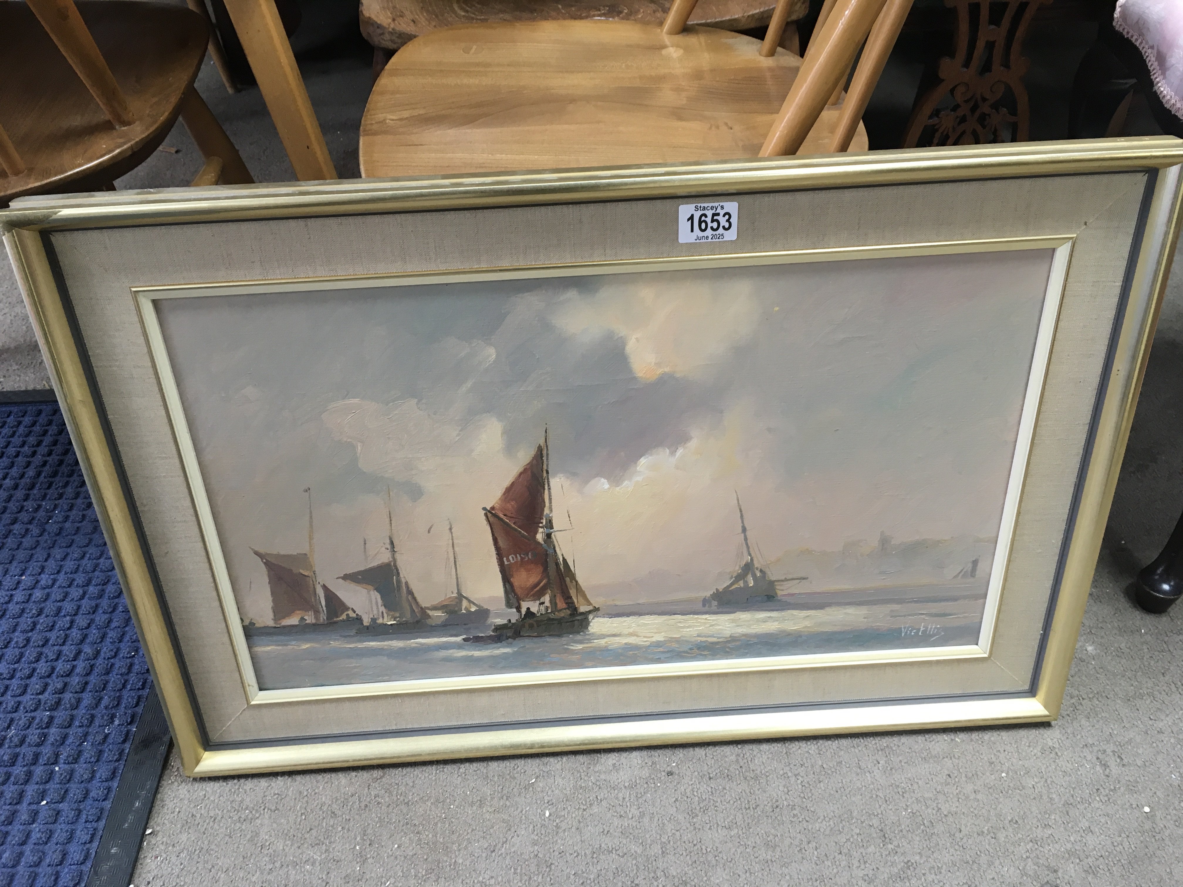 A painting of the thames barges, signed Vic Ellis. Approx measurements 73cmx48cm.