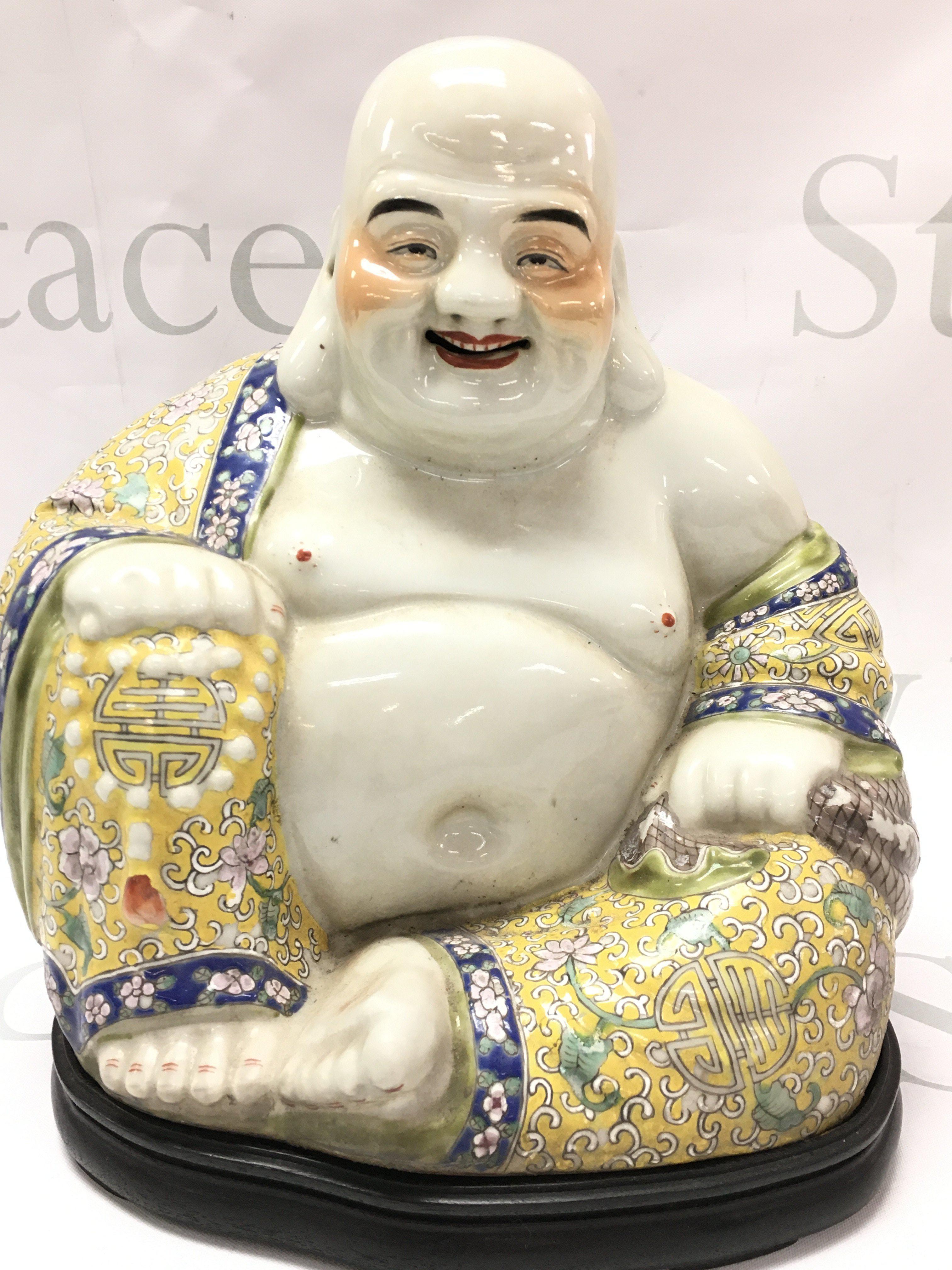 A Chinese ceramic Famille Rose Buddah figure, 25cm tall. Some chips in the paintwork. This lot cannot be posted