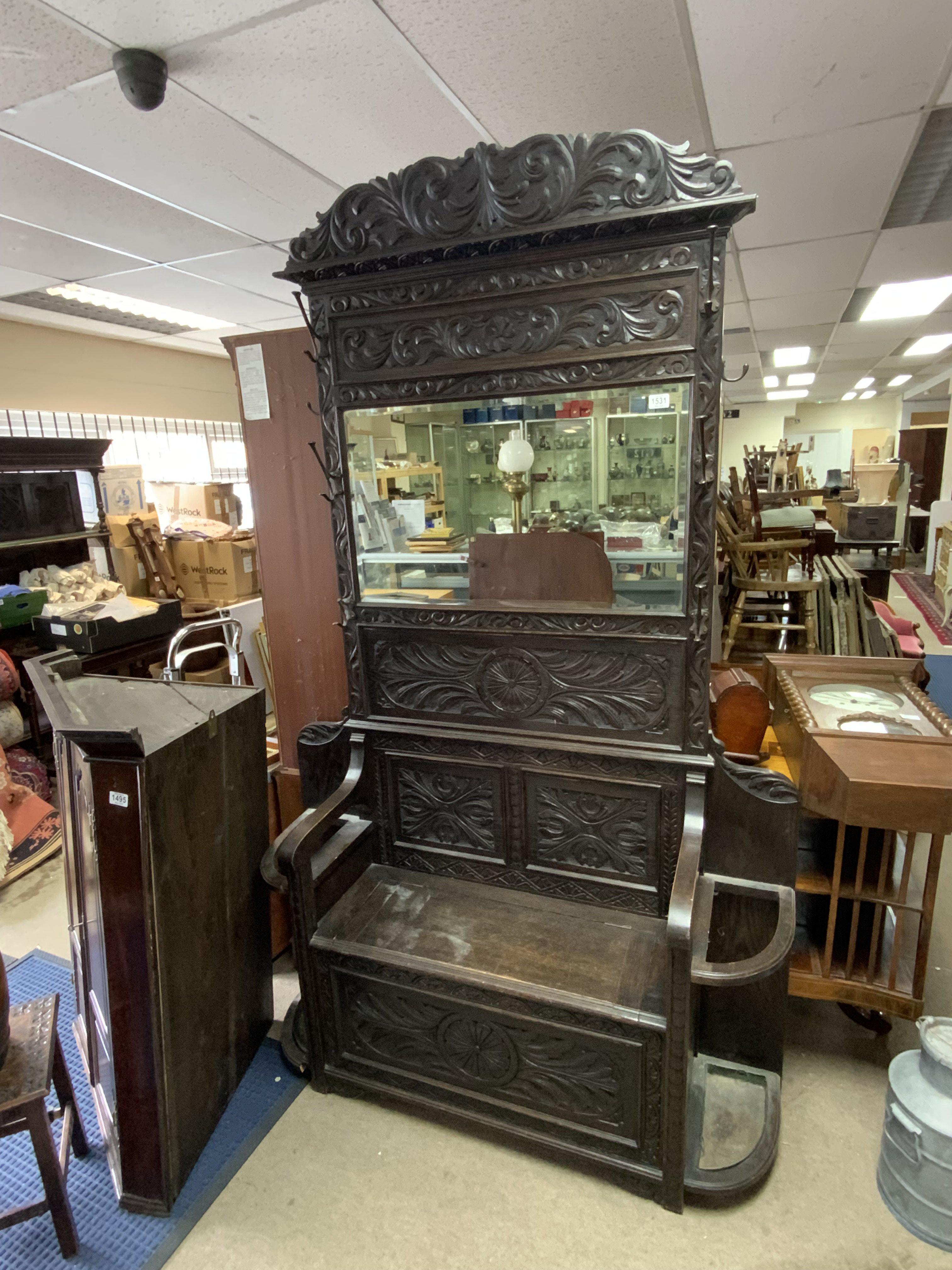 a large Victorian oak hall stand/seat with mirrored back. 218cm x 131
