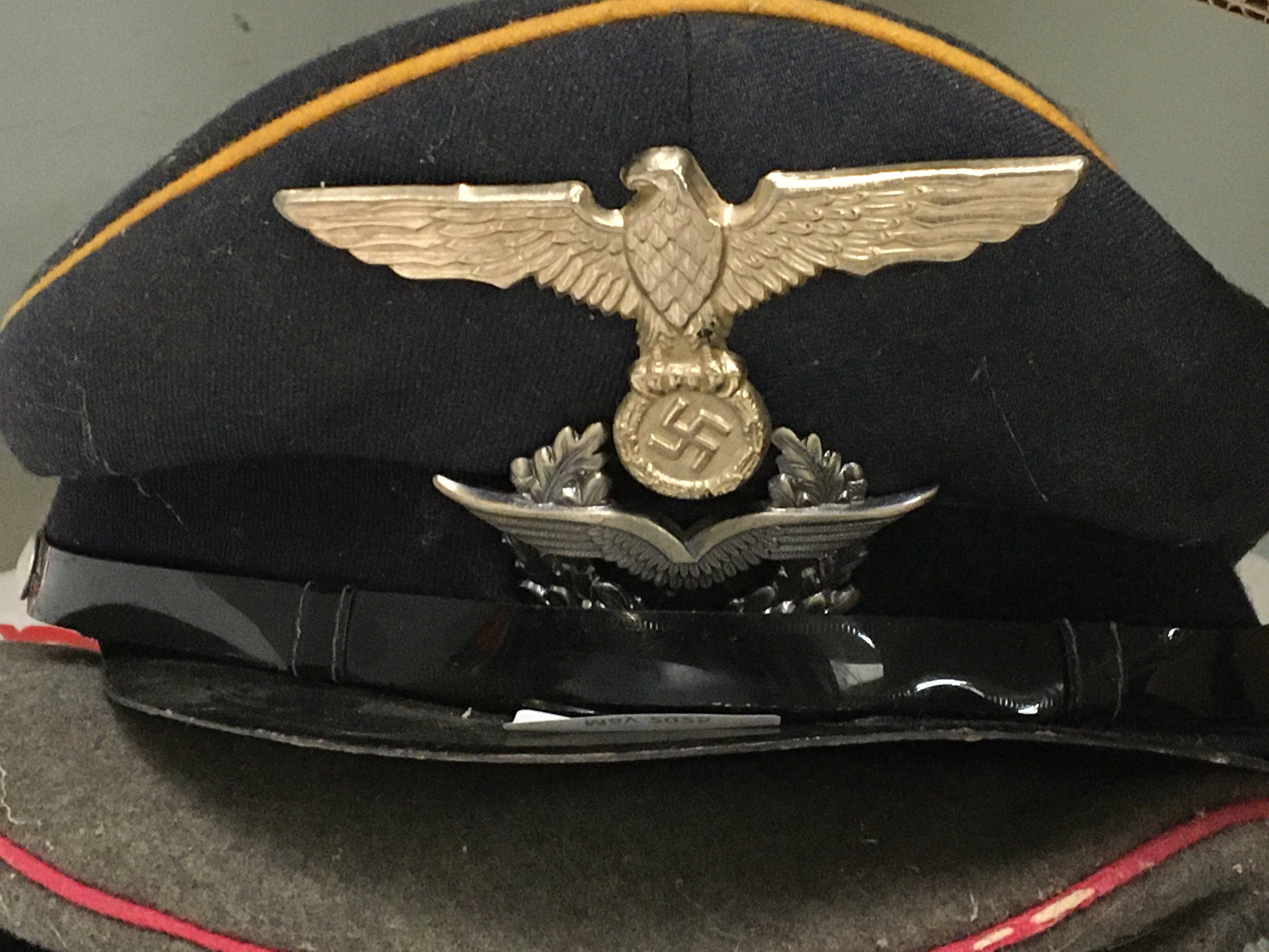 A German Third Reich officers Waffen SS panzer hat with rose pink piping damaged vizier one other SS officers hat and a German Luftwaffe officers hat these appear to be genuine but show signs of wear (3)