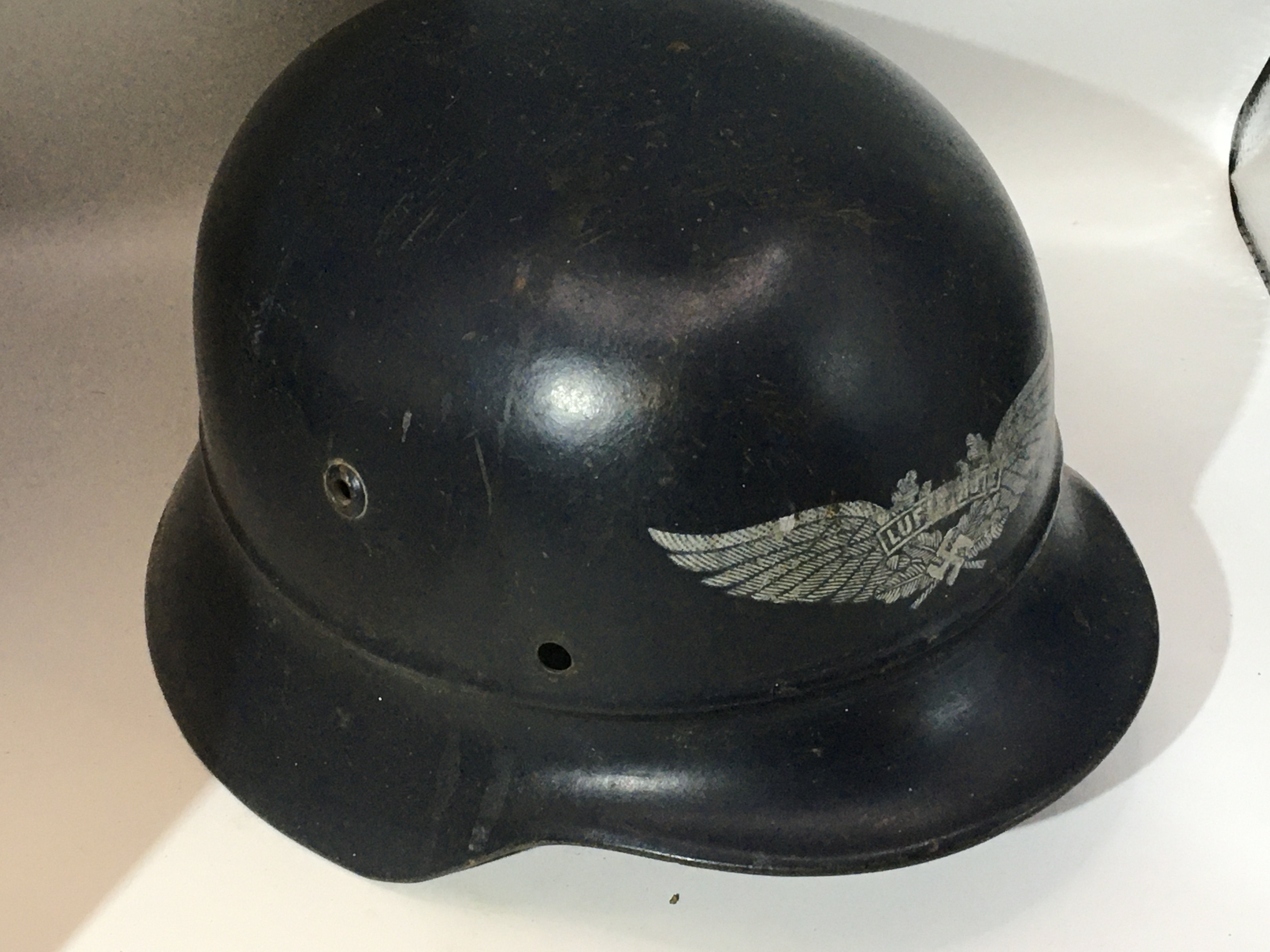 A German Third Reich Luftwaffe helmet with an unusual front decal double winged and central Luftwaffe with a raised press rib above the helmet peak. no lining. With stamped EF64 and 675.