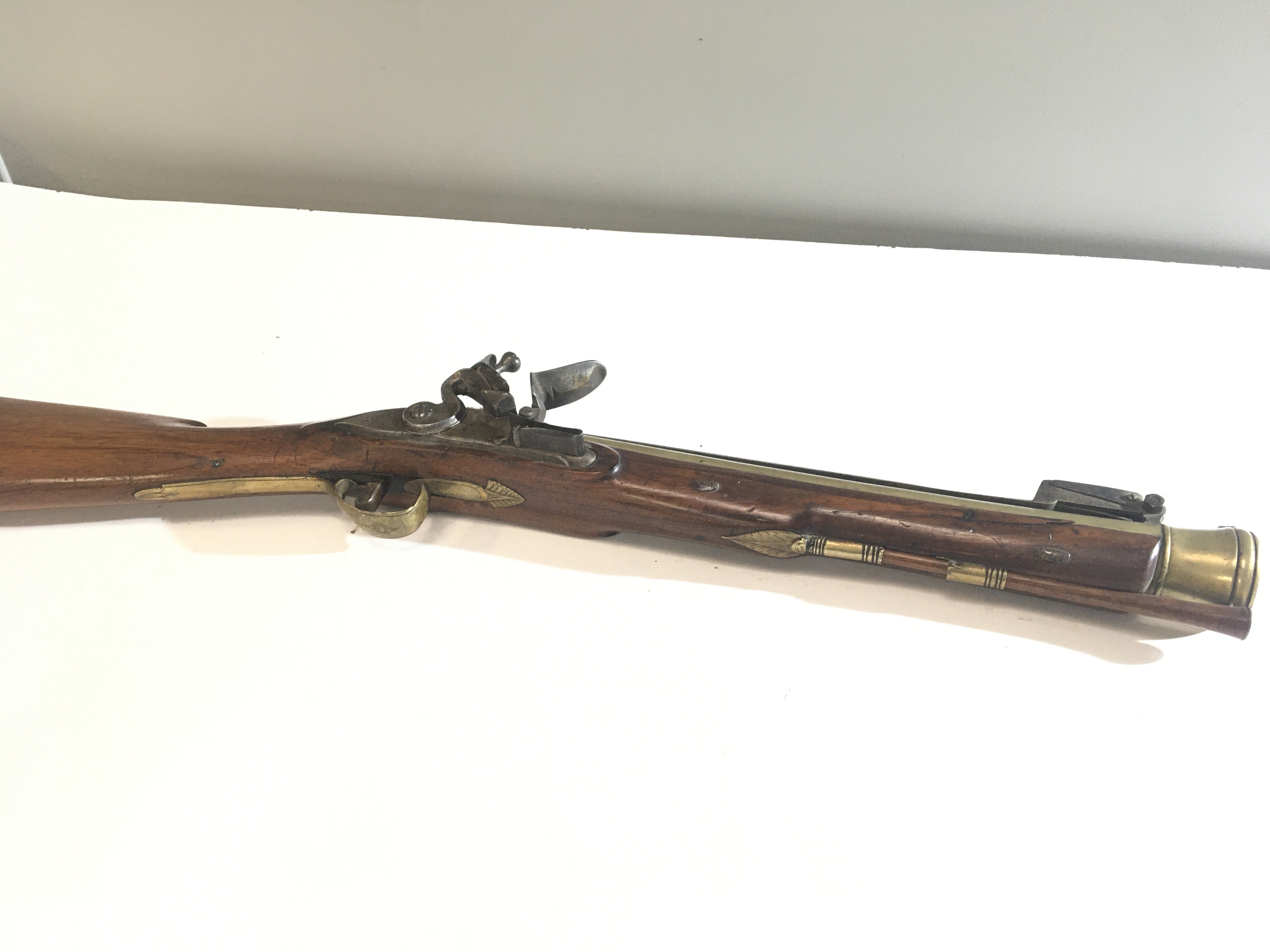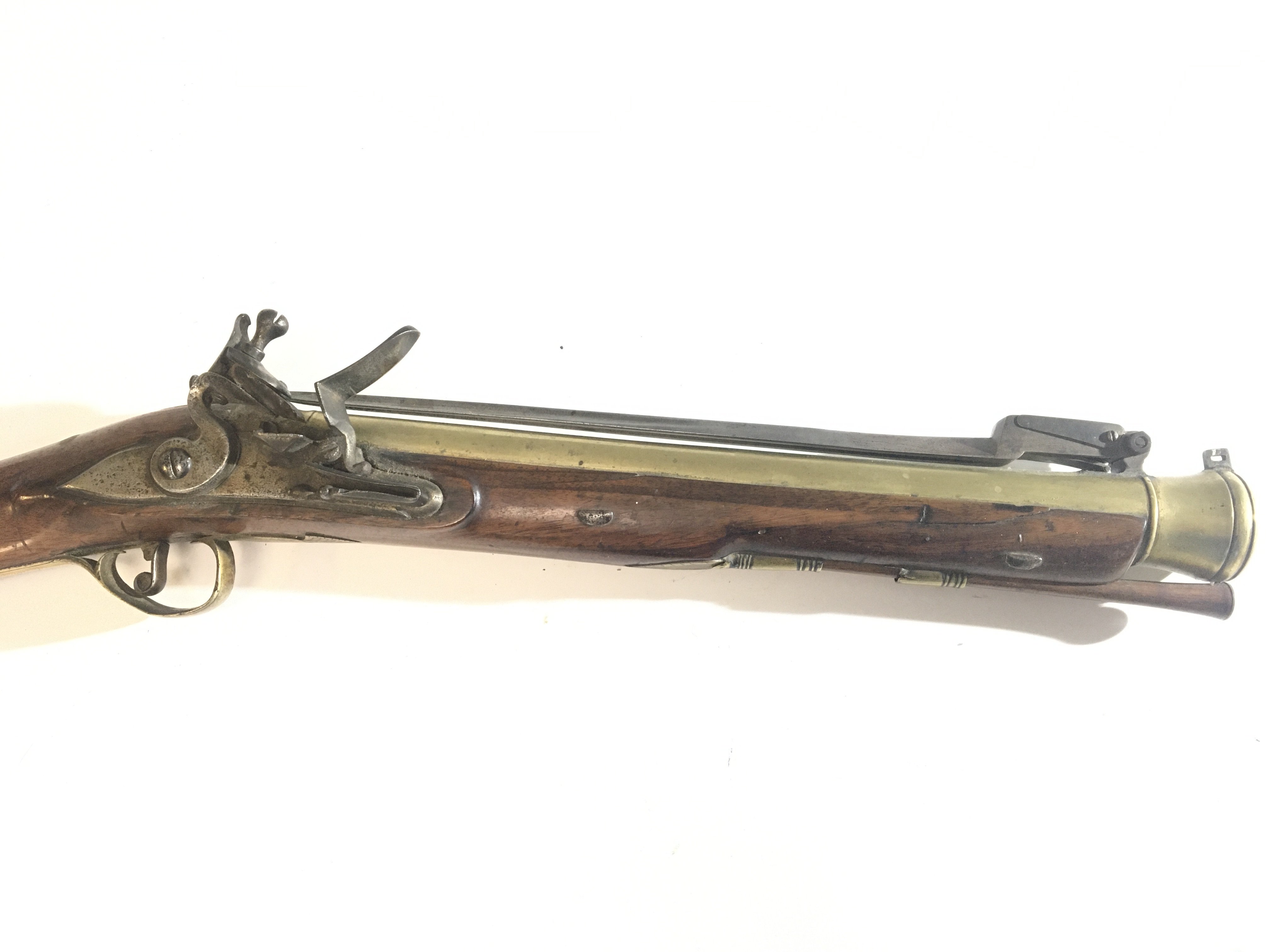 A late 18th century British Blunderbuss with brass canon barrel full length walnut stock brass fittings steel action and with a long flick sprung bayonet the barrel with proof house marks nice condition functional action.