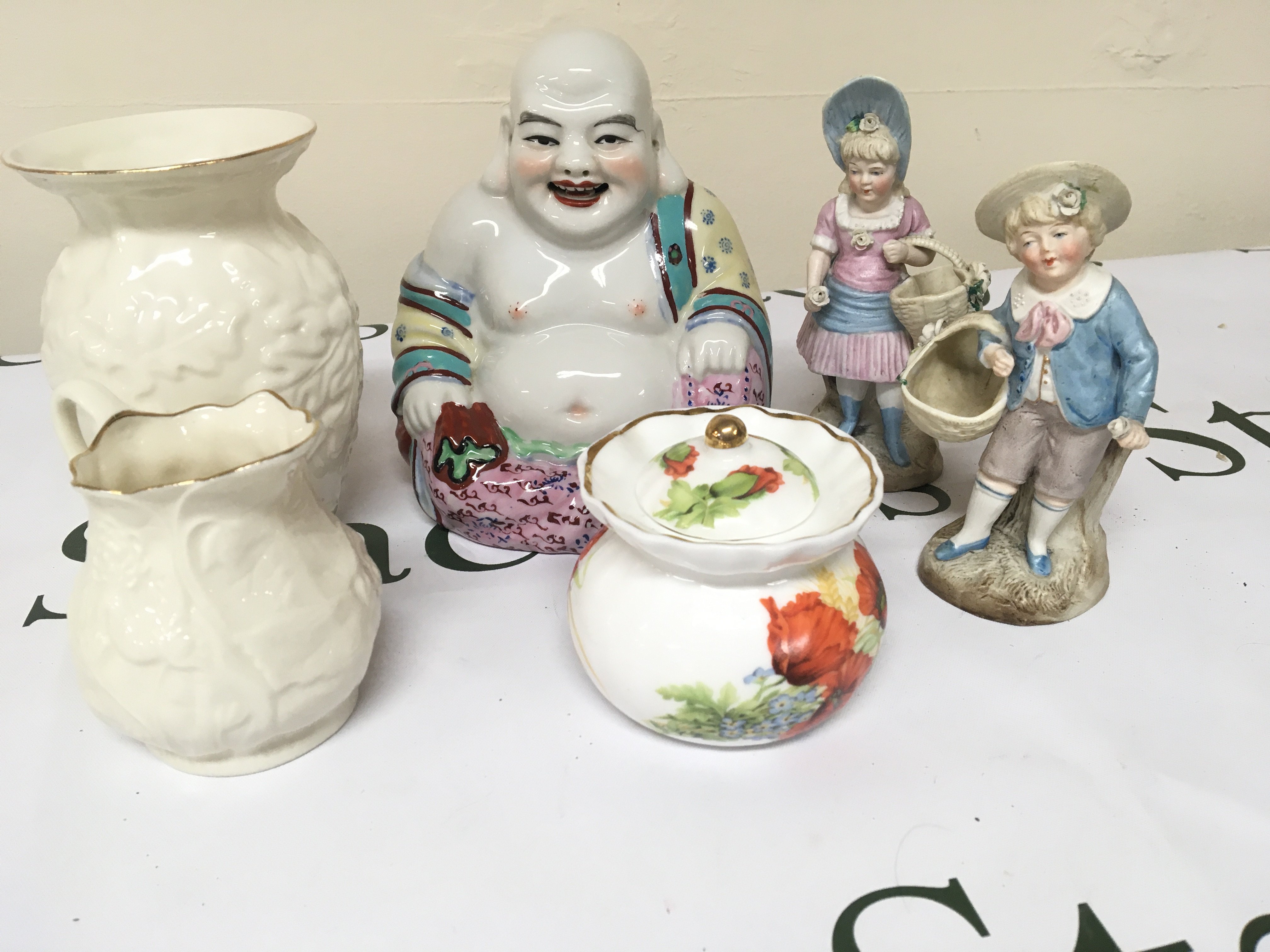 A pair small late Victorian bisque figures Belleek vase and jug and other ornaments. NO RESERVE