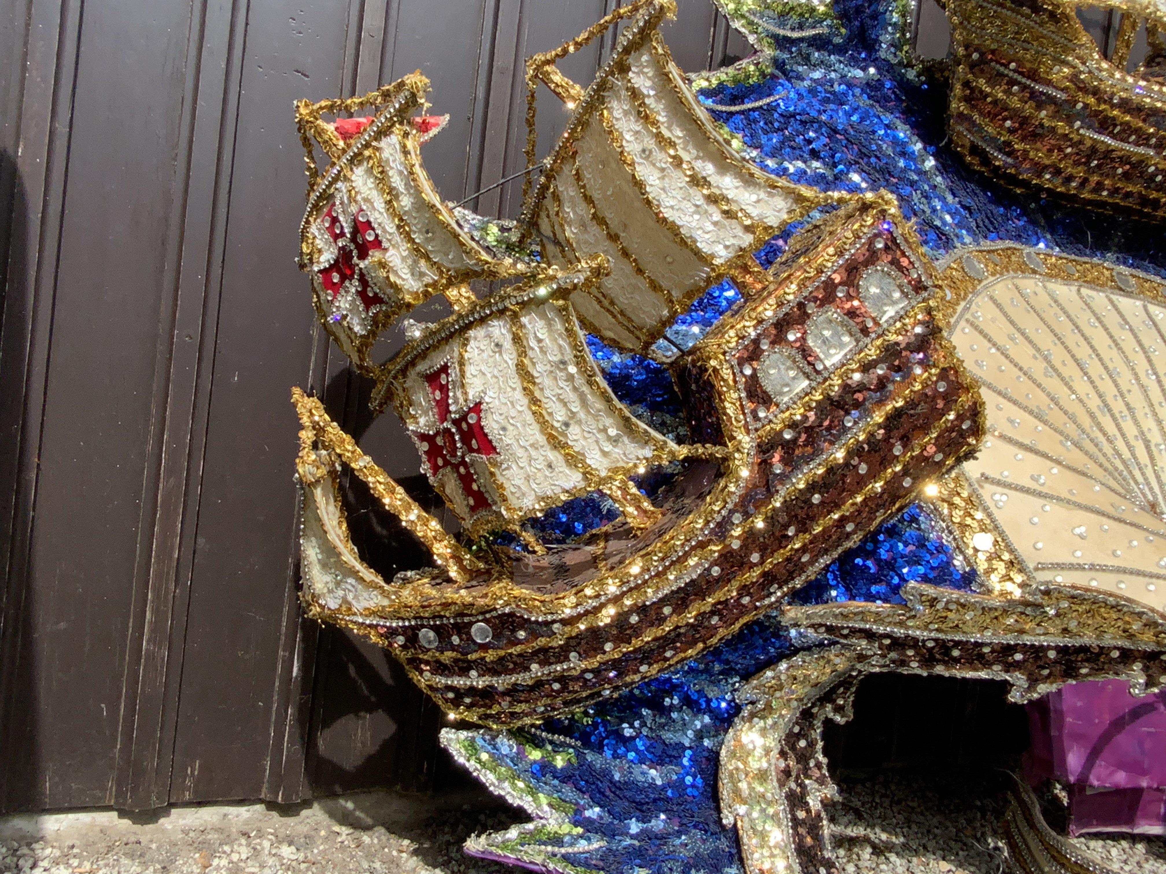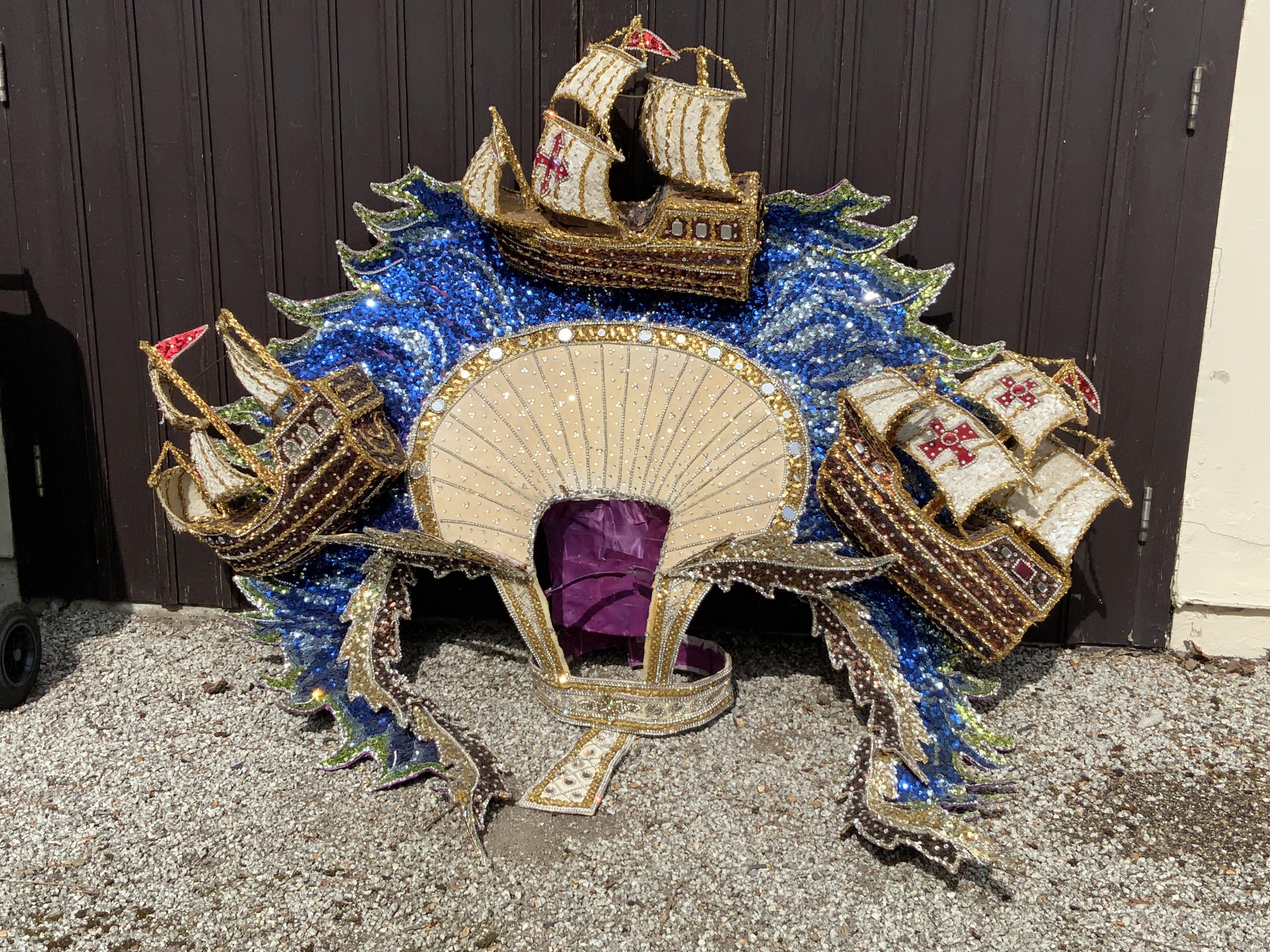 An elaborate Mardi Gras costume the theme of the three Christopher Columbus galleons Santa Maria, Nina and The Pinta, worn and made for the New Orleans Mardi Gras Circa 2010, Purchased at Vicky Vines Auction, Houston Texas. Wire framed and sequin covered. (A)