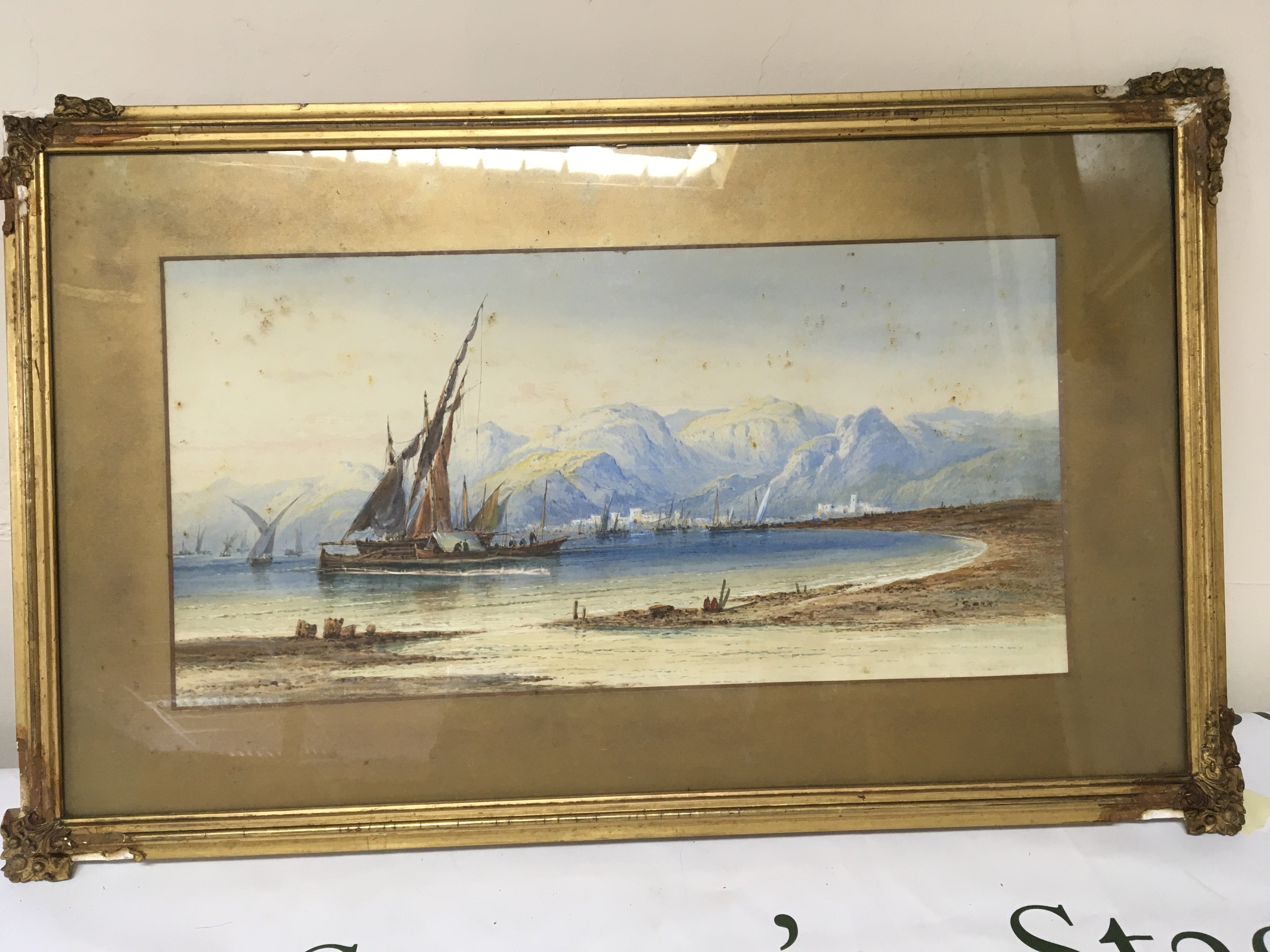 A 19th century watercolour study of moored sailing vessels within a bay with buildings and mountains beyond. Indistinctly signed. The dirt/foxing seems to be on the glass. Frame size 70x43cm. NO RESERVE