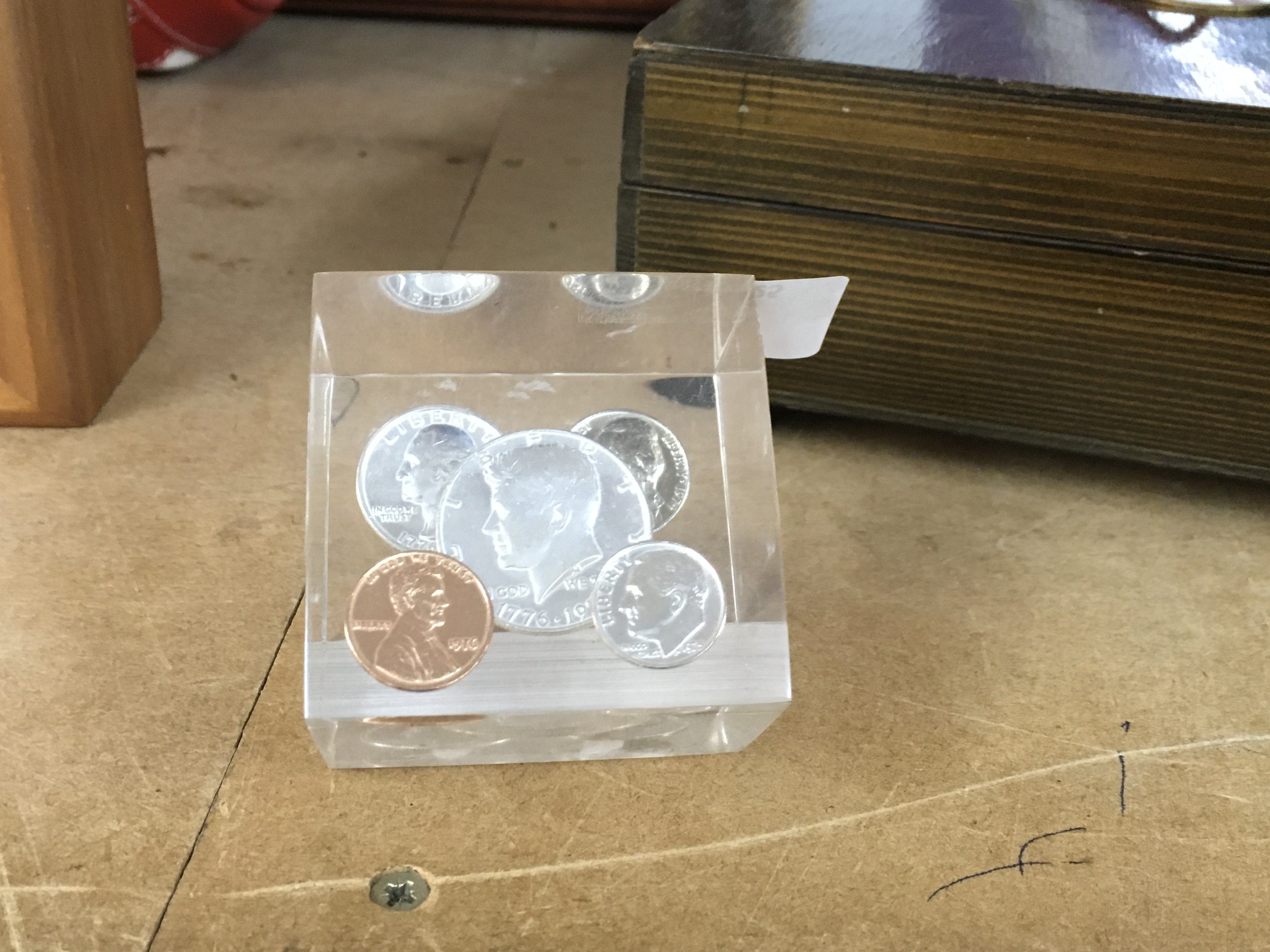 Square wooden clock with various 1881 and 1964 USA coins as markers around the clock face along with a resin cube filled with various USA coins from 1776 to 1976. NO RESERVE