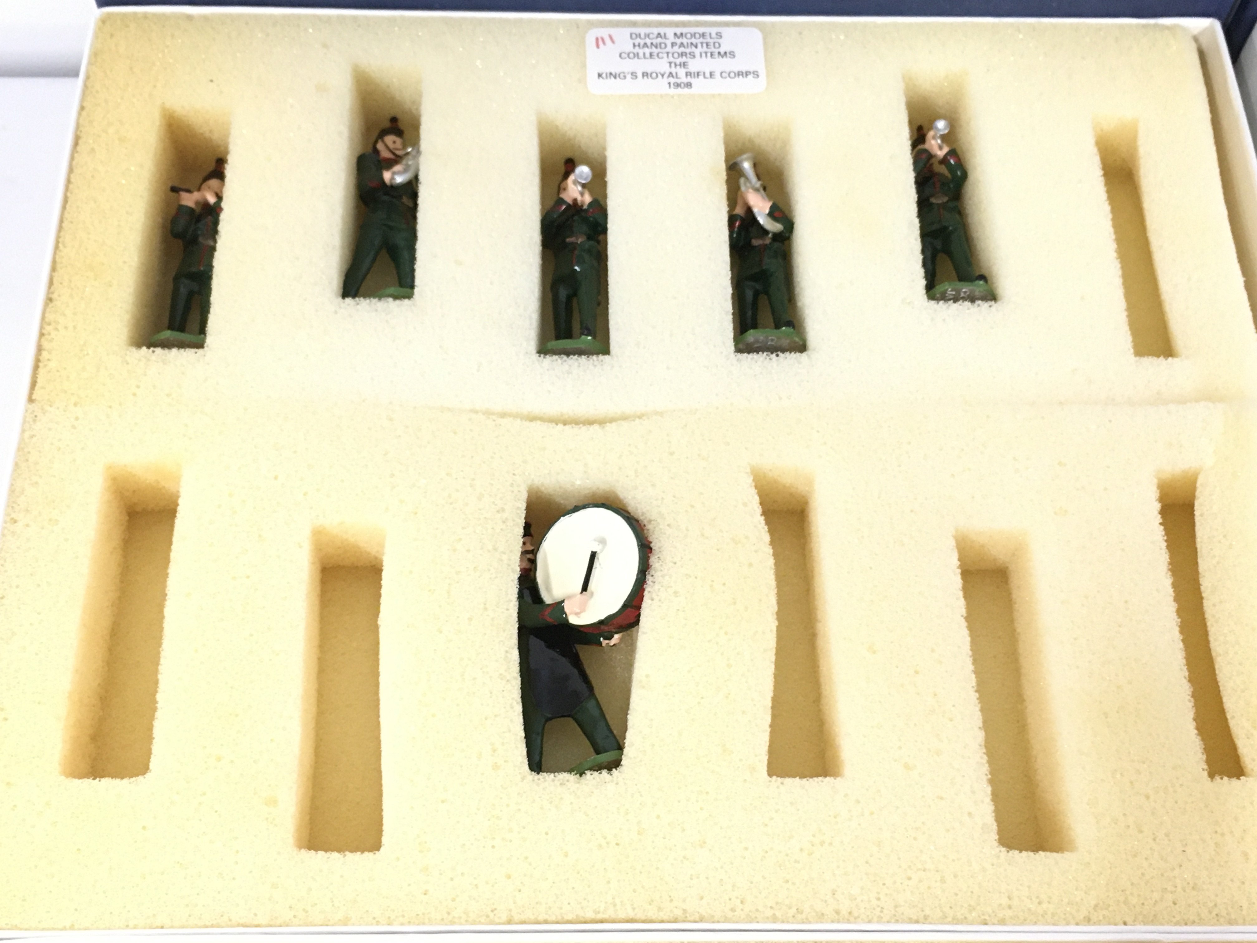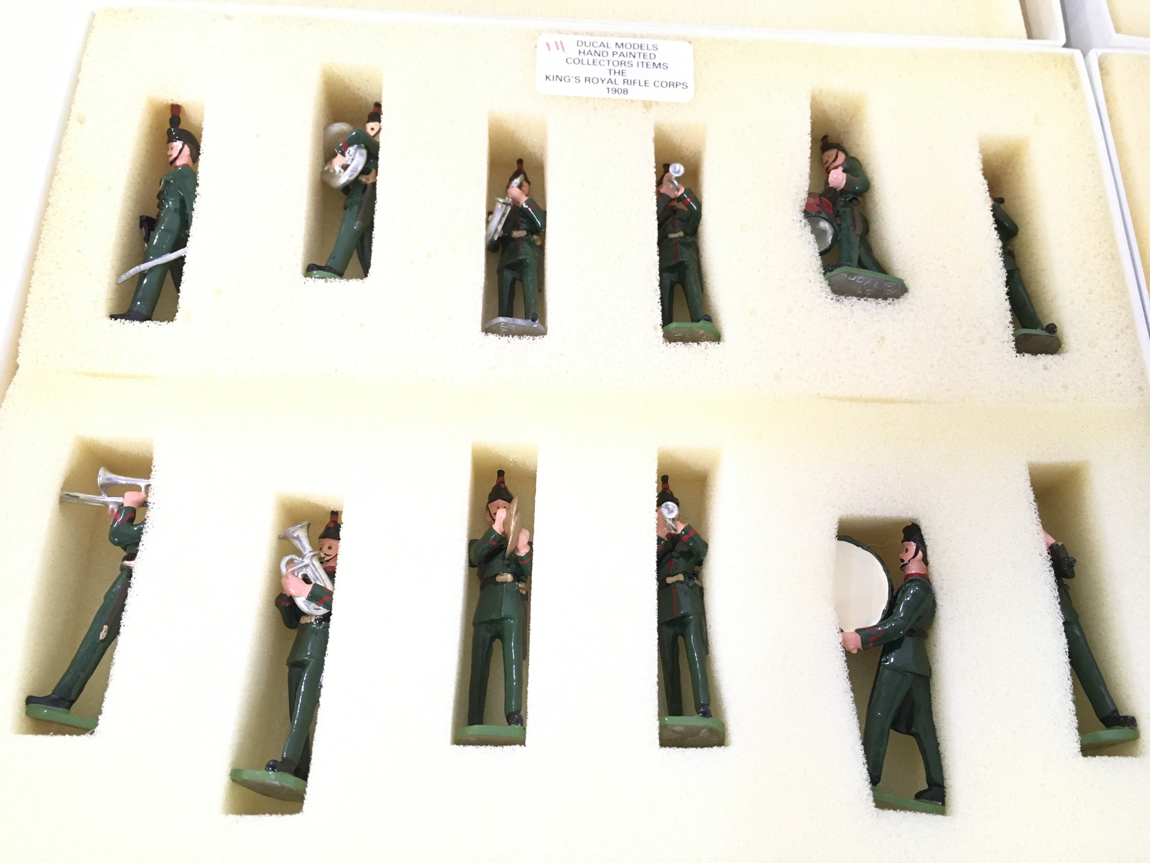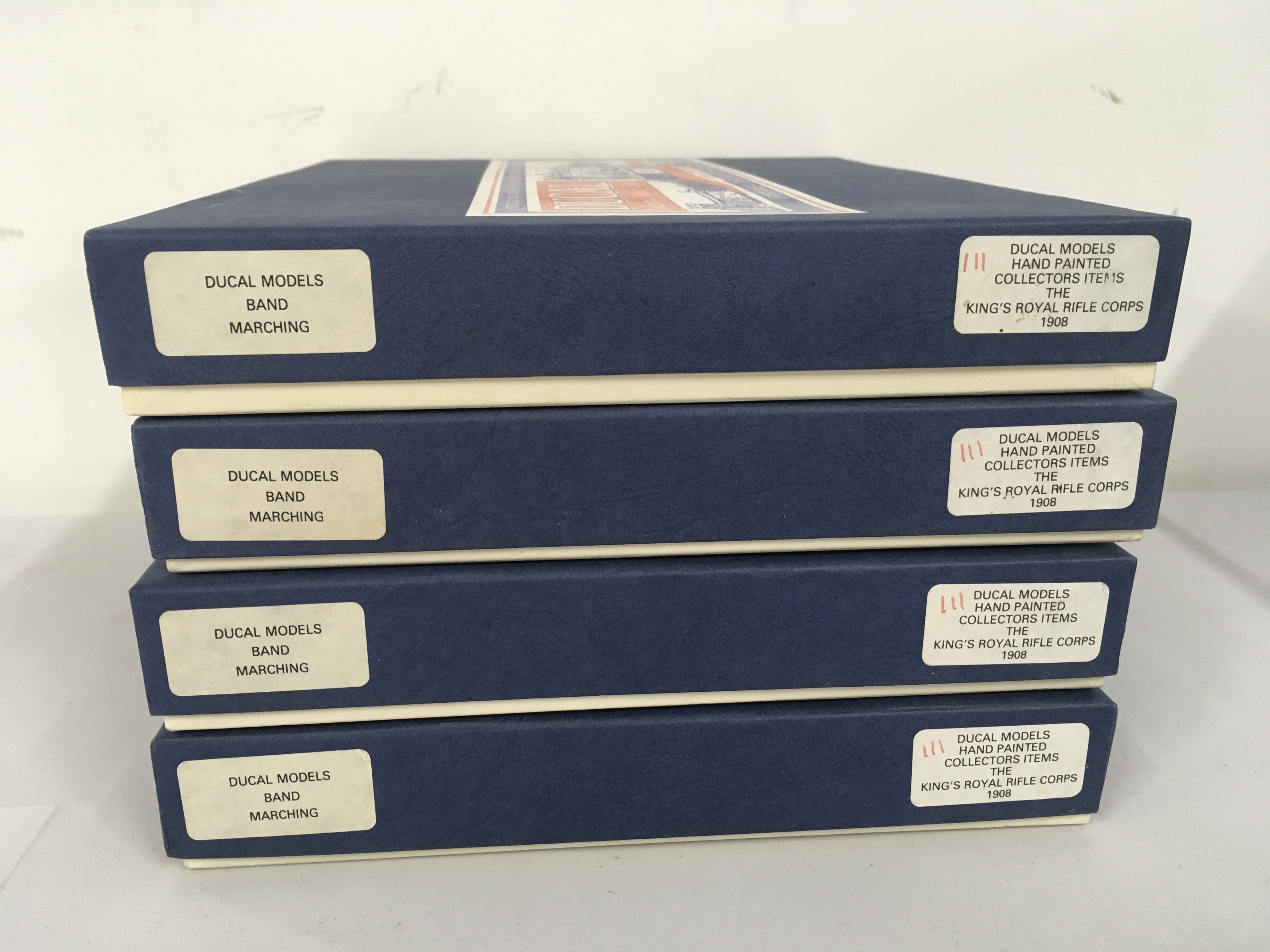 4 boxed Ducal metal military Minature figure sets features the marching band of The Kings Royal Rifle Corps 1908. No reserve