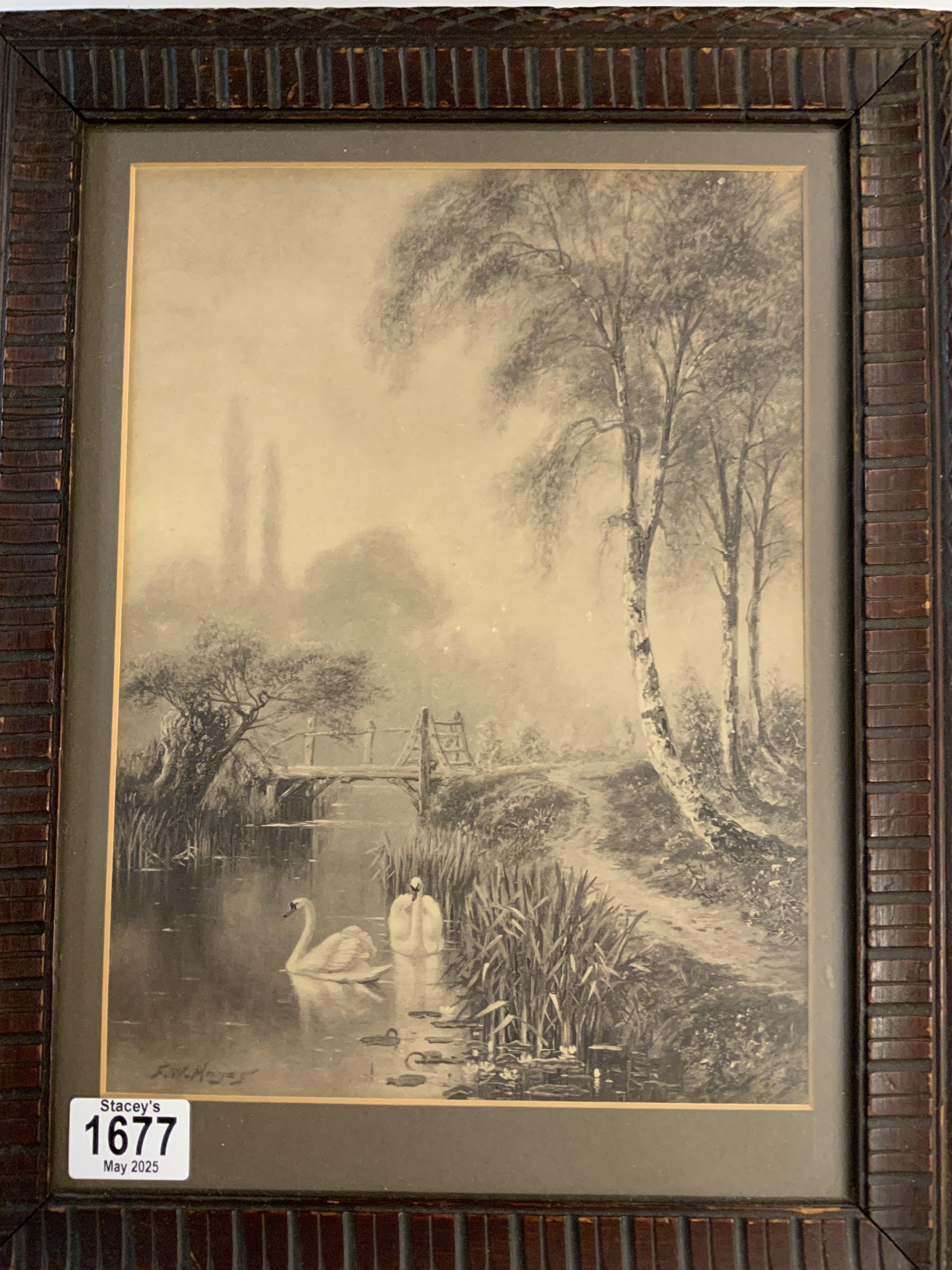 Frederick William HAYES, monochrome watercolour painting of a pair of swans on a river. 42cm x 32.5cm. NO RESERVE