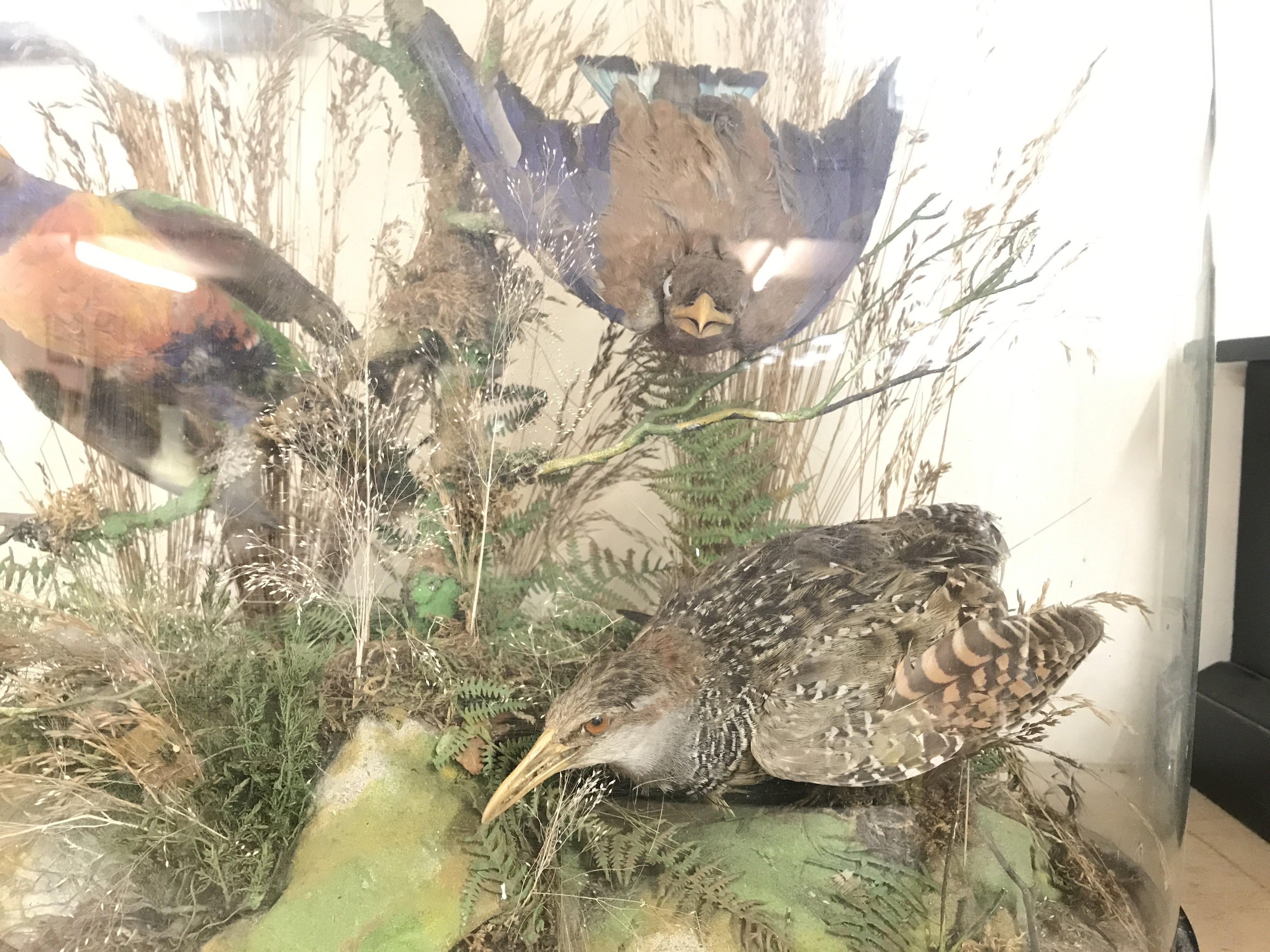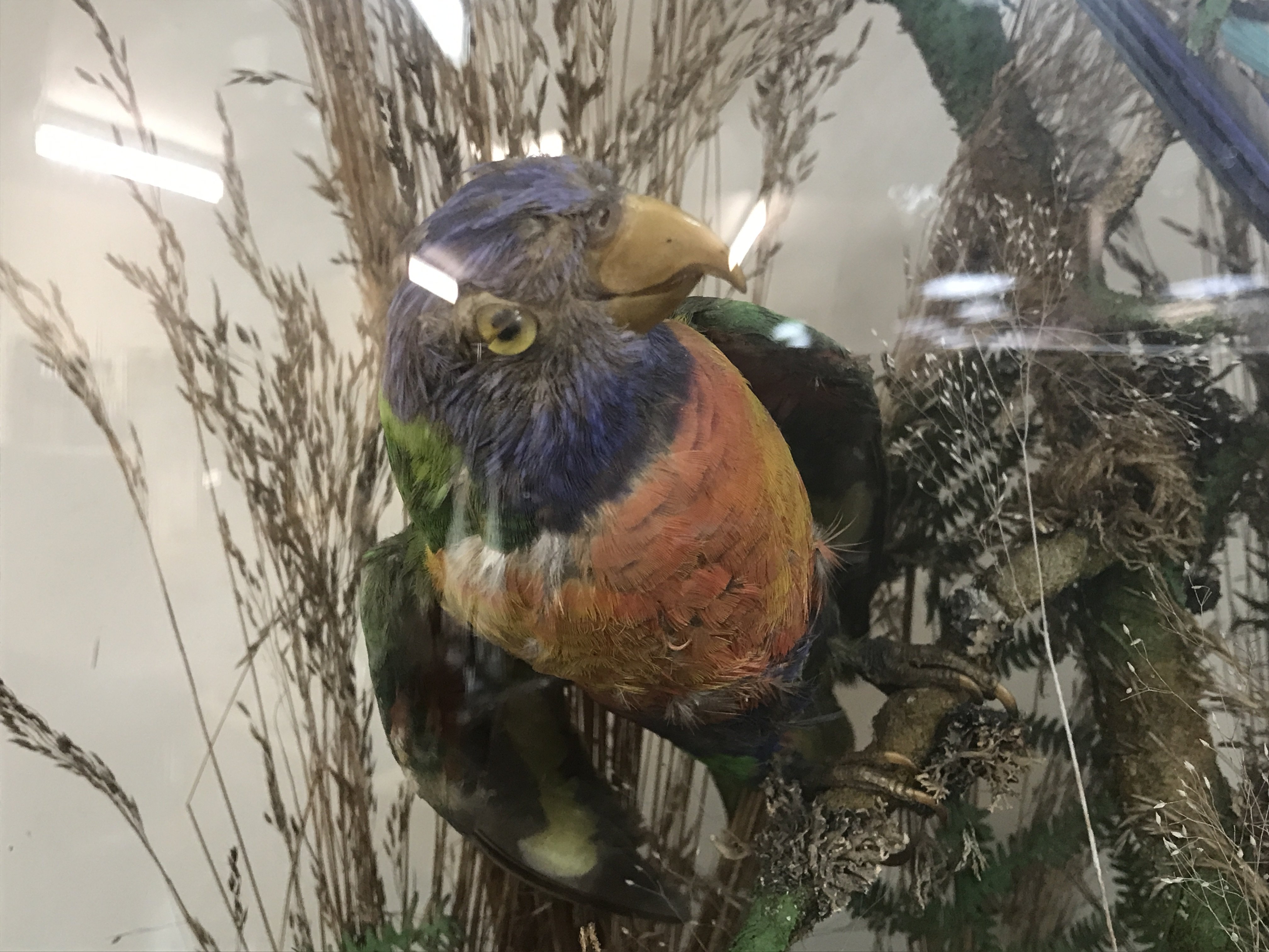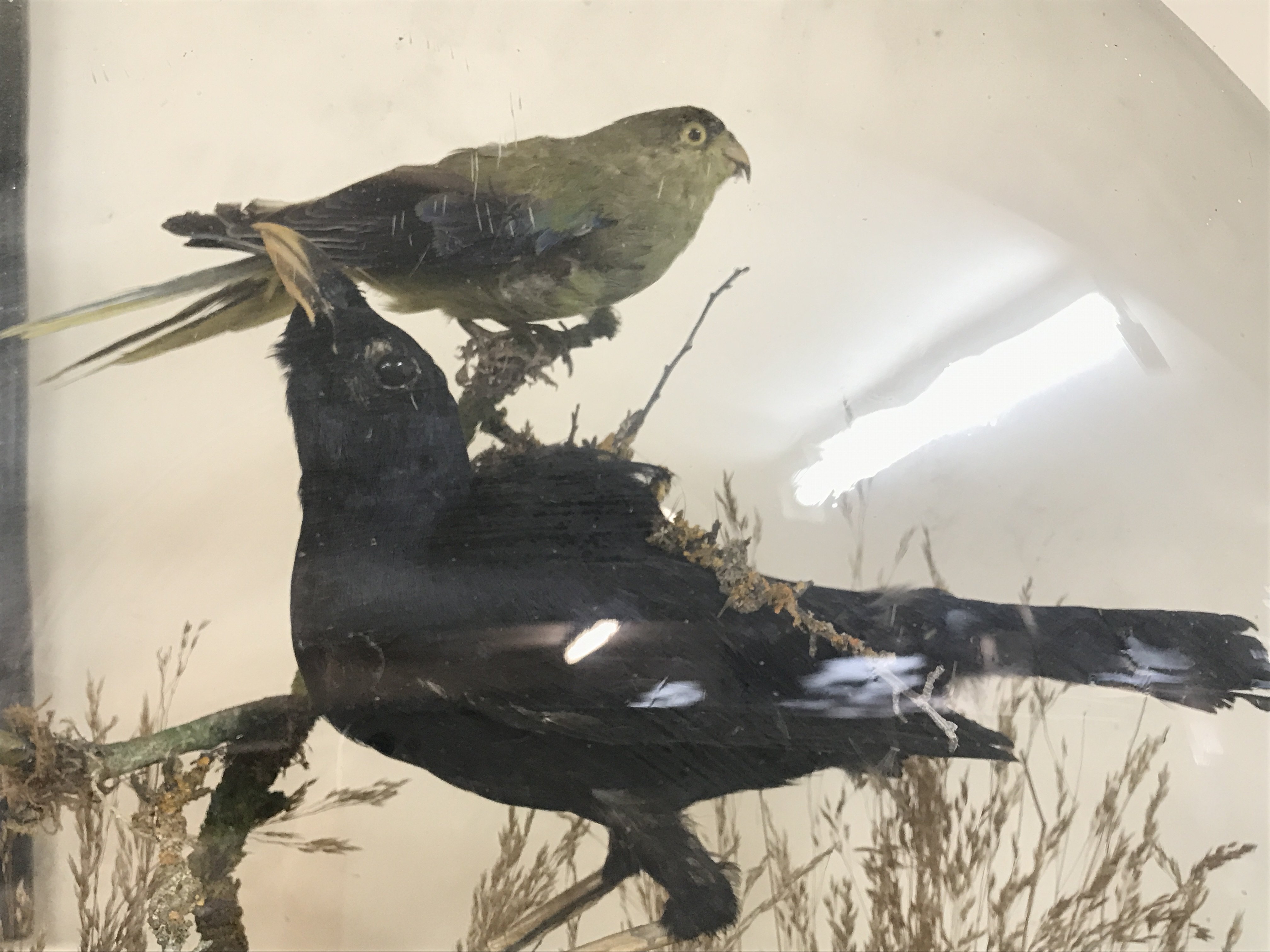 A case containing parrots and birds under a glass dome including a Rainbow Iorikeet , Common Cuckoo, Buff banded Rail etc. 66cm tall. This lot cannot be posted