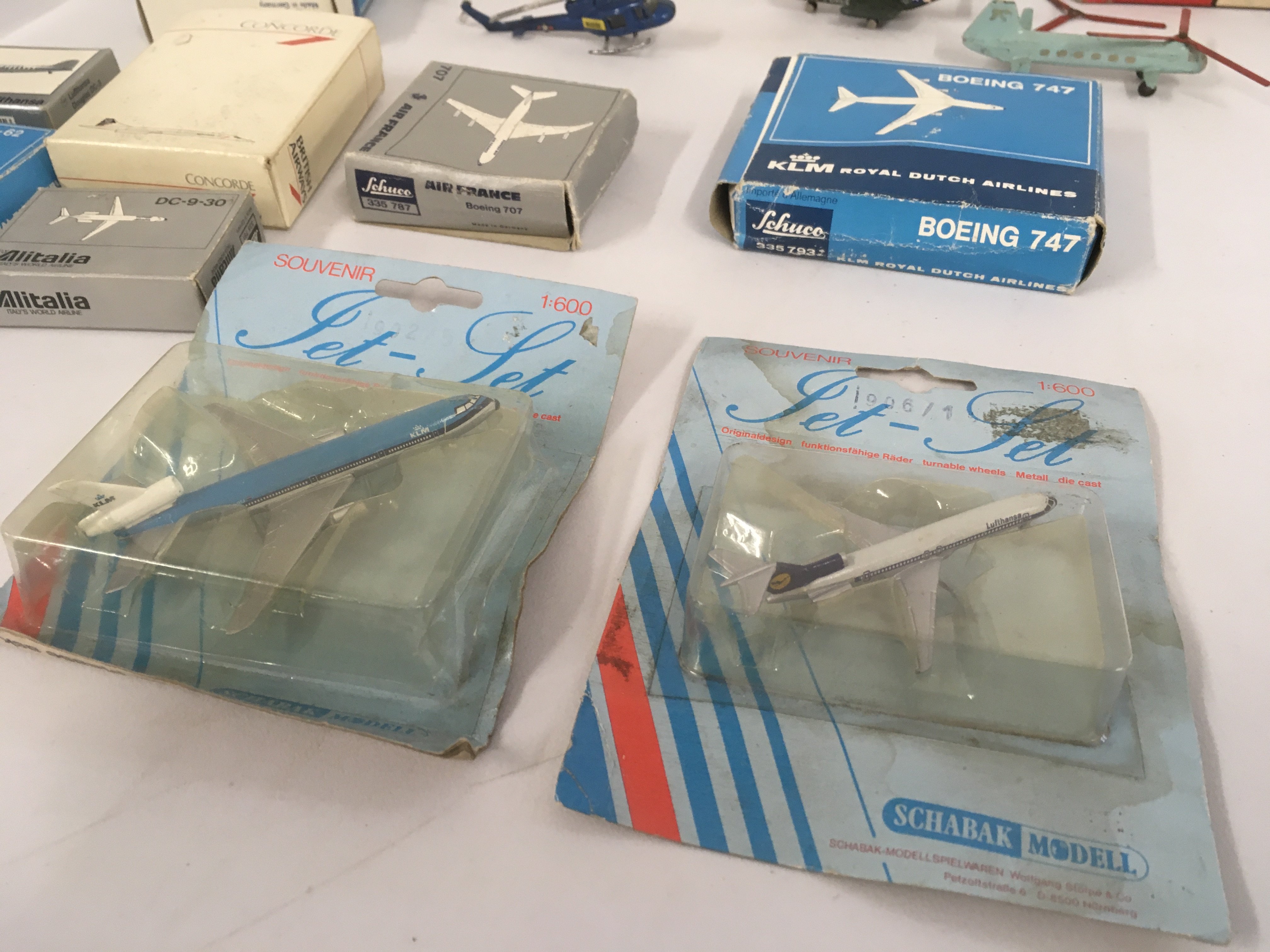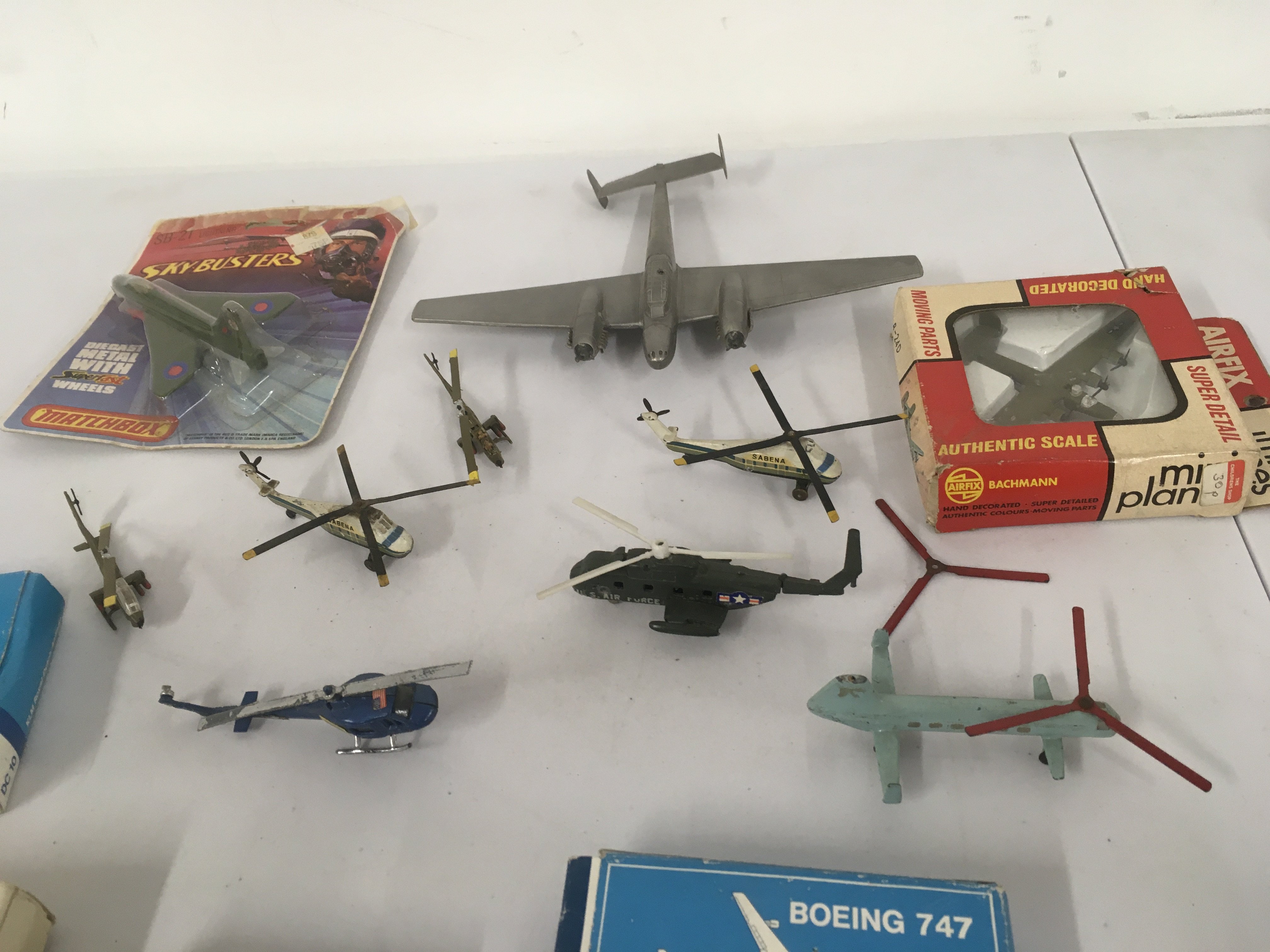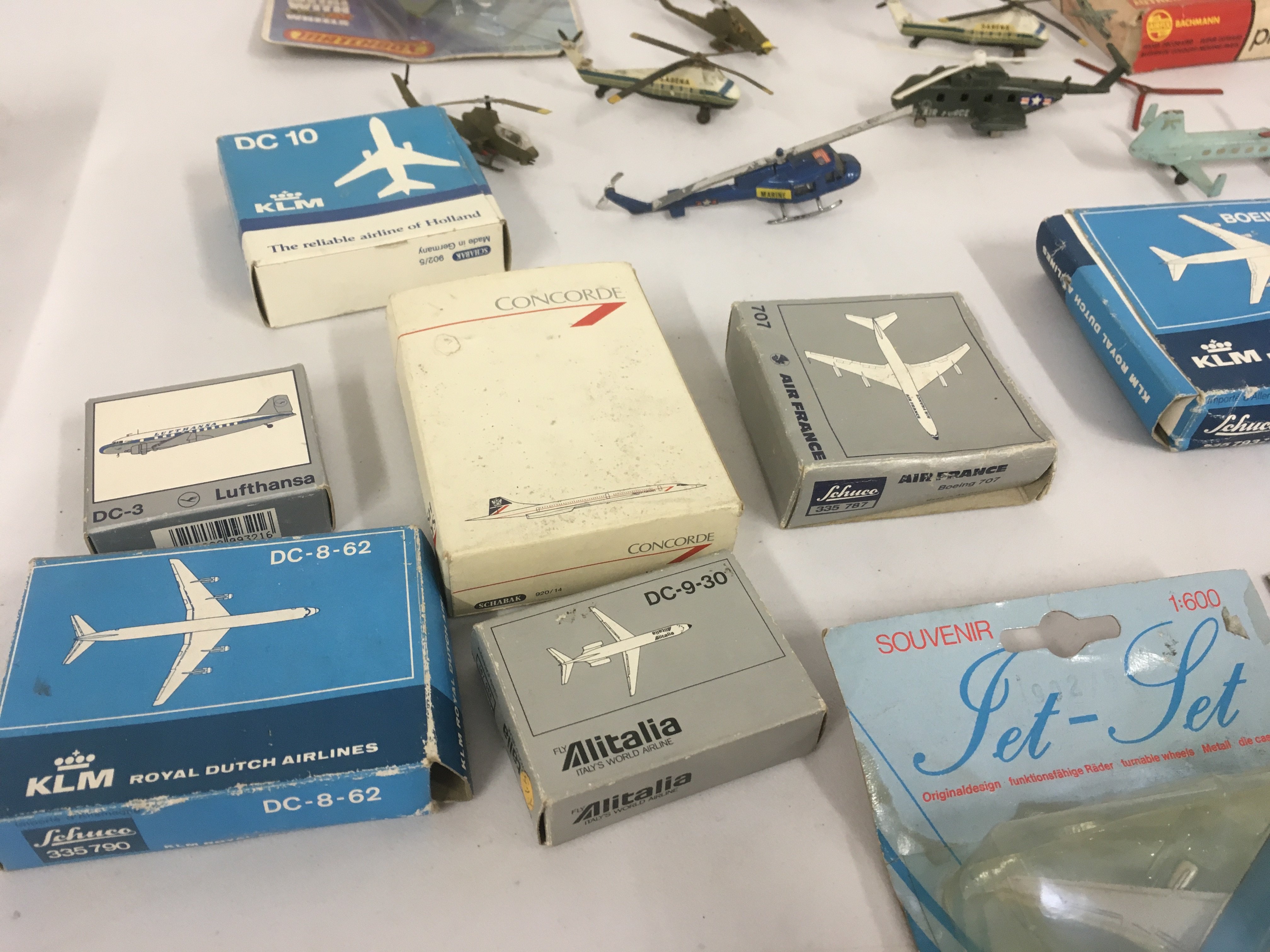A mixed collection of diecast..plastic aeroplanes and helicopters by various manufacturers some used a promotional items. Some need repair. Many in original packaging. No reserve.