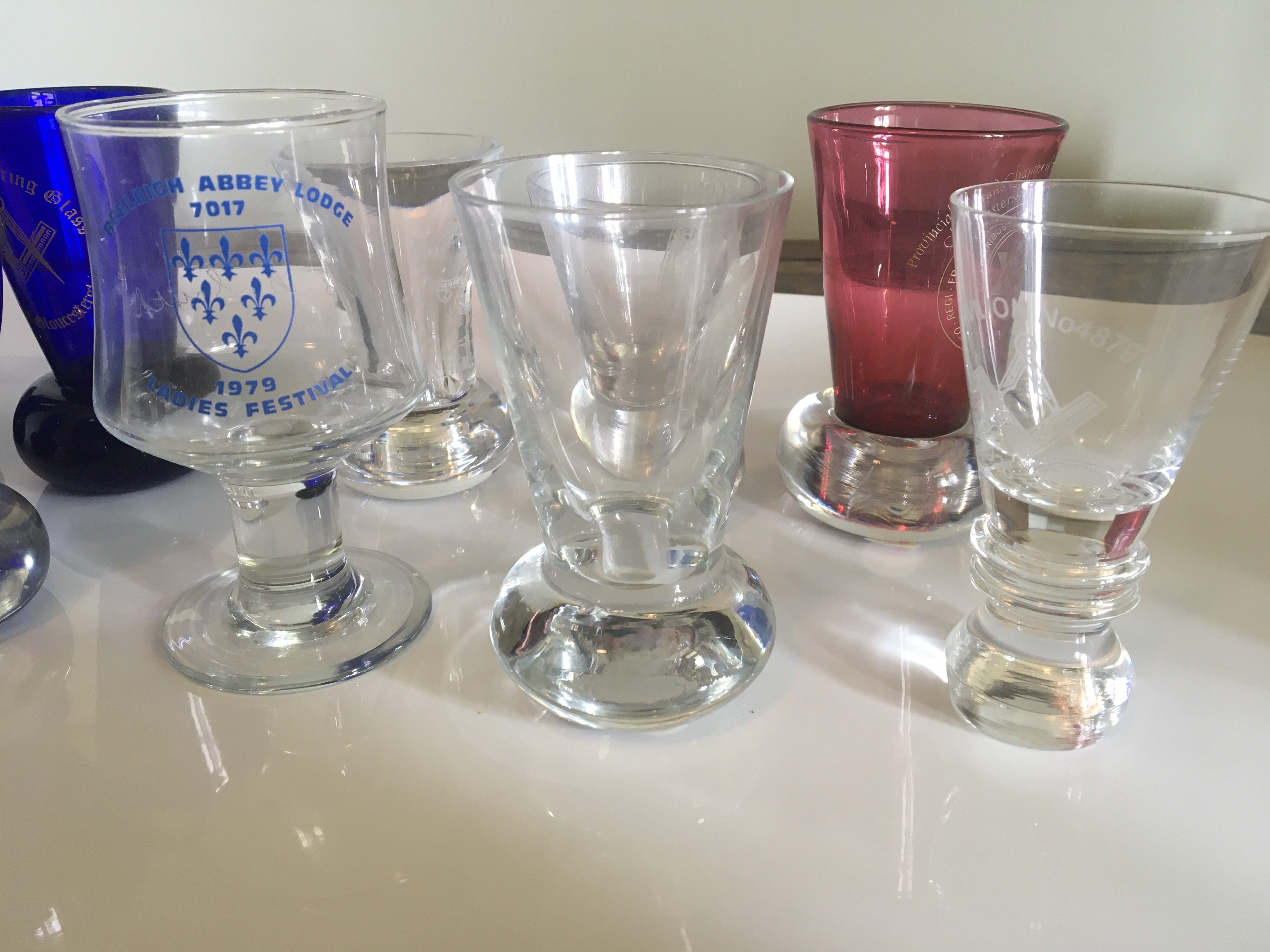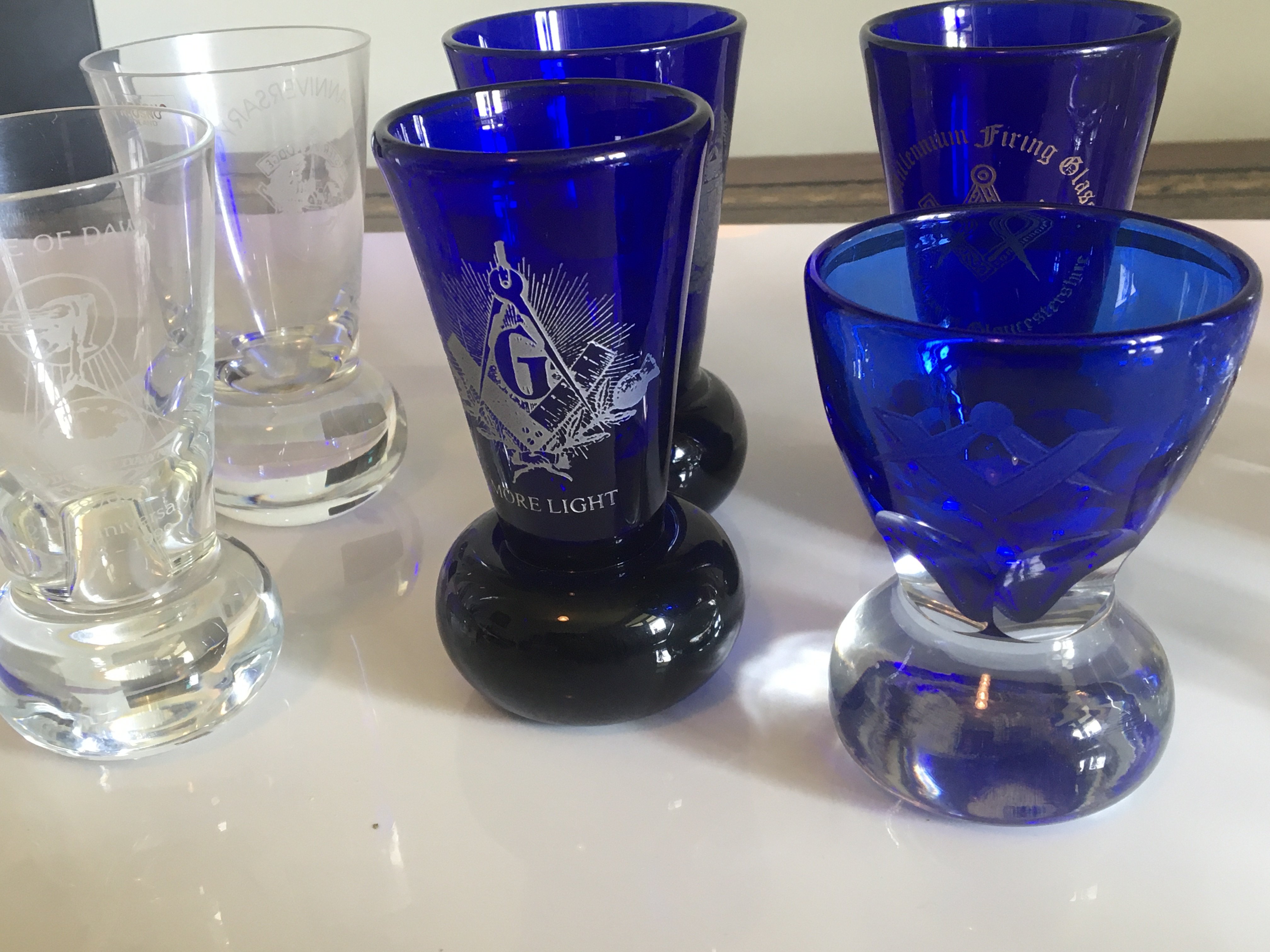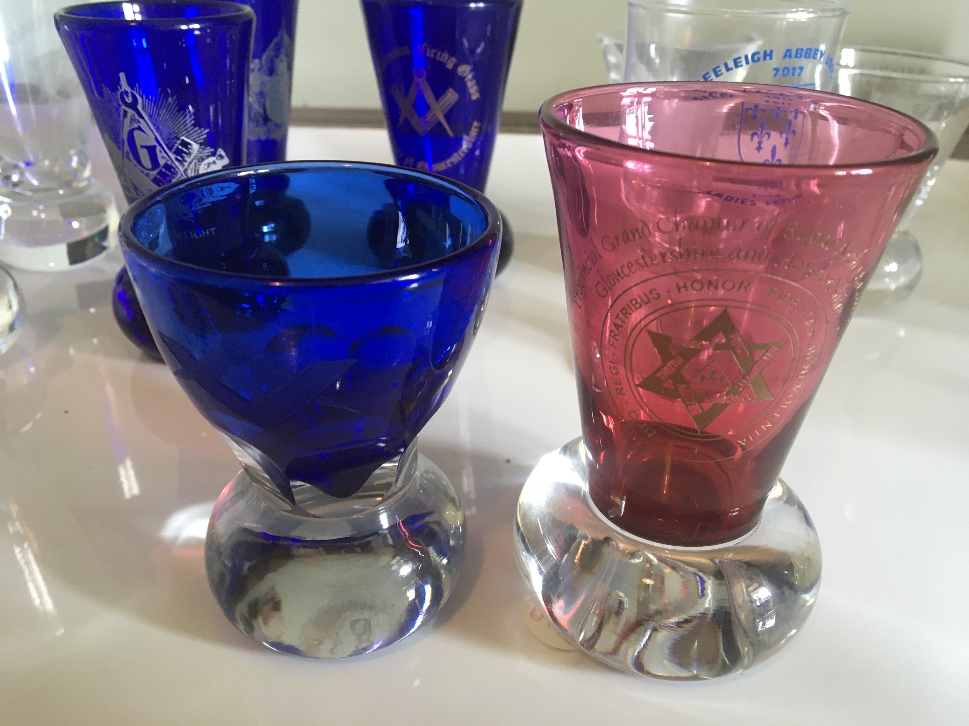 A collection of Masonic shot glasses including Bristol blue shot glasses and a cranberry glass (12)