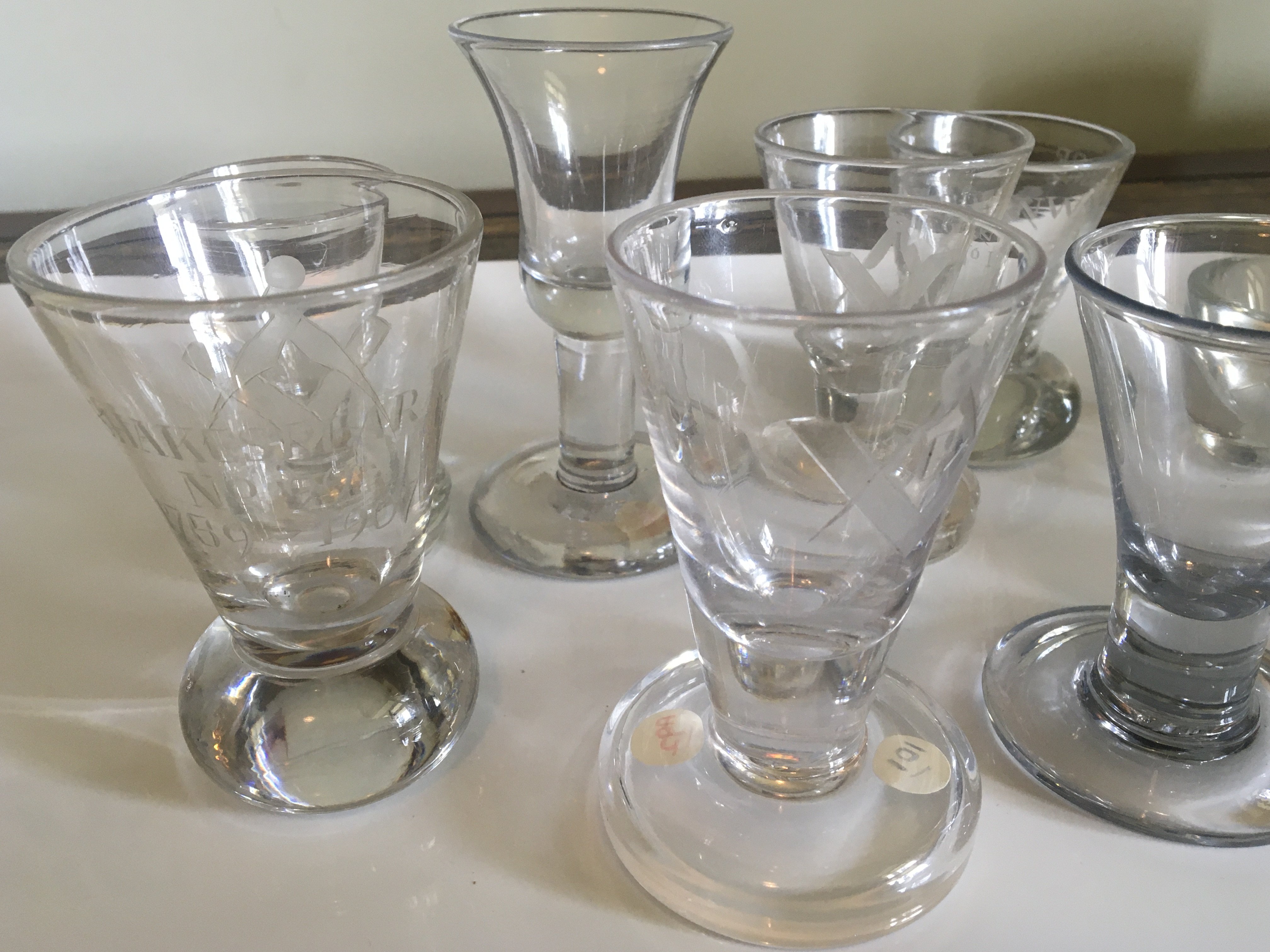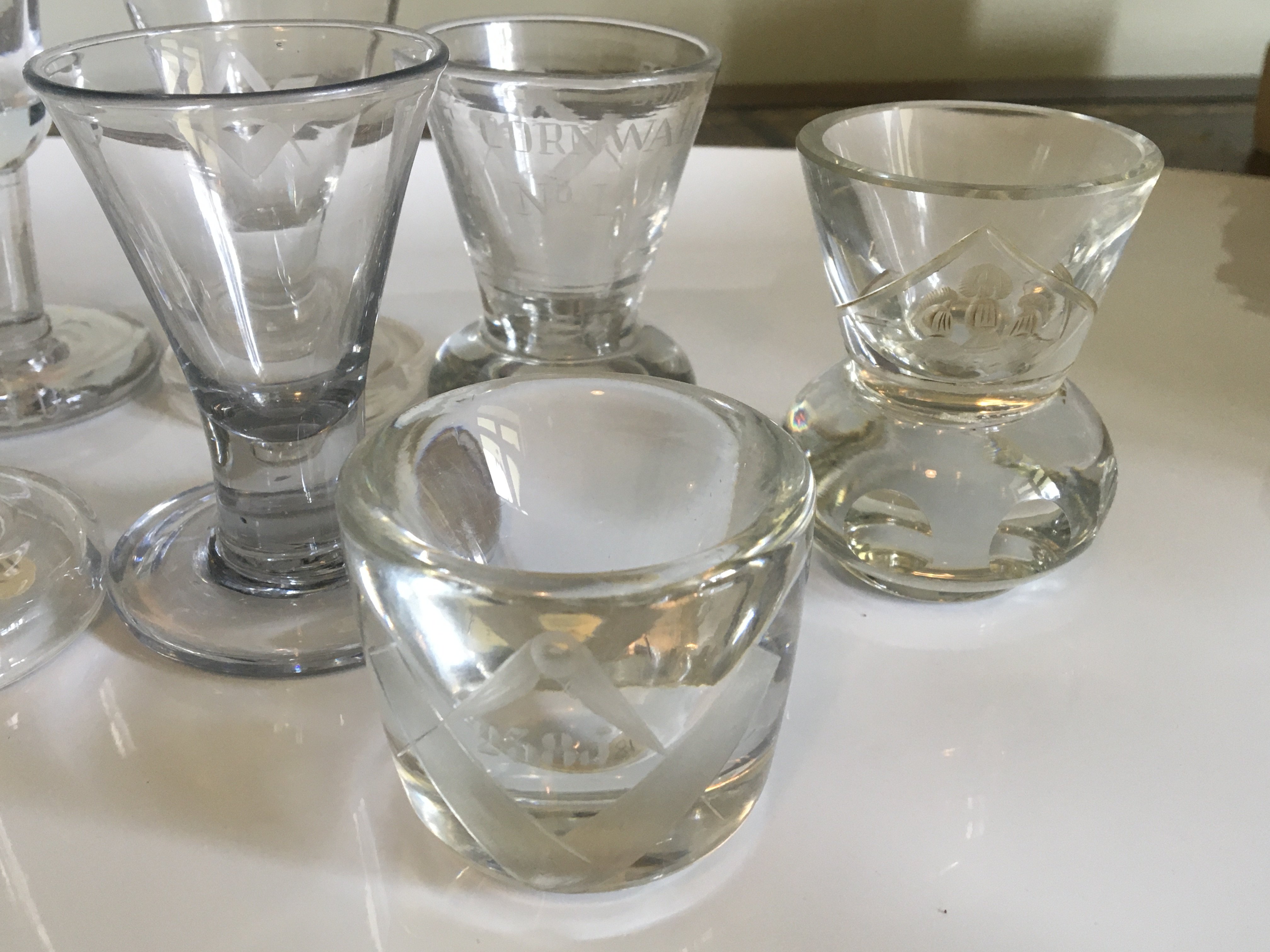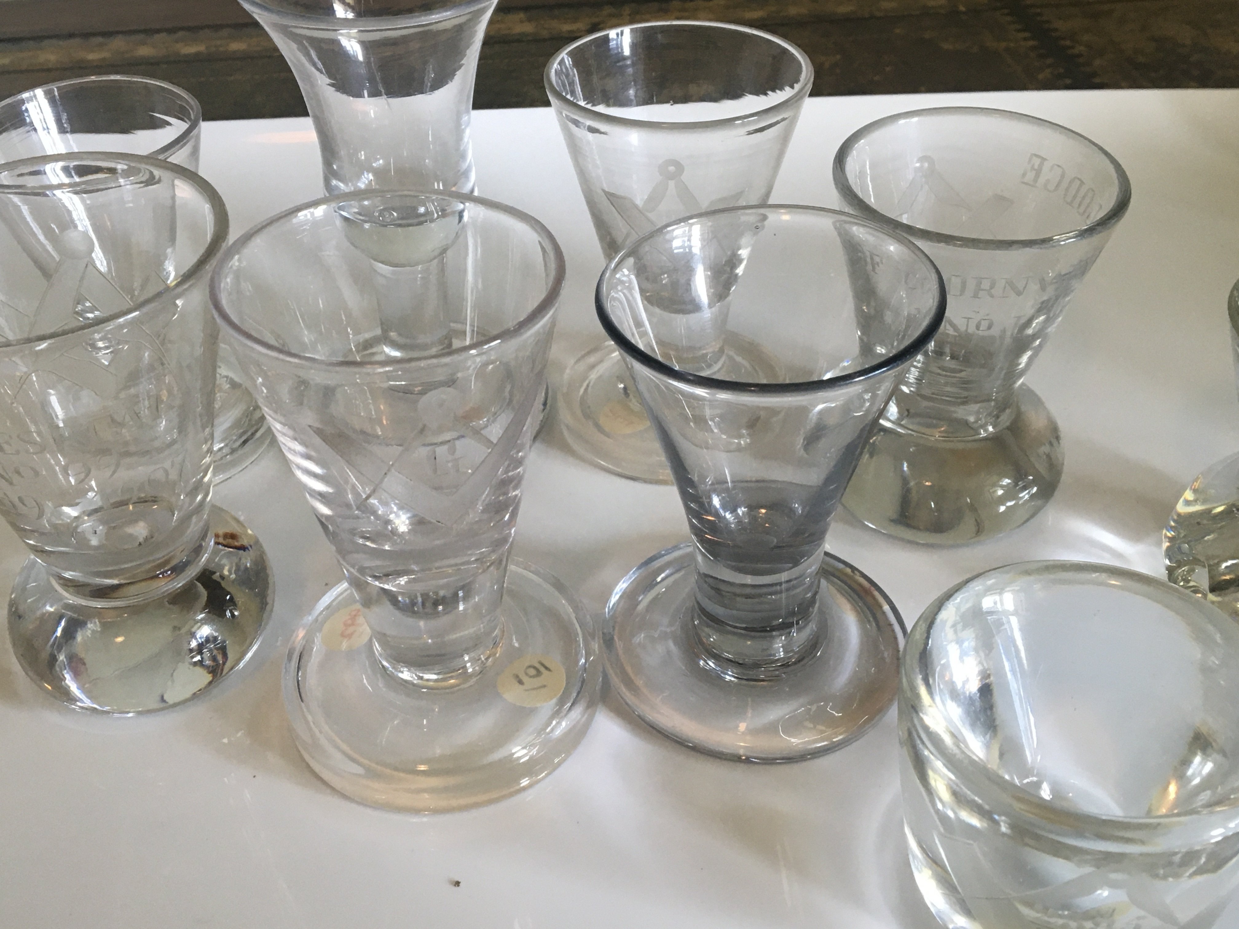 A collection of 19th century and later Masonic shot glasses including The Shakespear Lodge 1759-1907 Duke of Cornwell Lodge a d others (9)