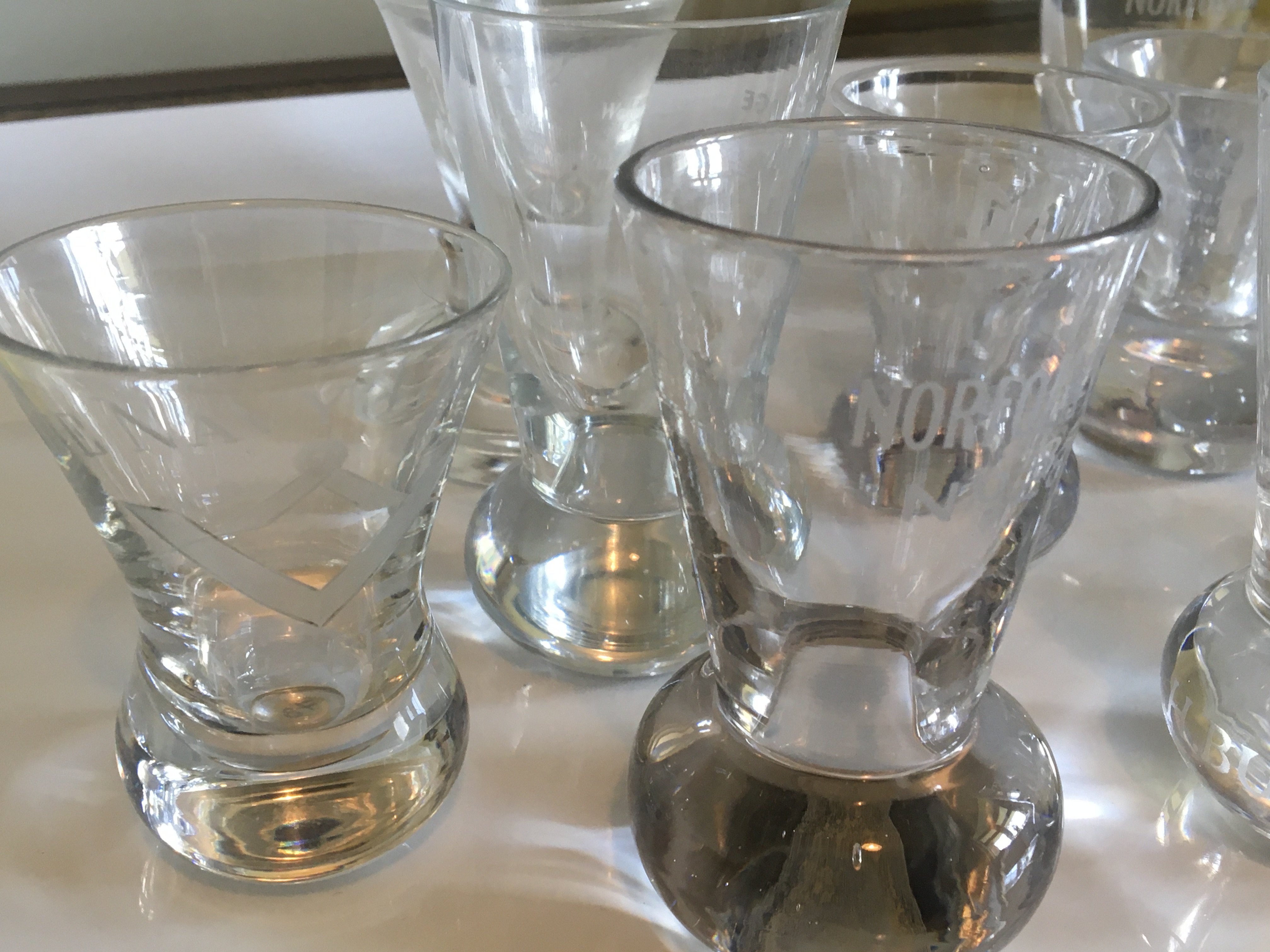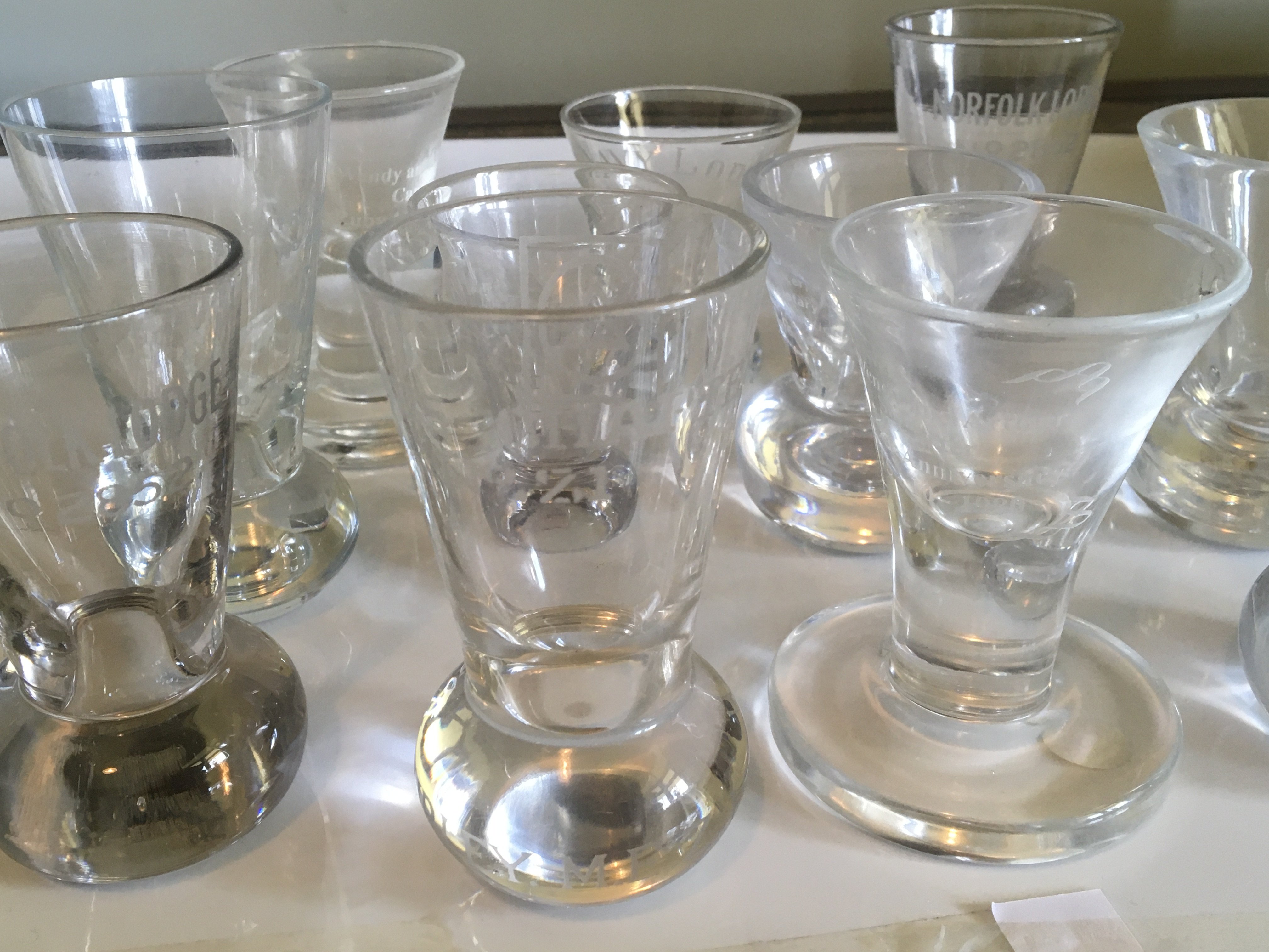 A collection of Masonic shot firing glasses. Including etched examples Two Norfolk lodge Cyrus Chapter Navy lodge and others 19th century and later.