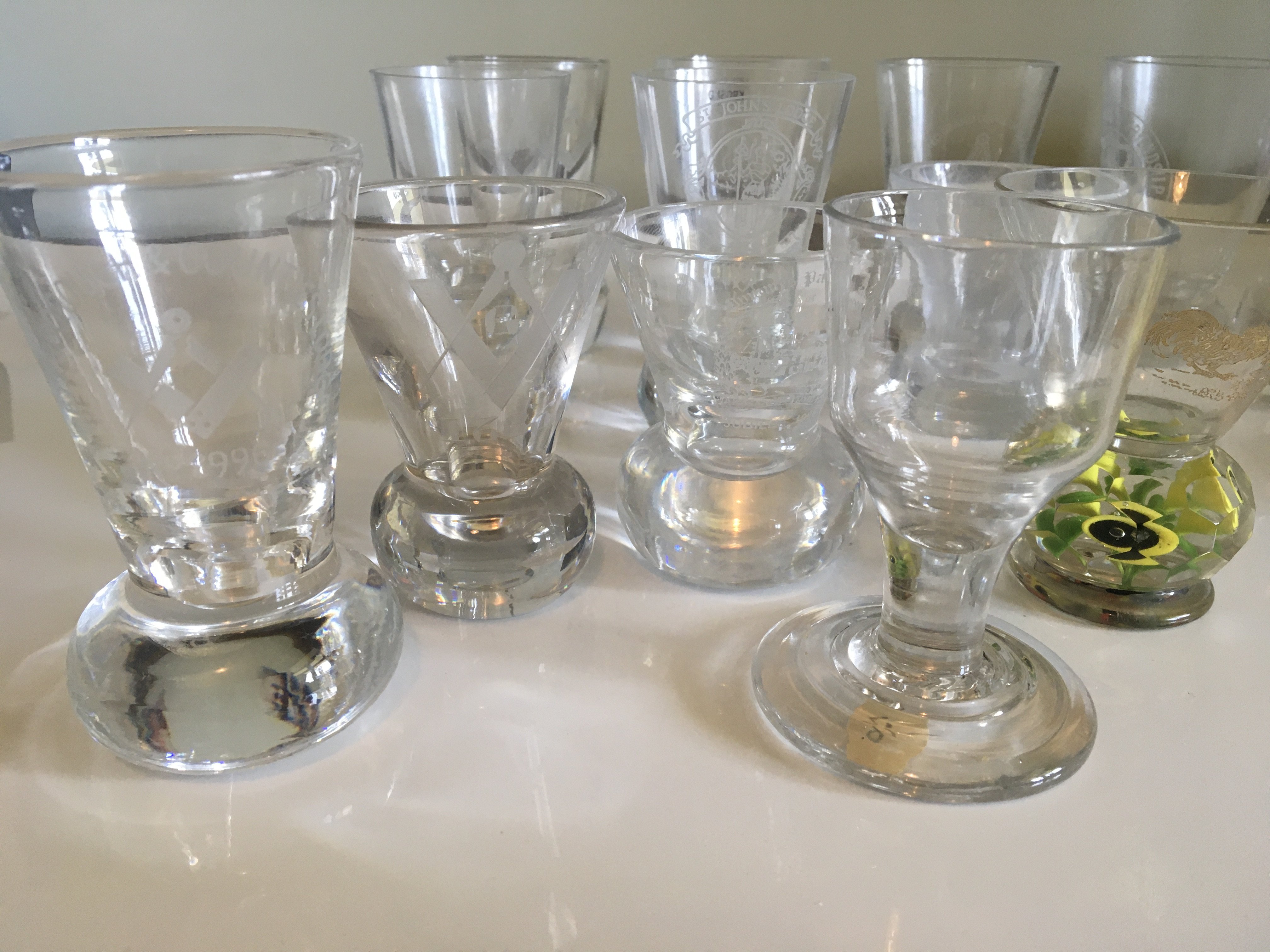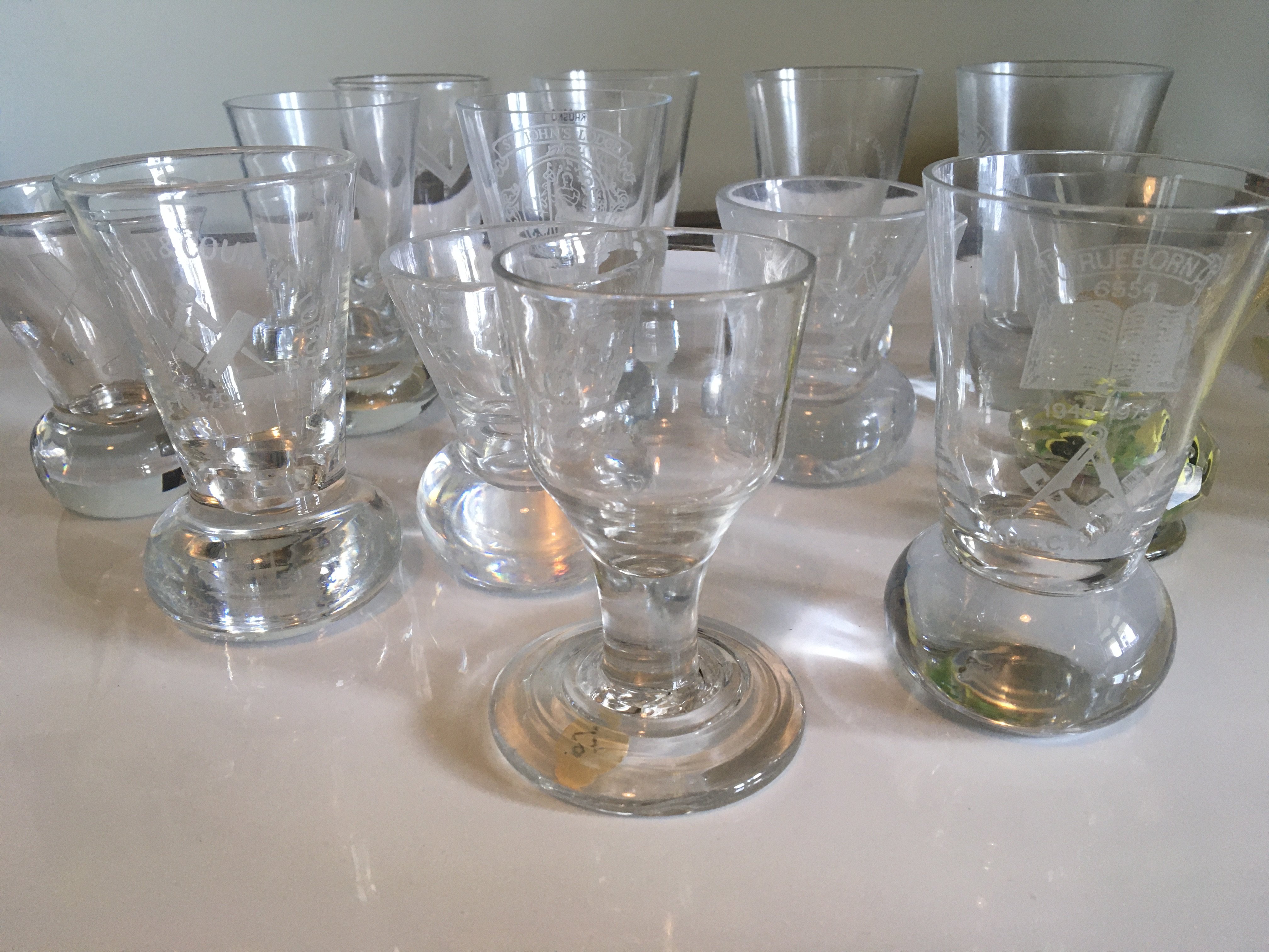 A collection of Masonic and other Shot and firing glasses toast masters glasses and others including a late 18th century glass others of later date one with a Millefiori base (13)